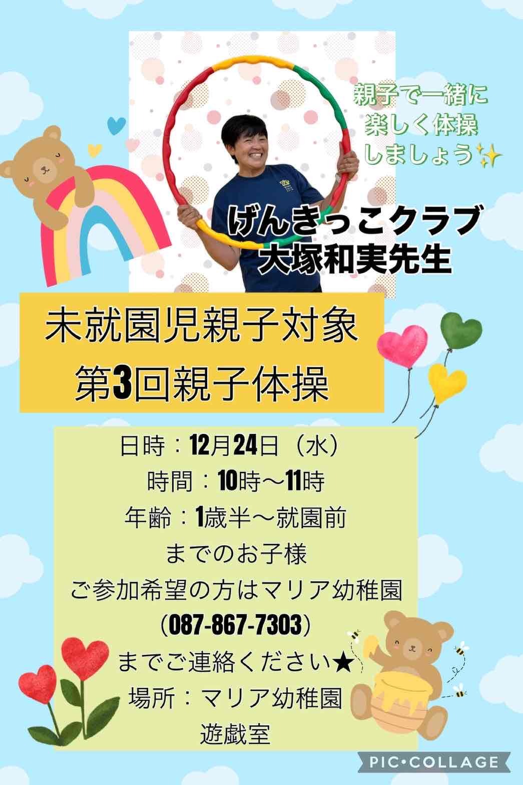マリアっこひろば、親子体操のお知らせ 2025年12月24日(水) 本日、雨天のためマリアっこひろばはお休みです。 10:00~未就園児対象親子体操を行います。 一緒に楽しく体操しませんか? 当日参加も大丈夫です。お待ちしております。