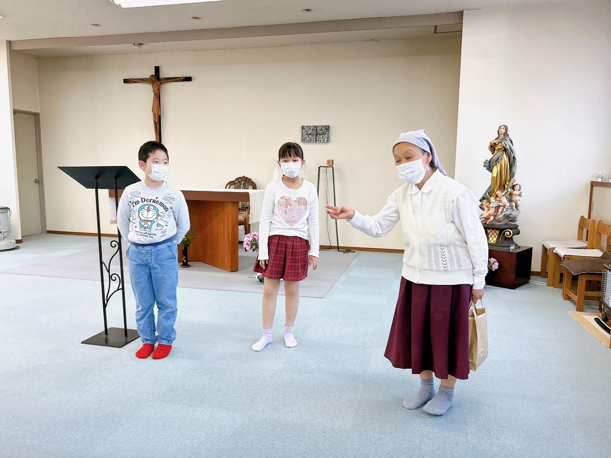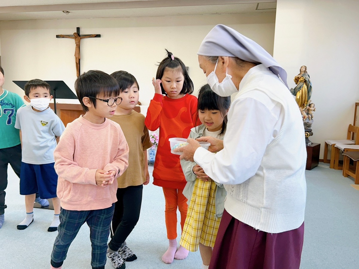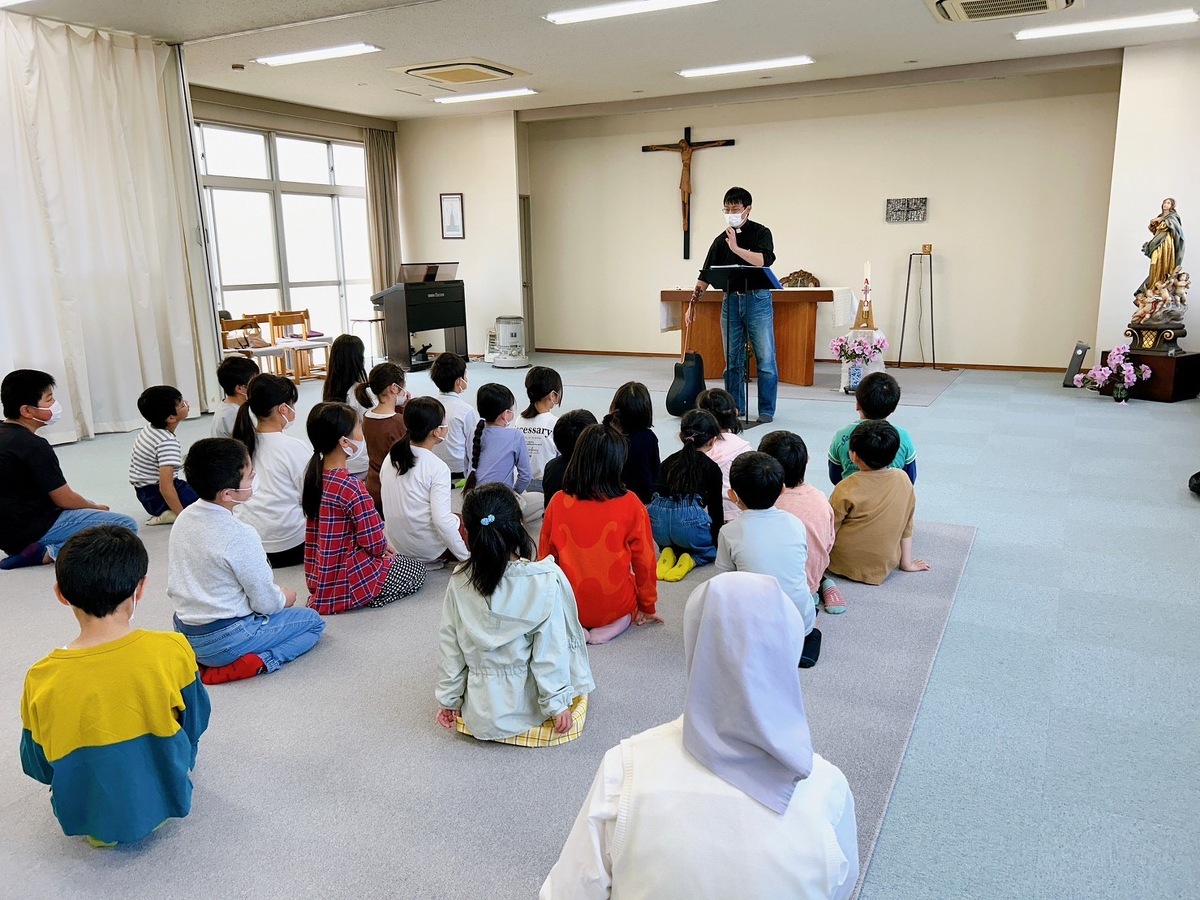 今年度のマリアの子ども会が始まりました。 2023年04月24日(月) 今年度のマリアの子ども会が始まりました。今年も新一年生がたくさん入ってくれ、子ども会のお兄さん、お姉さんが新一年生のために心を込めて作ってくださったロザリオをいただきました。 神父様のお話を聞いたり、みんなで幼稚園の近くまでお散歩に行きました。 今年度も楽しく過ごしましょうね!