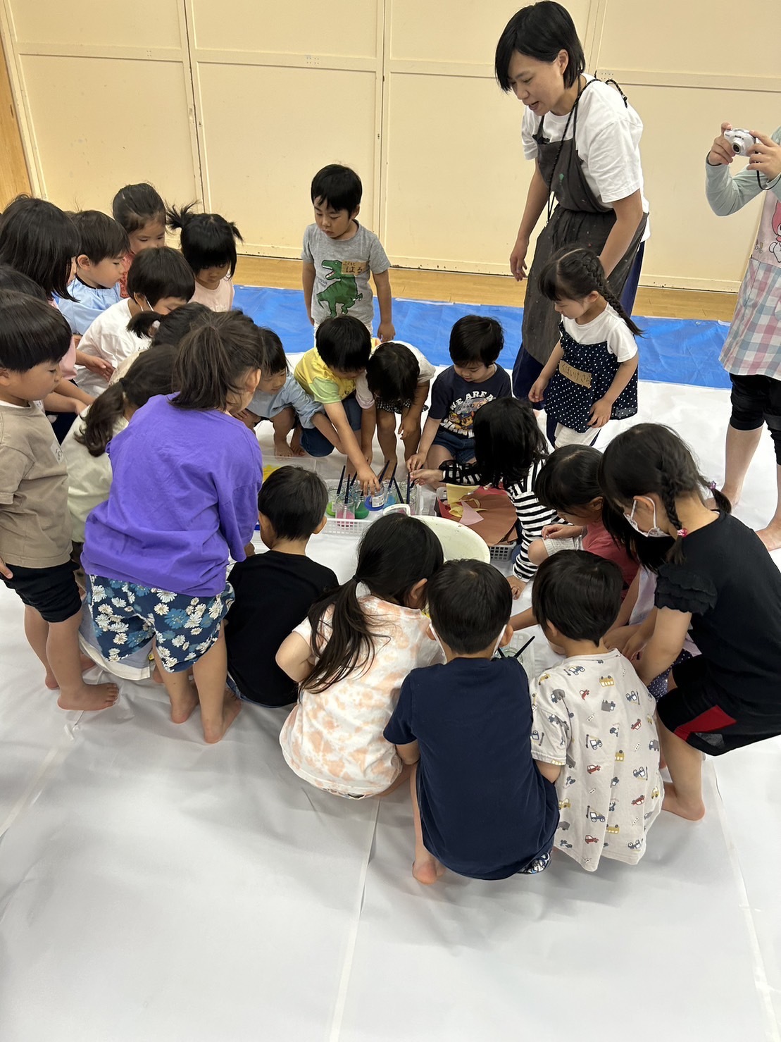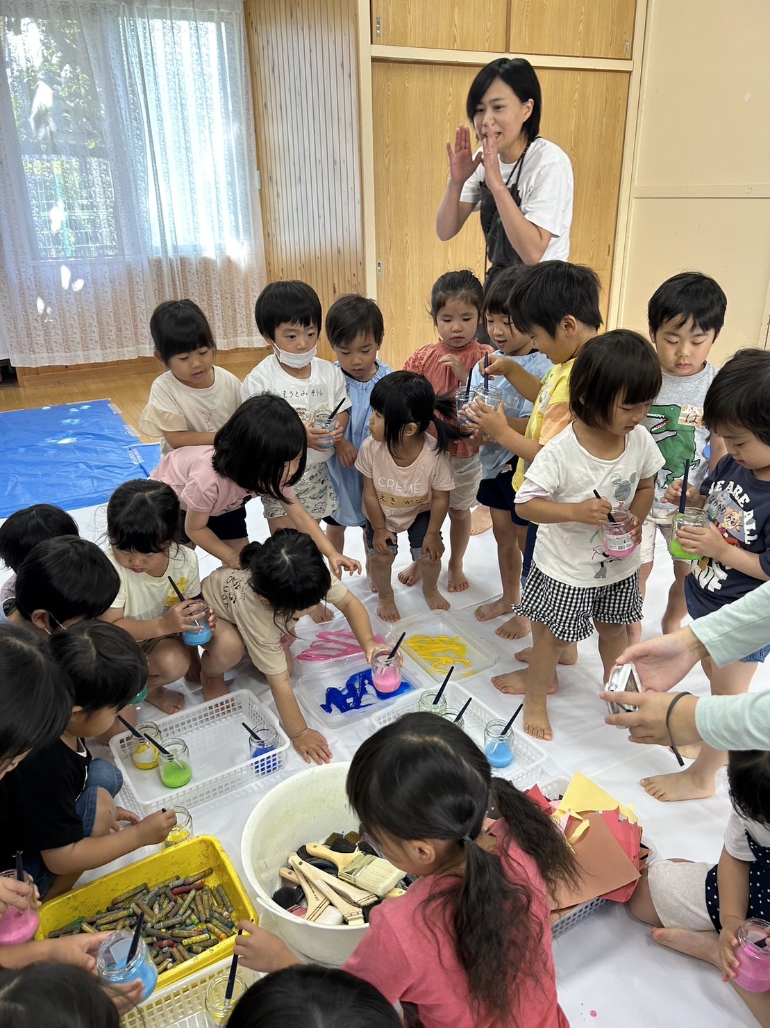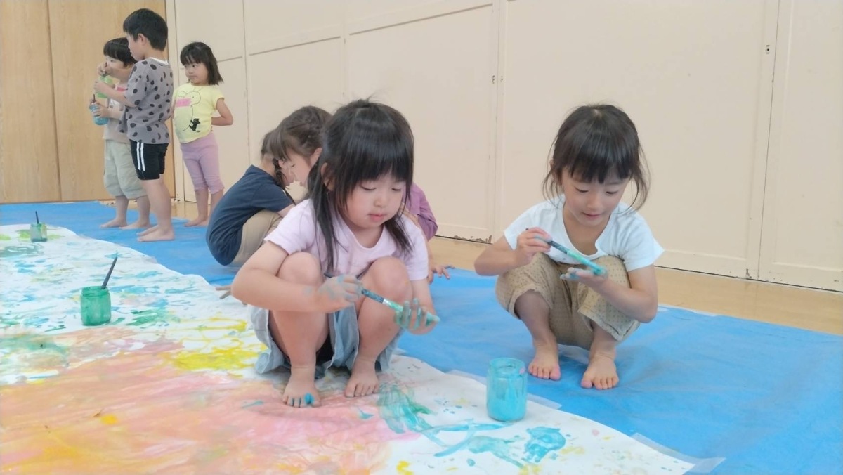 4歳児(Bグループ)のアートの日が始まりました。 2023年05月12日(金) 4歳児(Bグループ)のアートの日が始まりました。ピアノの音に合わせて身体いっぱいを使って、絵の具遊びを楽しんだ子どもたち。思い思いの色を選んで素敵な絵がたくさんできました!「楽しかった〜!またやりたいね!」と大満足の表情が見られました。後藤先生、1年間よろしくお願いします!