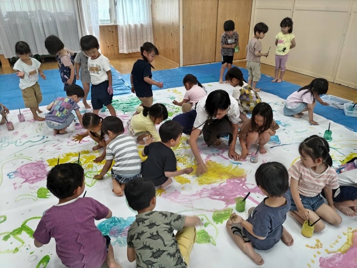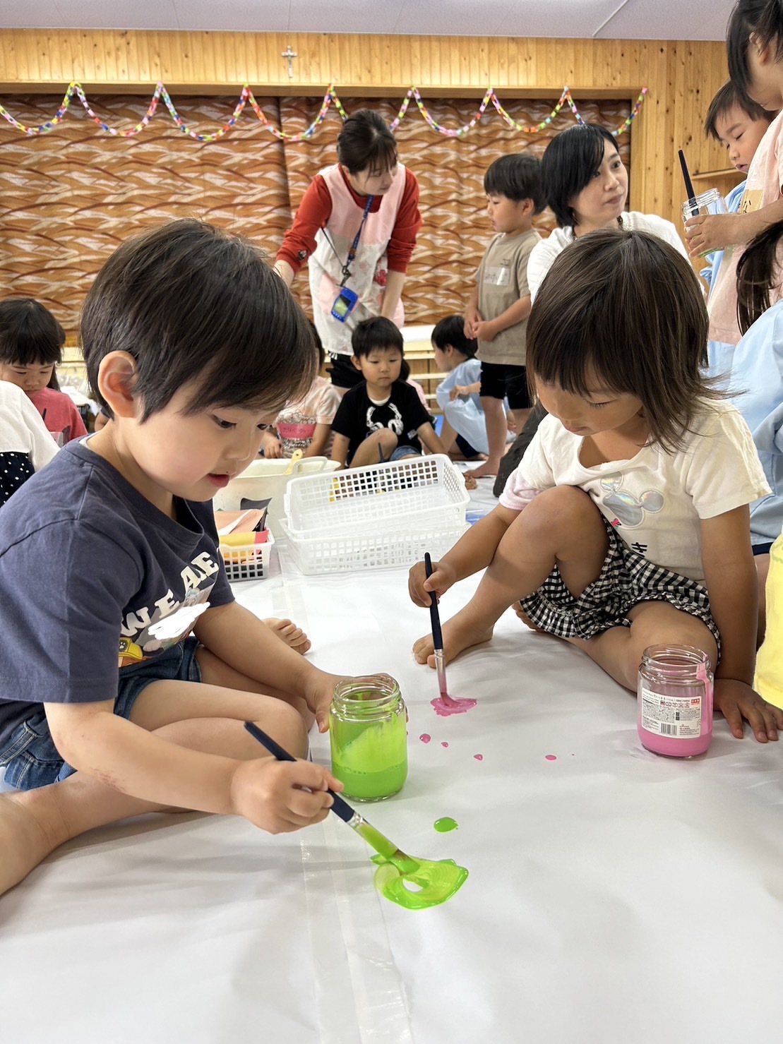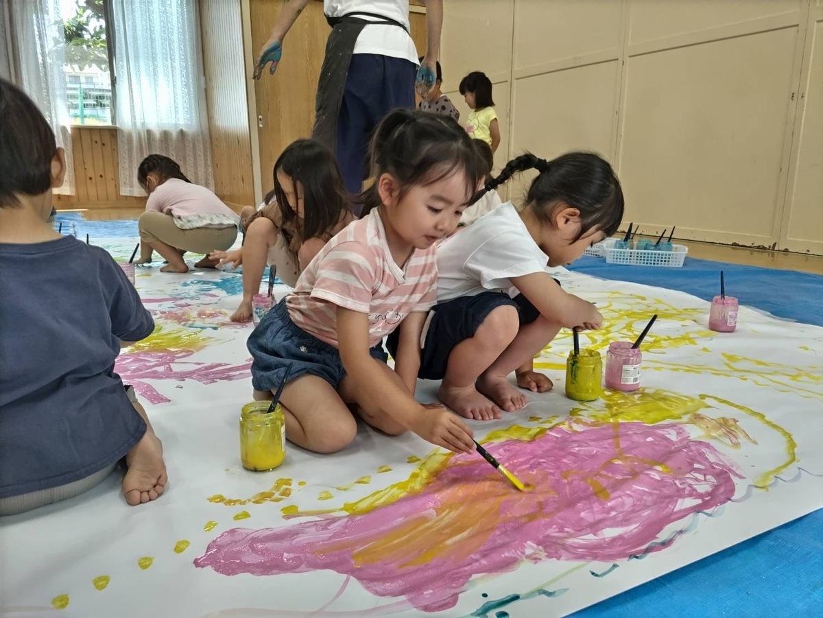 4歳児(Bグループ)のアートの日が始まりました。 2023年05月12日(金) 4歳児(Bグループ)のアートの日が始まりました。ピアノの音に合わせて身体いっぱいを使って、絵の具遊びを楽しんだ子どもたち。思い思いの色を選んで素敵な絵がたくさんできました!「楽しかった〜!またやりたいね!」と大満足の表情が見られました。後藤先生、1年間よろしくお願いします!