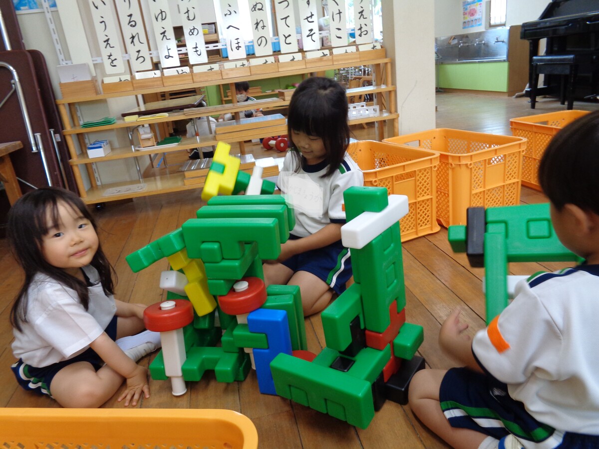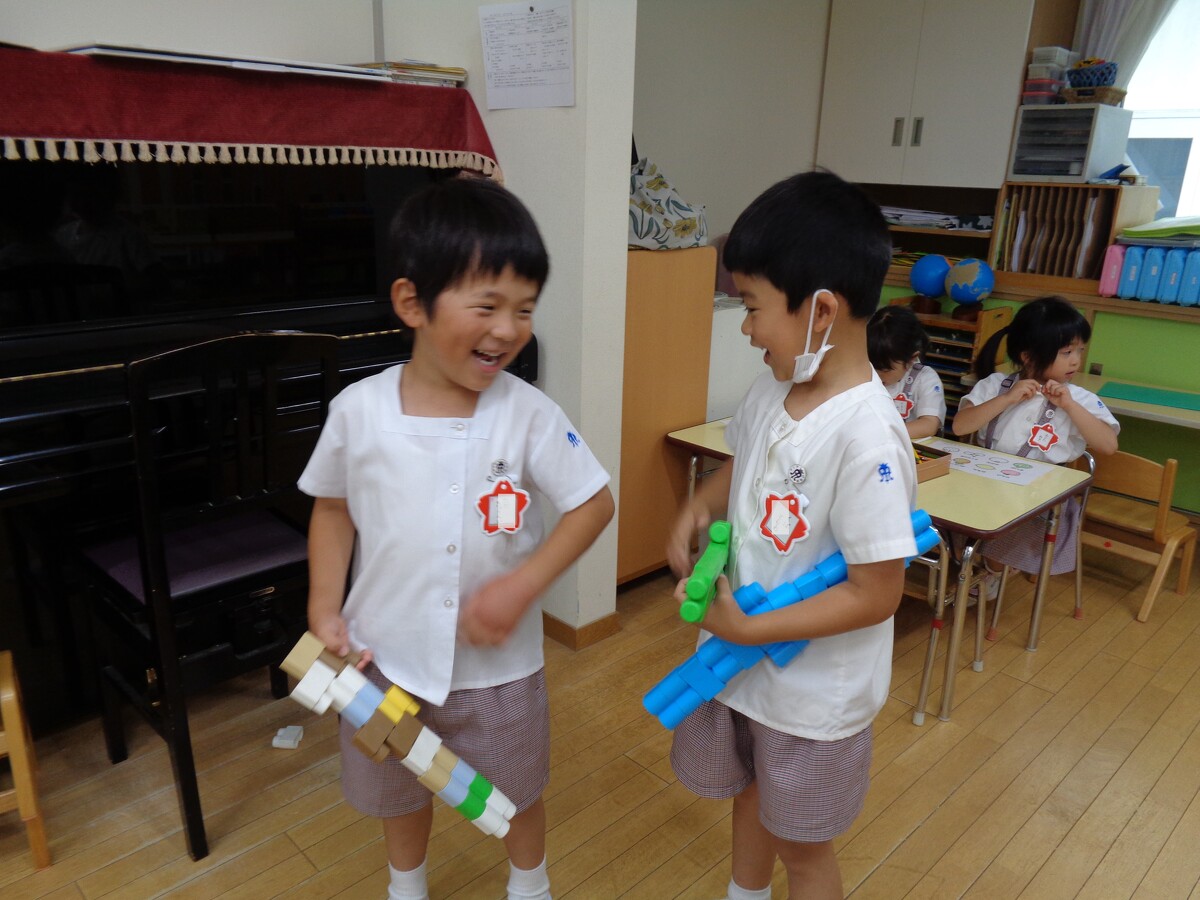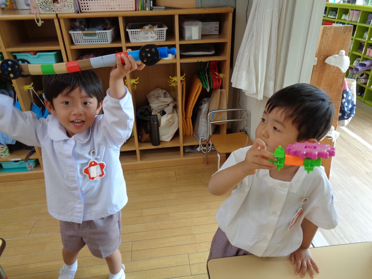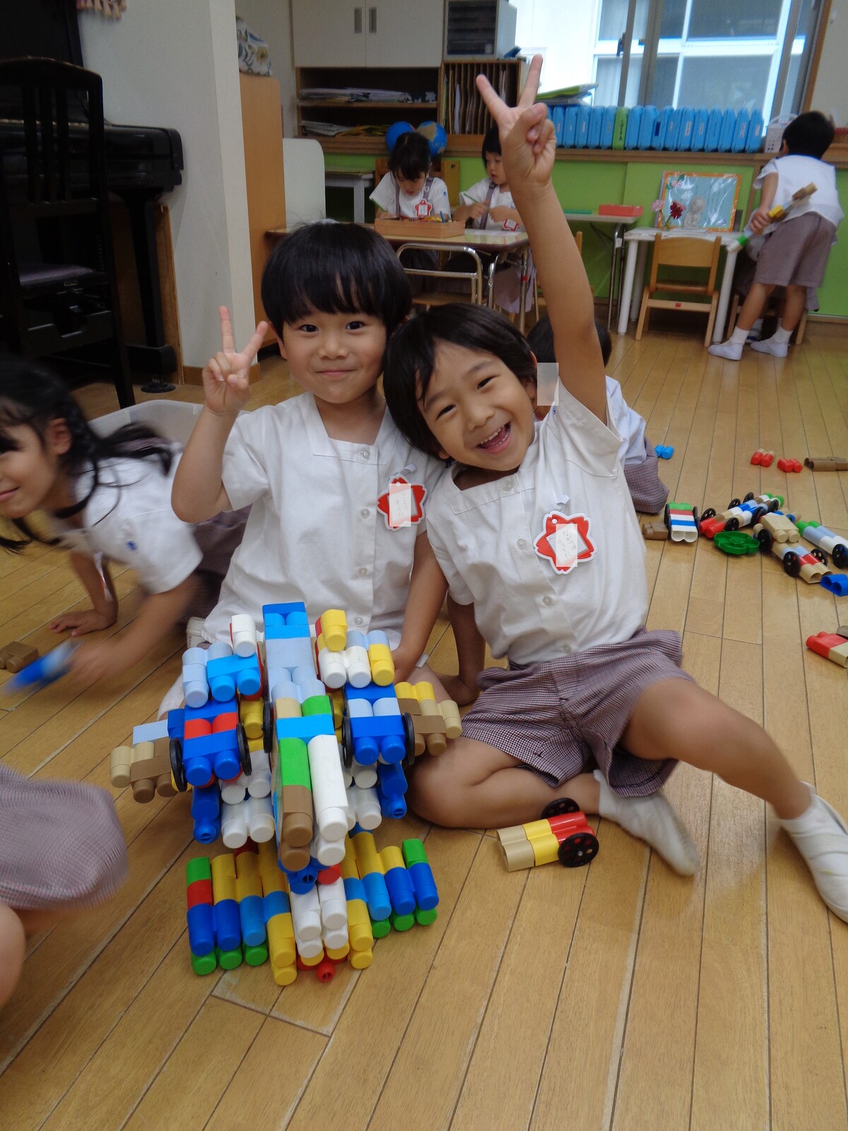 雨の日は室内遊びを楽しんでいます。 2023年05月31日(水) 雨の日は室内遊びを楽しんでいます。大きなブロックや小さいブロック、いろんなものを組み合わせて何ができるかな~?お家や車もできました!お友だちと一緒に元気に遊んでいますよ。明日はお天気になるといいな!