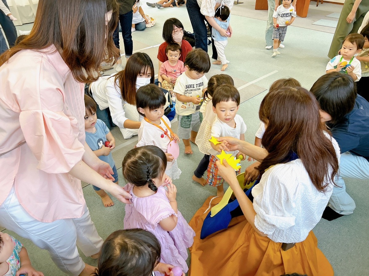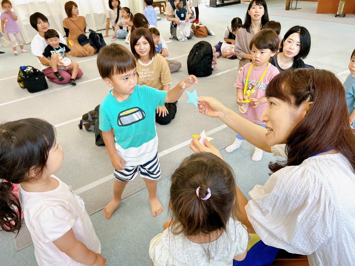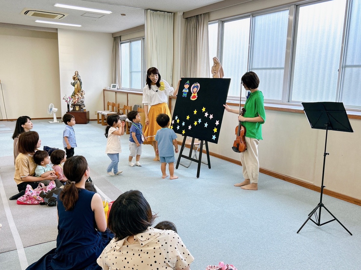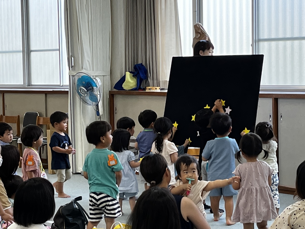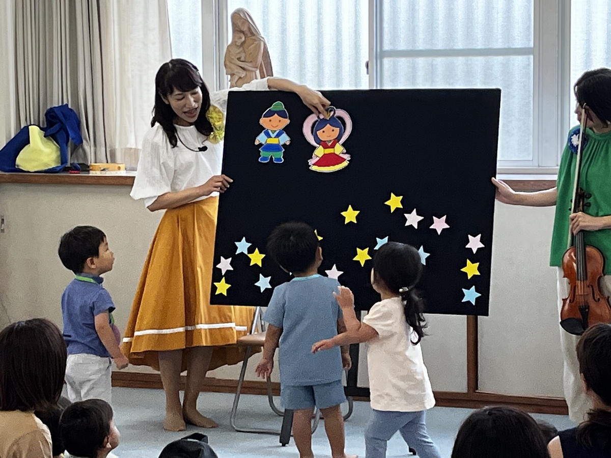 その後は、みゅーじっくすぺーす•コモドさんがお楽しみに駆けつけてくれました。素敵なバイオリンやピアノの音に合わせて、みんなで歌を歌ったりマラカスで一緒に音楽を楽しみました。7月7日は七夕。みんなで星を一つずつ貼って素敵な星空ができました。織姫様と彦星様も出てきて楽しかったね!みゅーじっくすぺーす•コモドさん、本日はありがとうございました。つぼみクラス、プチつぼみクラスの皆さんまた2学期に会えるのを楽しみにしています!9月からちゅうりっぷ組になるお友だち、幼稚園で待っていますよ!