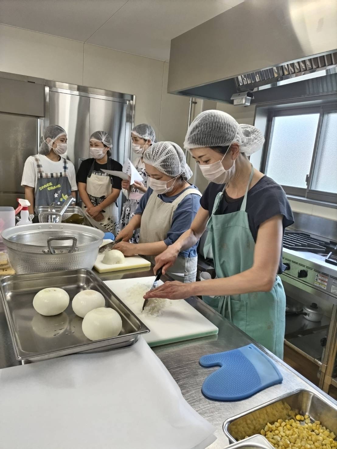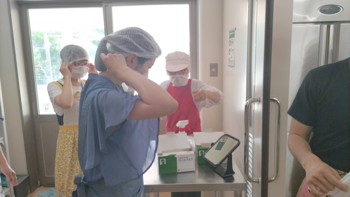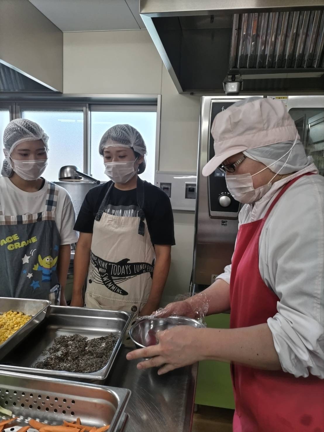 まず始めに、消毒、給食室に入る準備をし、給食室の先生のご指導のもとスタートです。メニューは、コーンご飯、豆腐ハンバーグ、さつま芋納豆、具沢山味噌汁です。
