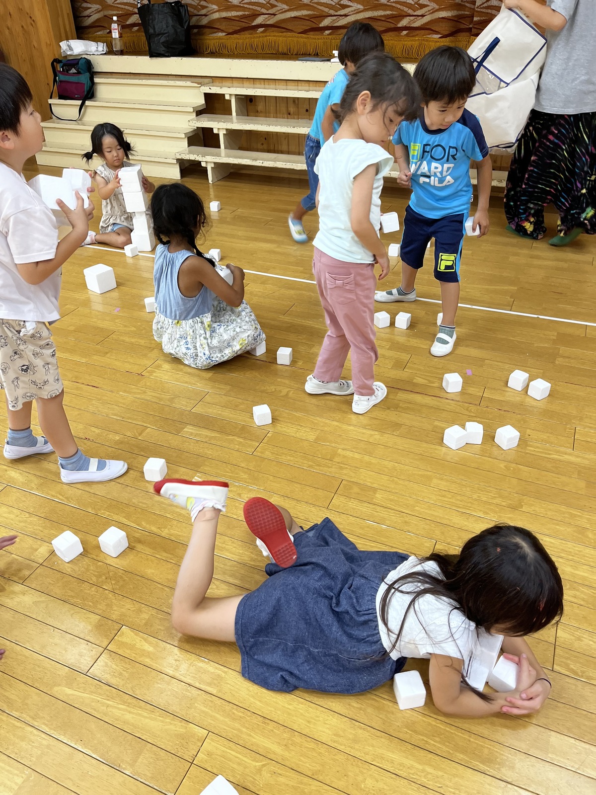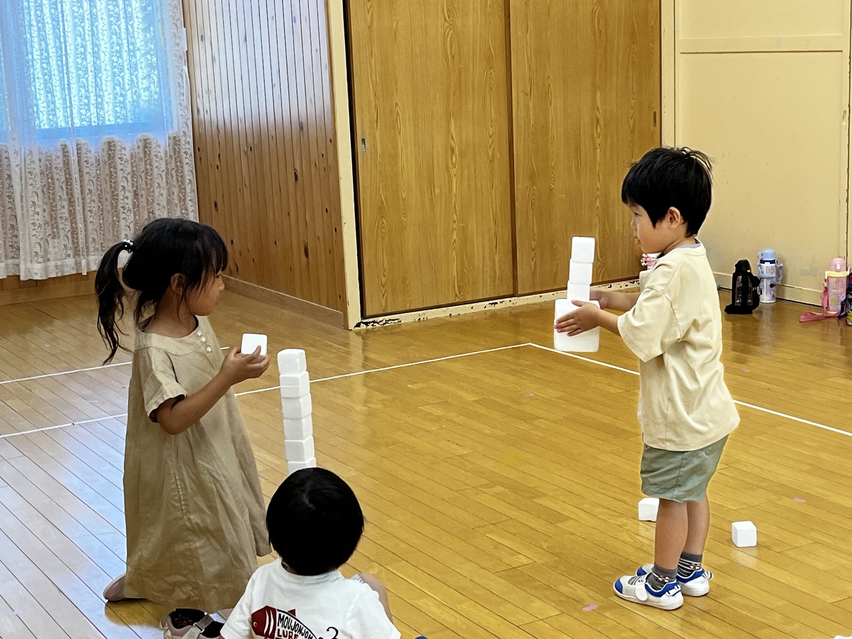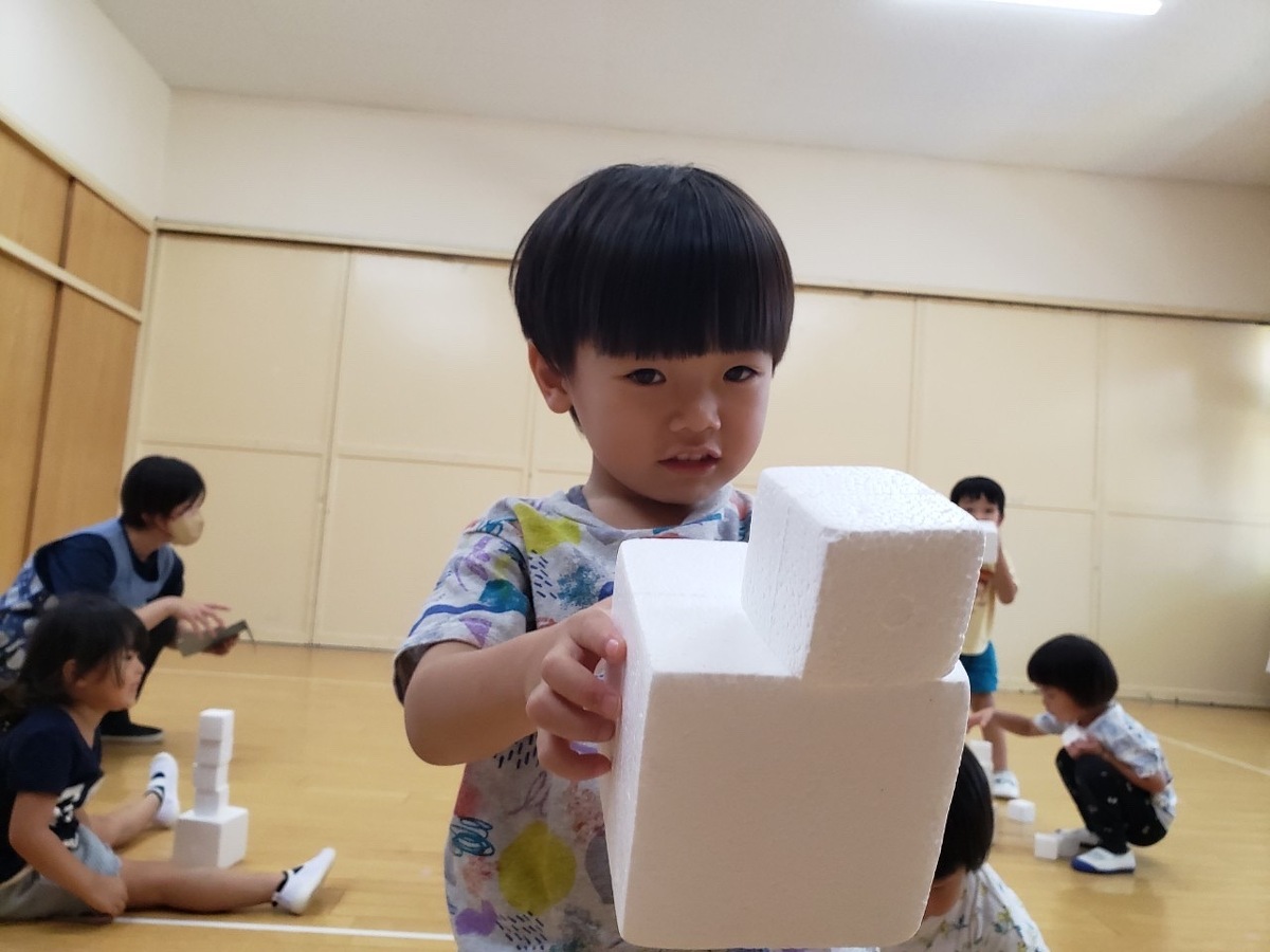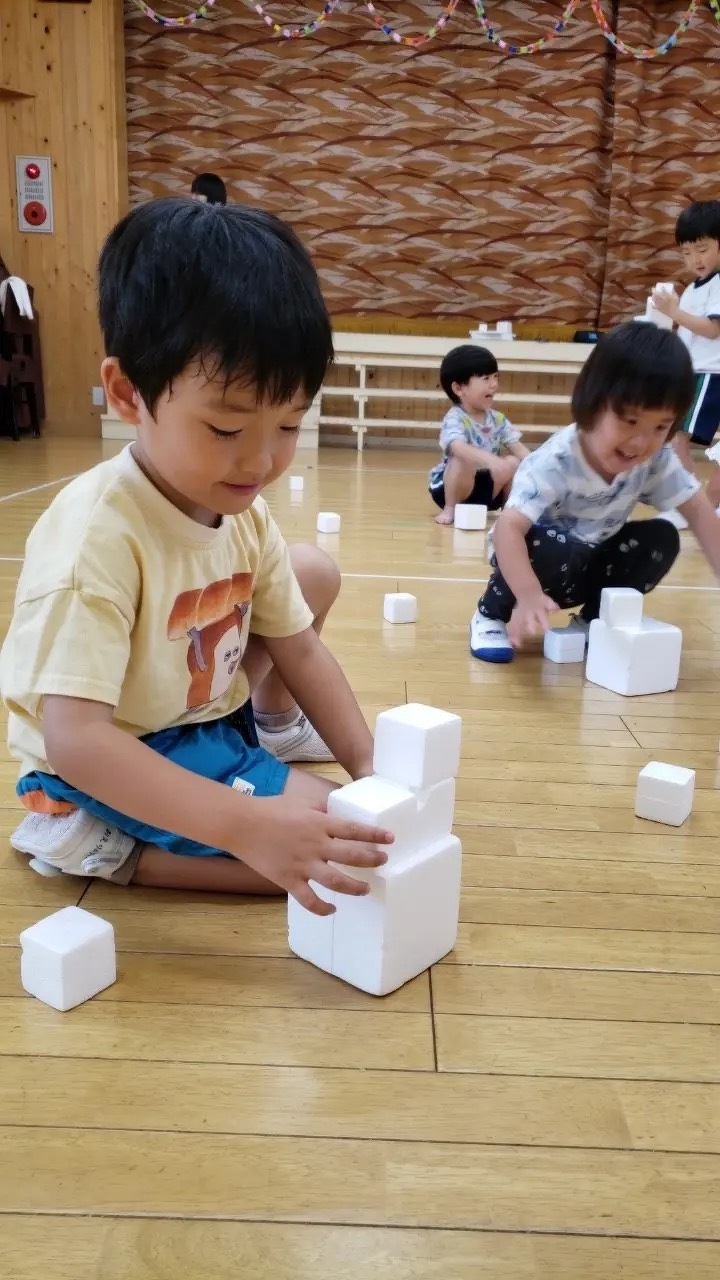 預かり保育でアートの日を行いました。② 2023年08月07日(月) 午後からは、みんなで素材遊び。ストレッチや身体を動かした後、みんなで白いキューブを積み上げたり、身体に乗せたりして遊びました。お友だちと協力してたくさん積み上げたり、落とさないように運んだりと楽しんでいました。音楽に合わせて身体を動かすのはとっても楽しかったね! mikiyuki先生、楽しい1日をありがとうございました。