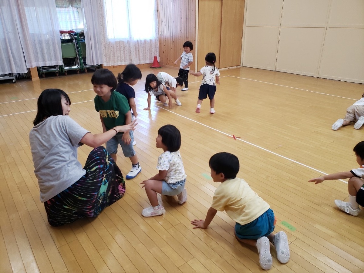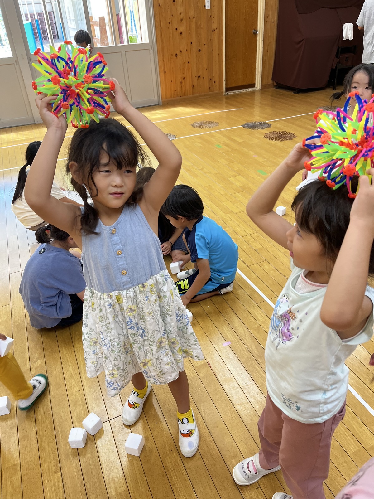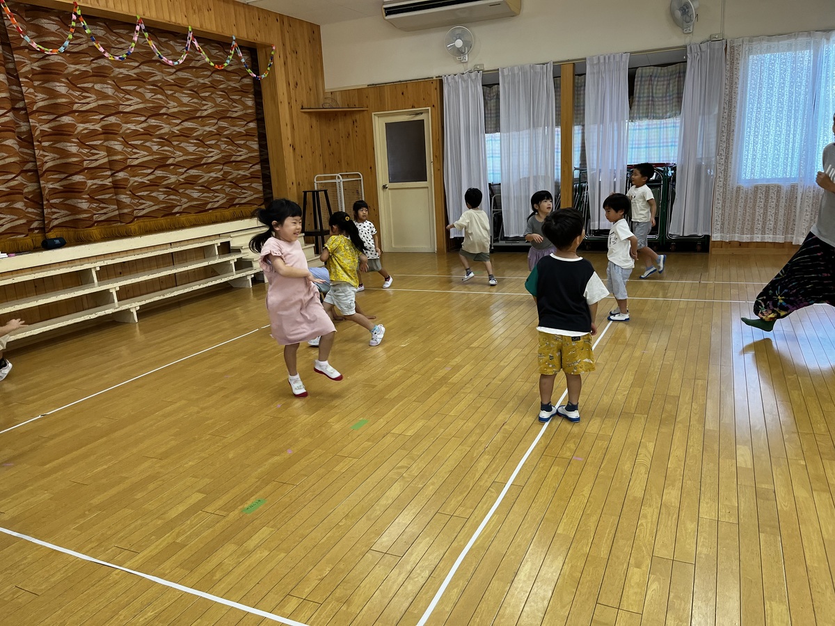 預かり保育でアートの日を行いました。② 2023年08月07日(月) 午後からは、みんなで素材遊び。ストレッチや身体を動かした後、みんなで白いキューブを積み上げたり、身体に乗せたりして遊びました。お友だちと協力してたくさん積み上げたり、落とさないように運んだりと楽しんでいました。音楽に合わせて身体を動かすのはとっても楽しかったね! mikiyuki先生、楽しい1日をありがとうございました。