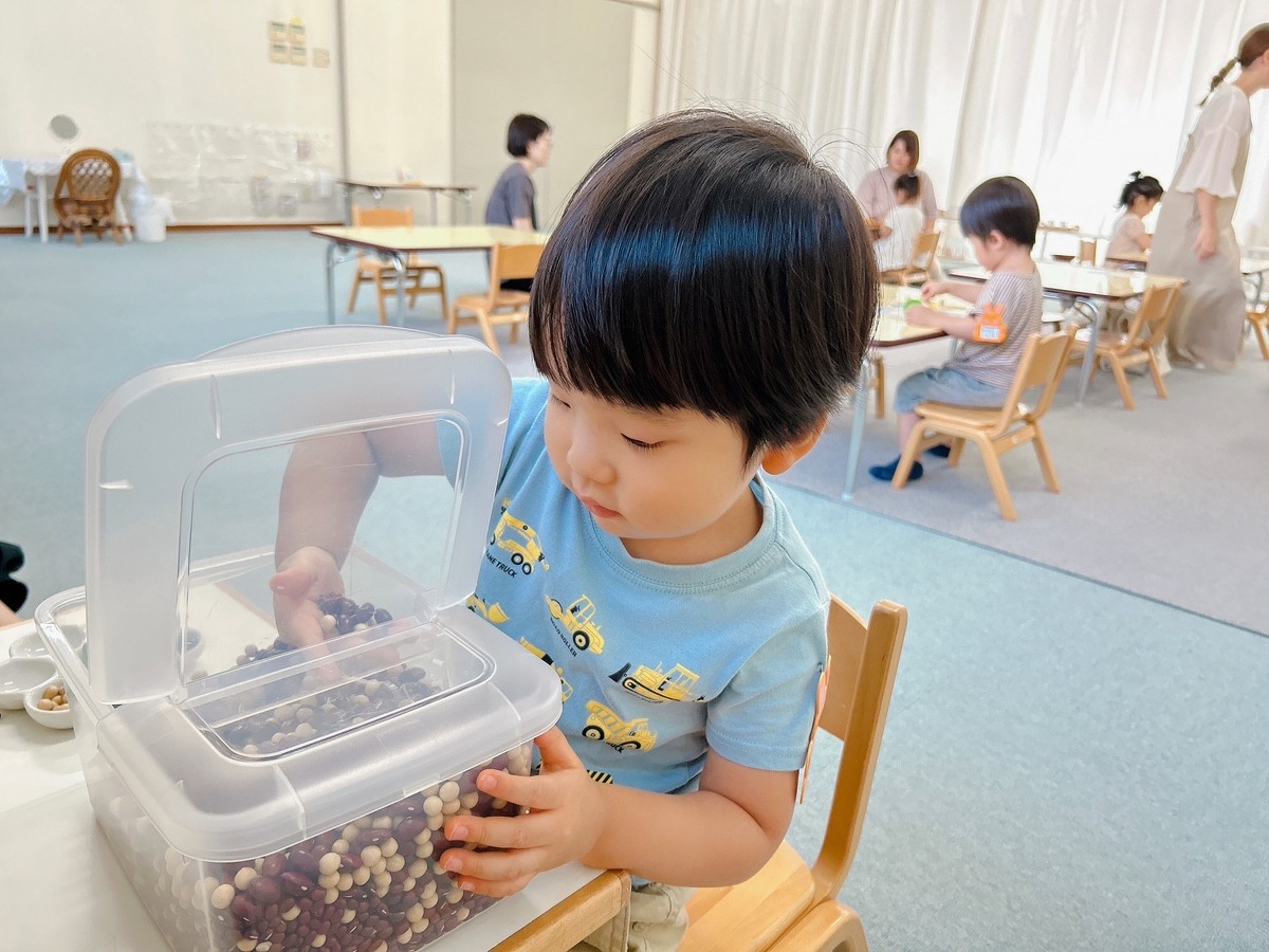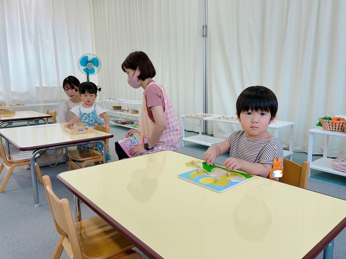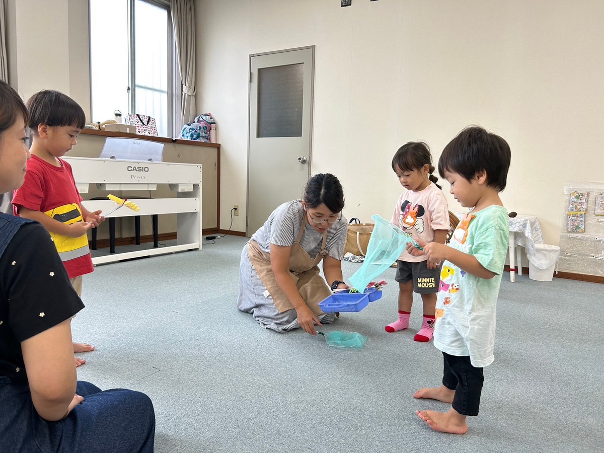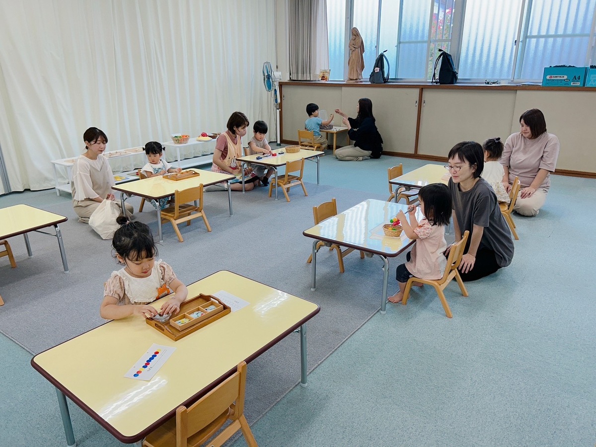 2学期のつぼみクラス、プチつぼみクラスが始まりました。久しぶりに幼稚園に来たことにとても嬉しそうにしていた子どもたち。それぞれ、思い思いのモンテッソーリ教材を使った活動に何度も繰り返し取り組んでいました。また、宮地先生の読み聞かせやわらべ歌遊びがありました。トンボのわらべ歌と一緒に、指に止まったトンボを「つかまえた!」大喜びの子どもたちでした。