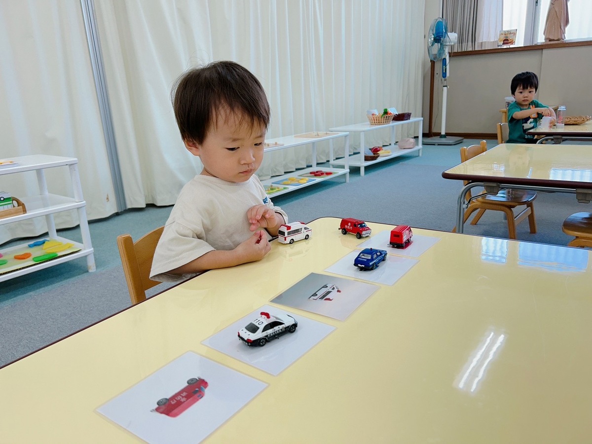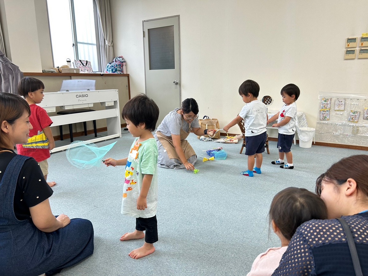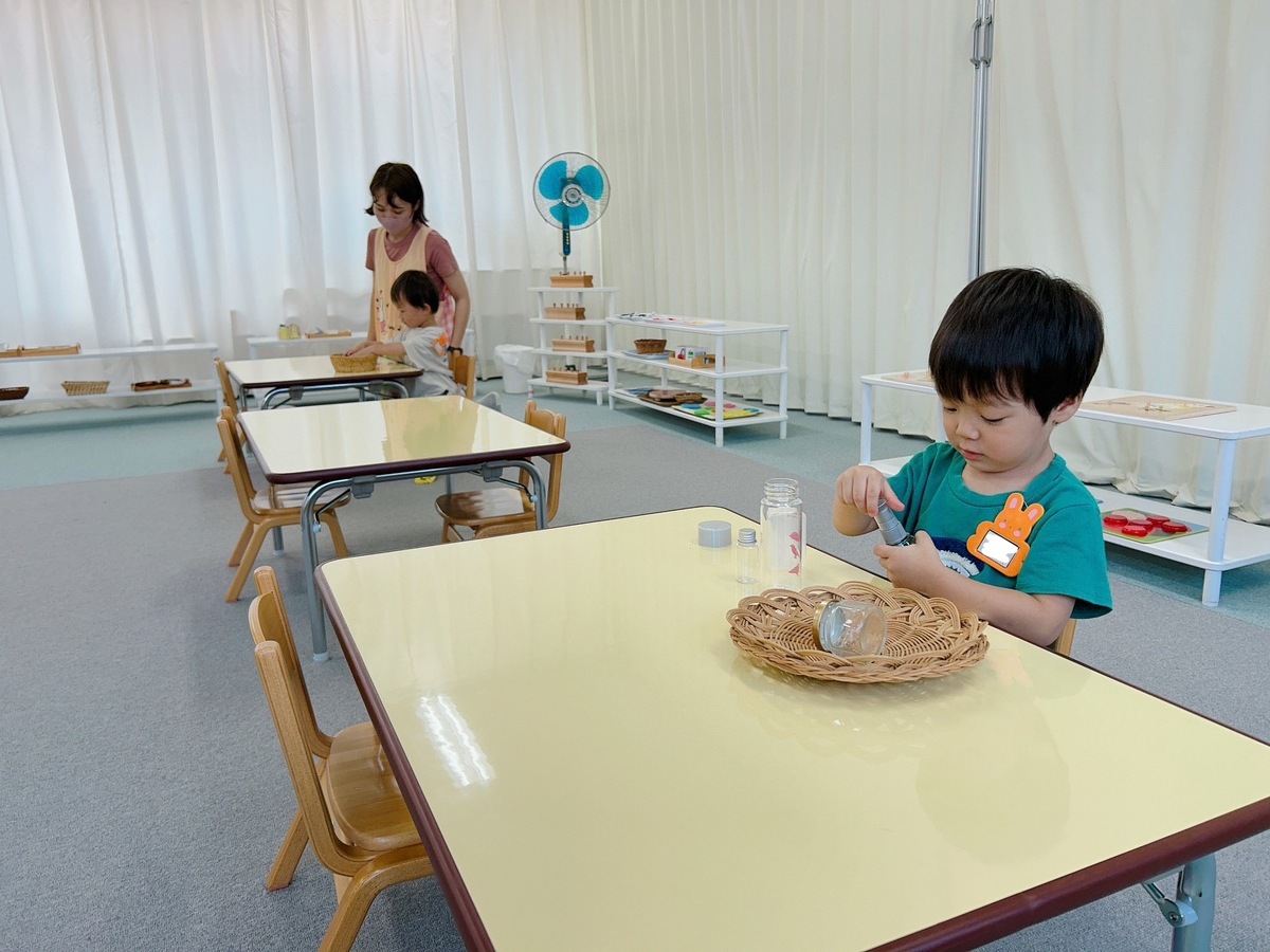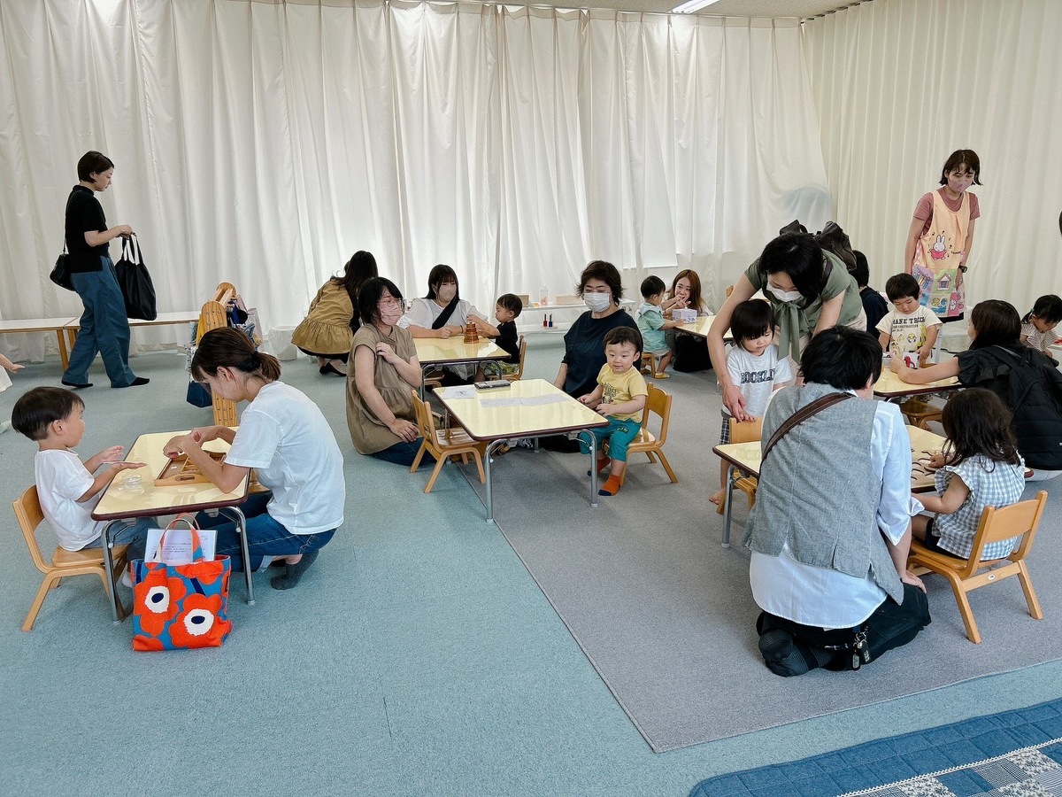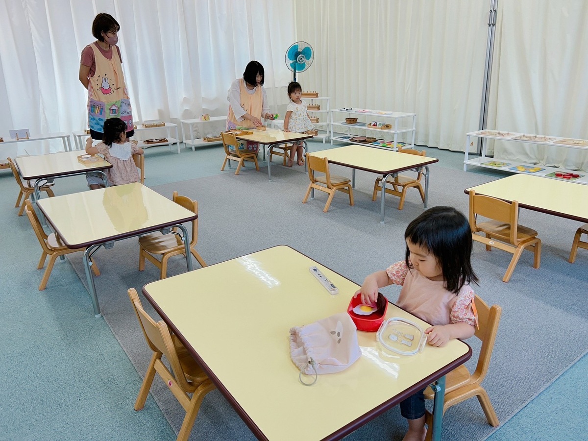 2学期のつぼみクラス、プチつぼみクラスが始まりました。久しぶりに幼稚園に来たことにとても嬉しそうにしていた子どもたち。それぞれ、思い思いのモンテッソーリ教材を使った活動に何度も繰り返し取り組んでいました。また、宮地先生の読み聞かせやわらべ歌遊びがありました。トンボのわらべ歌と一緒に、指に止まったトンボを「つかまえた!」大喜びの子どもたちでした。