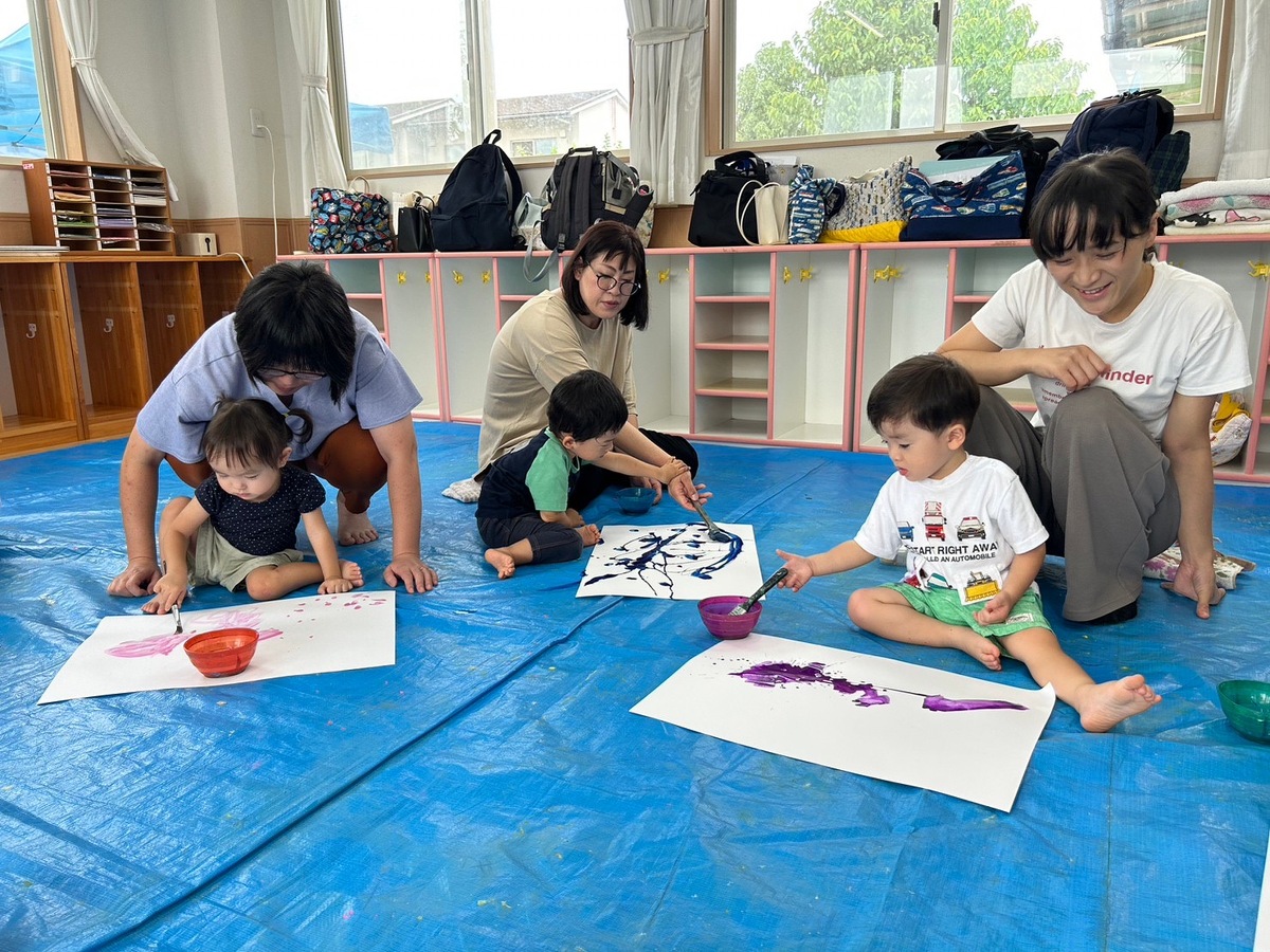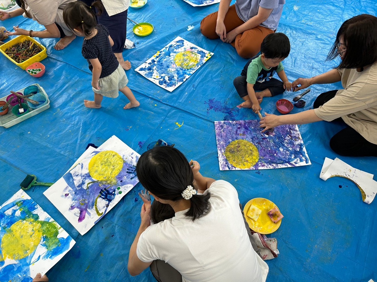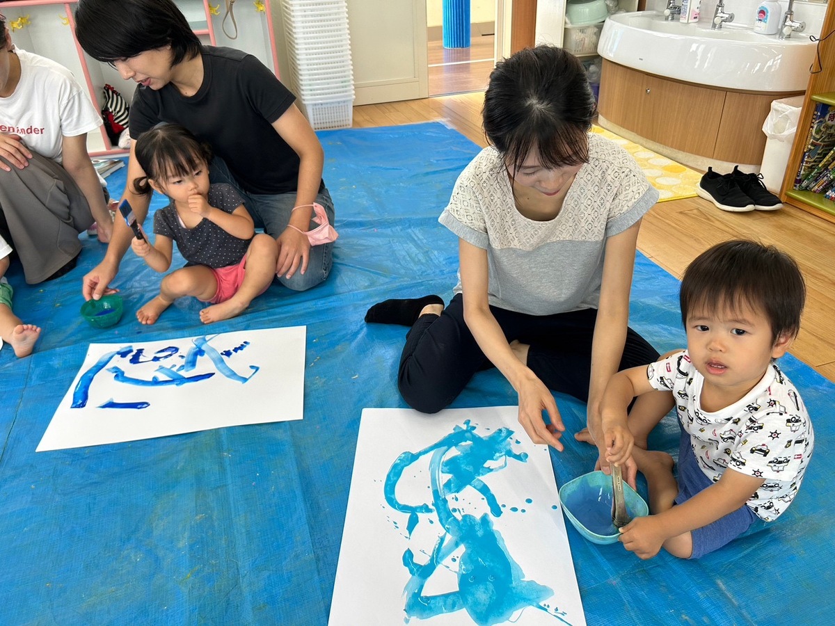 また、プチつぼみの木曜日クラスでは、おえかきあそびを行いました。「おつきさまこんばんは」のテーマのもと、筆やローラー、手を使って夜空を描いた後は、綺麗なお月様が完成しました。素敵な作品がたくさんできましたね!後藤先生、宮地先生楽しい時間をありがとうございました。