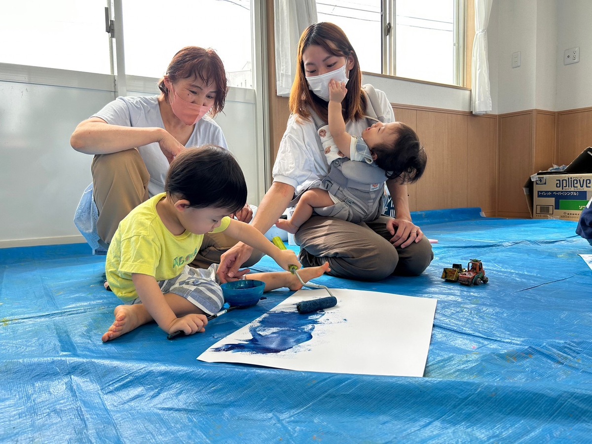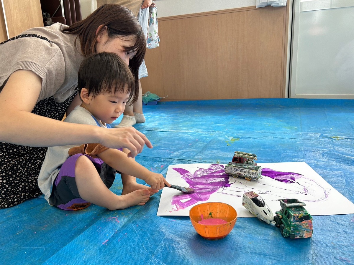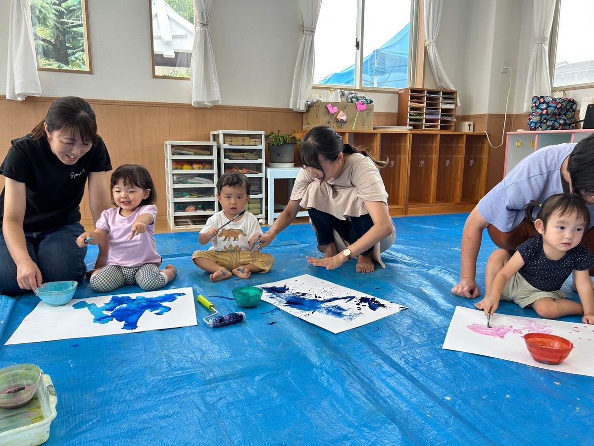 また、プチつぼみの木曜日クラスでは、おえかきあそびを行いました。「おつきさまこんばんは」のテーマのもと、筆やローラー、手を使って夜空を描いた後は、綺麗なお月様が完成しました。素敵な作品がたくさんできましたね!後藤先生、宮地先生楽しい時間をありがとうございました。