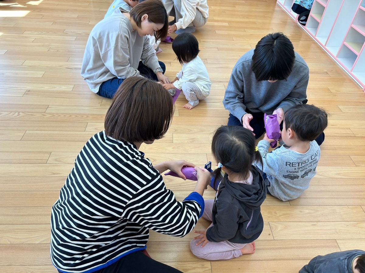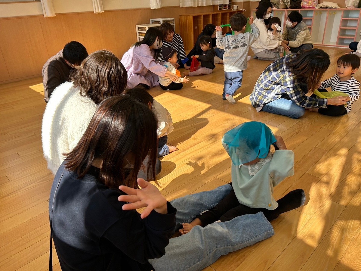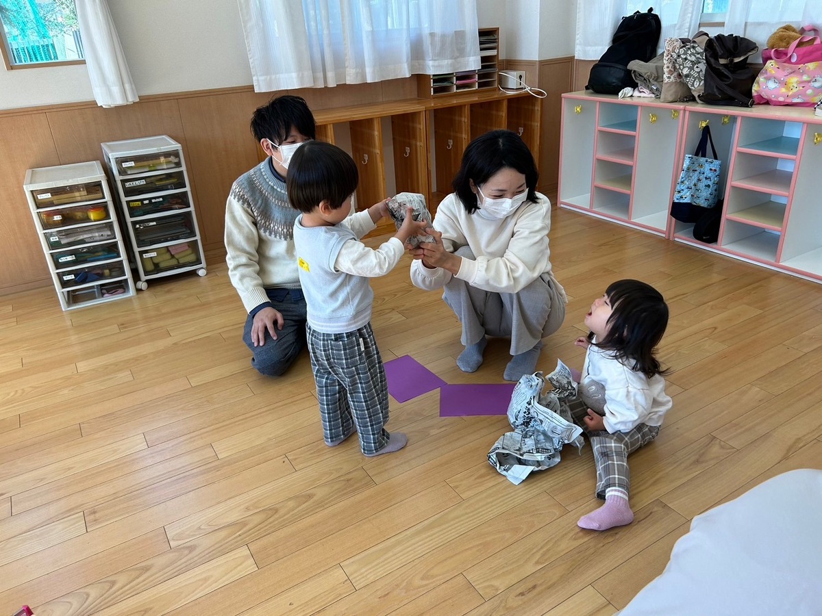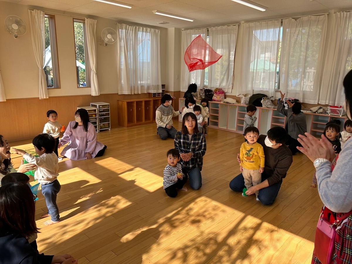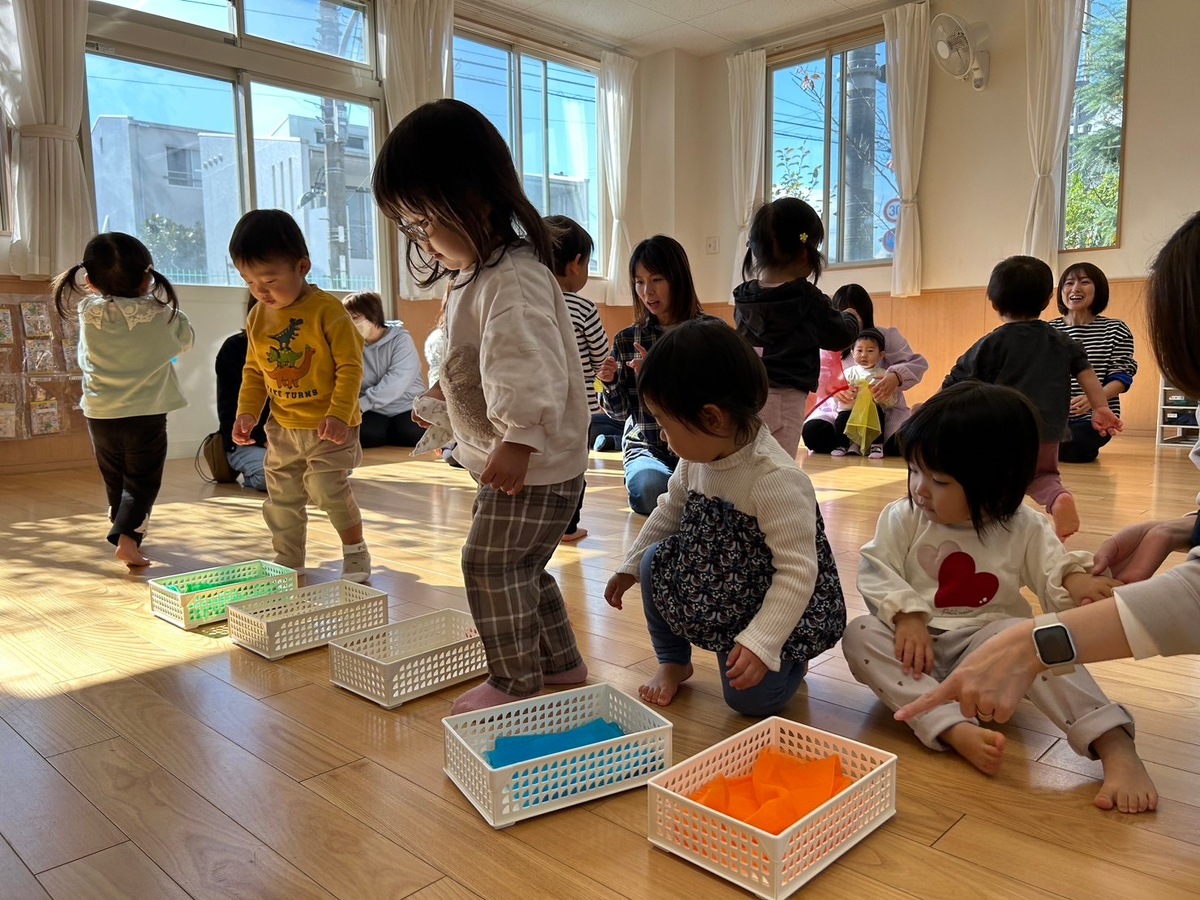 いないいないばあの歌を歌うとお母さんと一緒に顔を隠して、「いないいないばあ」と楽しんだり、「ゴシゴシゴシ」と顔、手、足、おしり、ほっぺをリズムに合わせて体を洗ったり、スカーフをおだんご丸めて上に向かってなげ、ヒラヒラ落ちていく様を繰り返し、楽しむ姿も見られました。