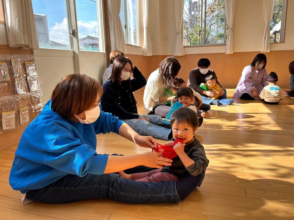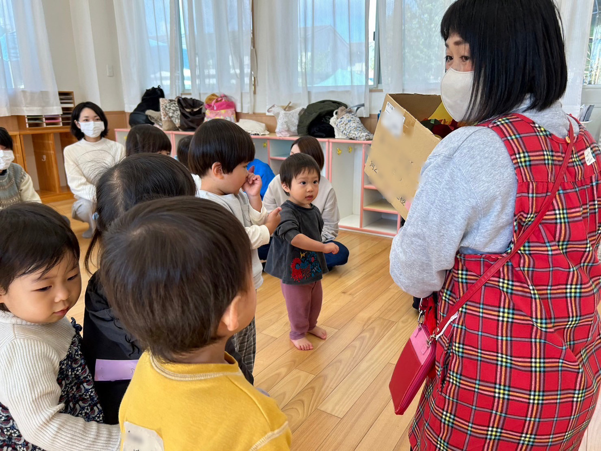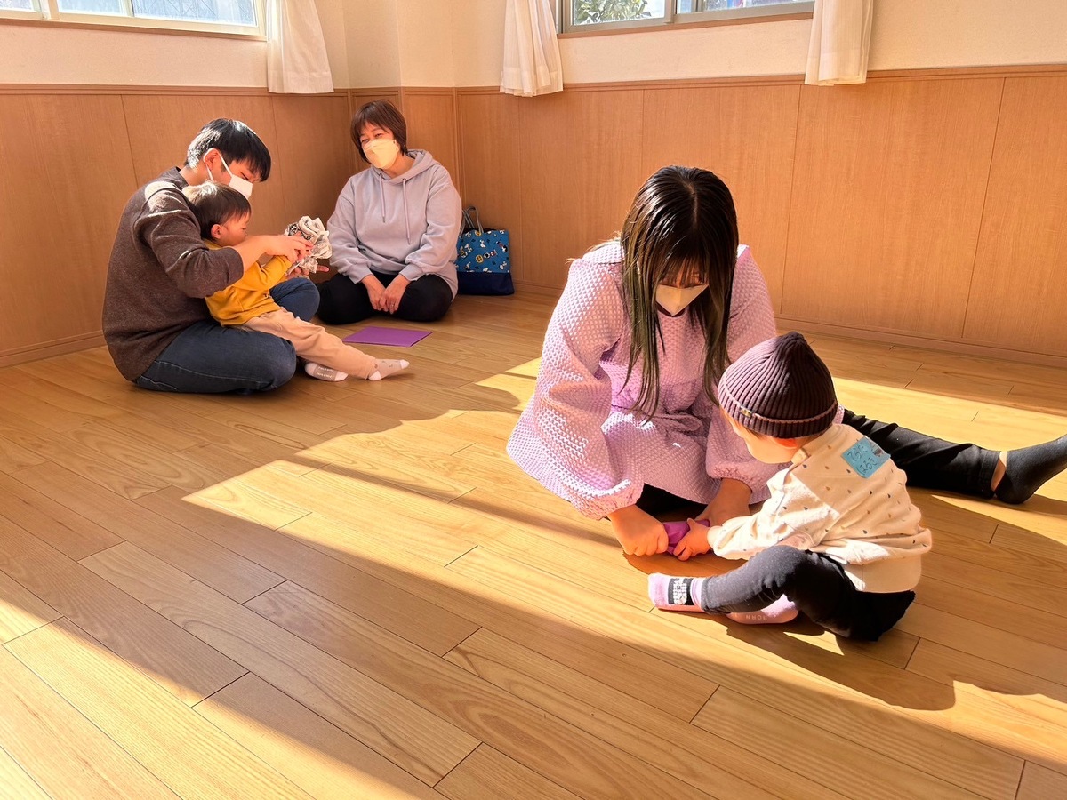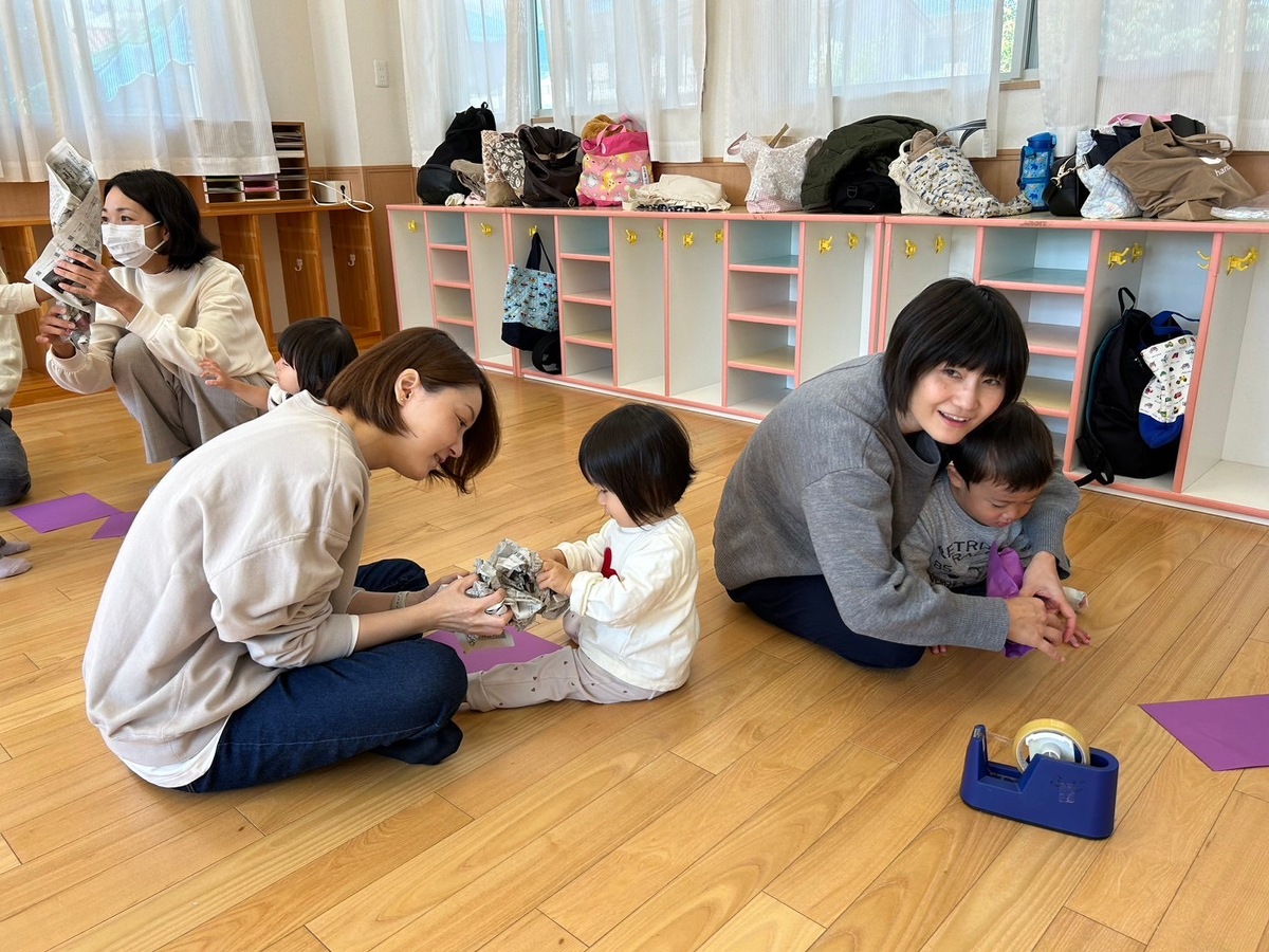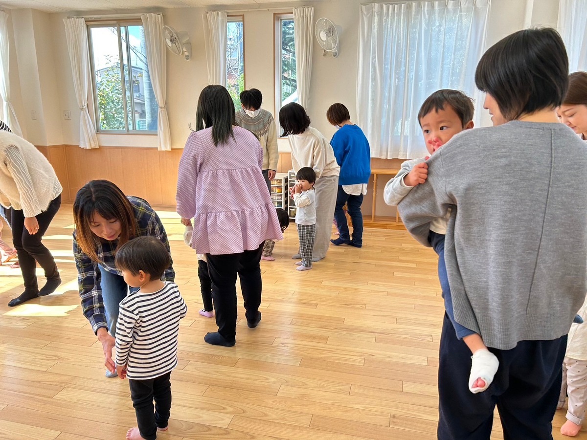いないいないばあの歌を歌うとお母さんと一緒に顔を隠して、「いないいないばあ」と楽しんだり、「ゴシゴシゴシ」と顔、手、足、おしり、ほっぺをリズムに合わせて体を洗ったり、スカーフをおだんご丸めて上に向かってなげ、ヒラヒラ落ちていく様を繰り返し、楽しむ姿も見られました。