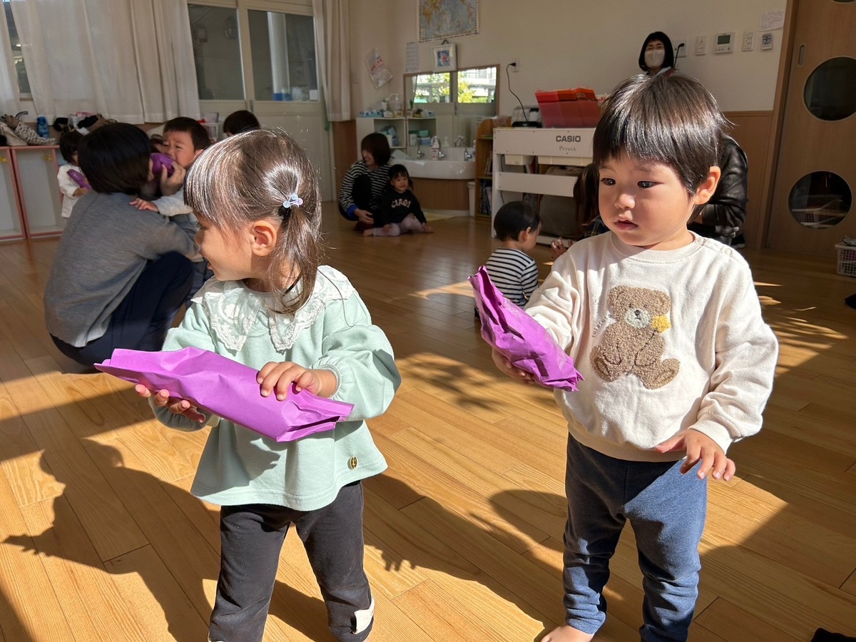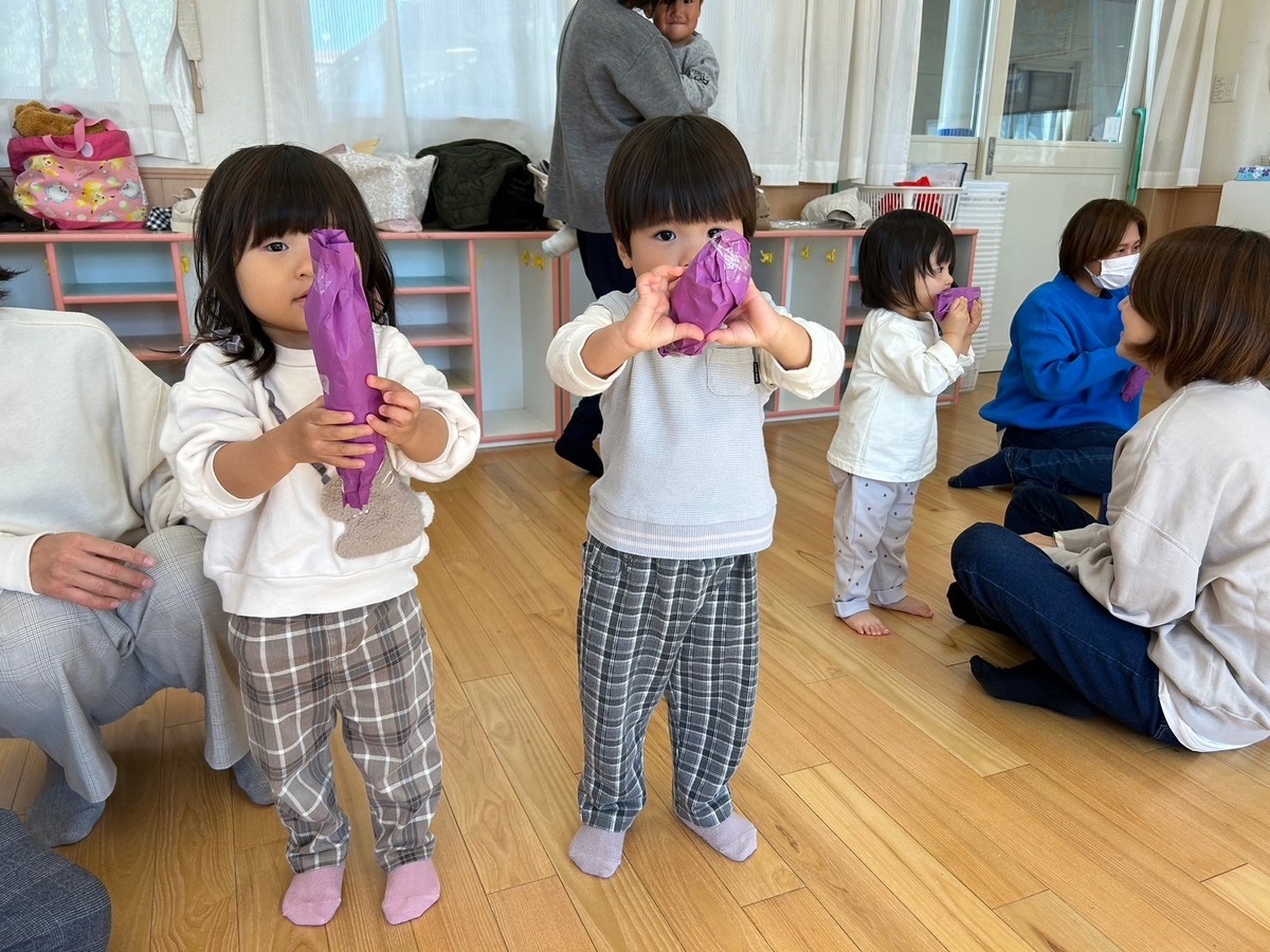 そして、「おいもくんがね」の絵本を見た後、「うんとこしょ、どっこいしょ」と言う子どもたちの掛け声に合わせて先生たちでお芋を引っ張ってぬきました。それを見た子どもたち、みんなもさつまいもを作ってみたいと新聞紙を丸め、思い思いのさつまいもを作りました。
