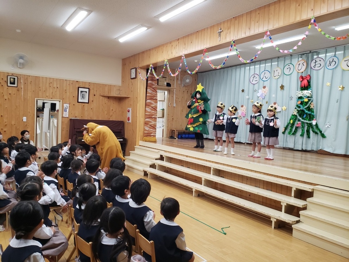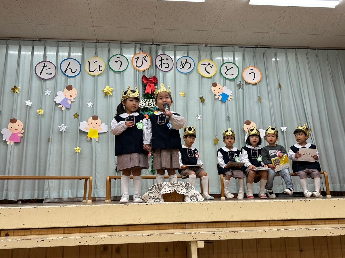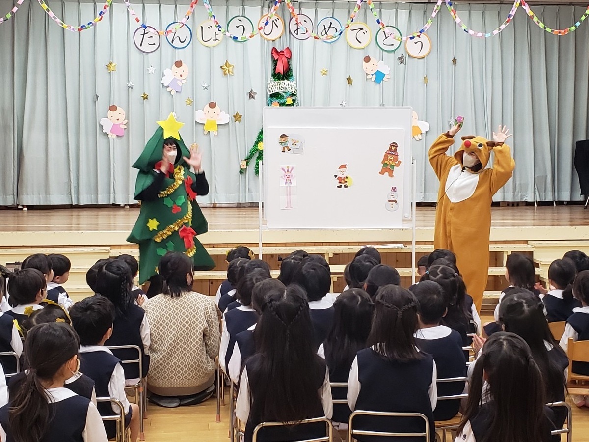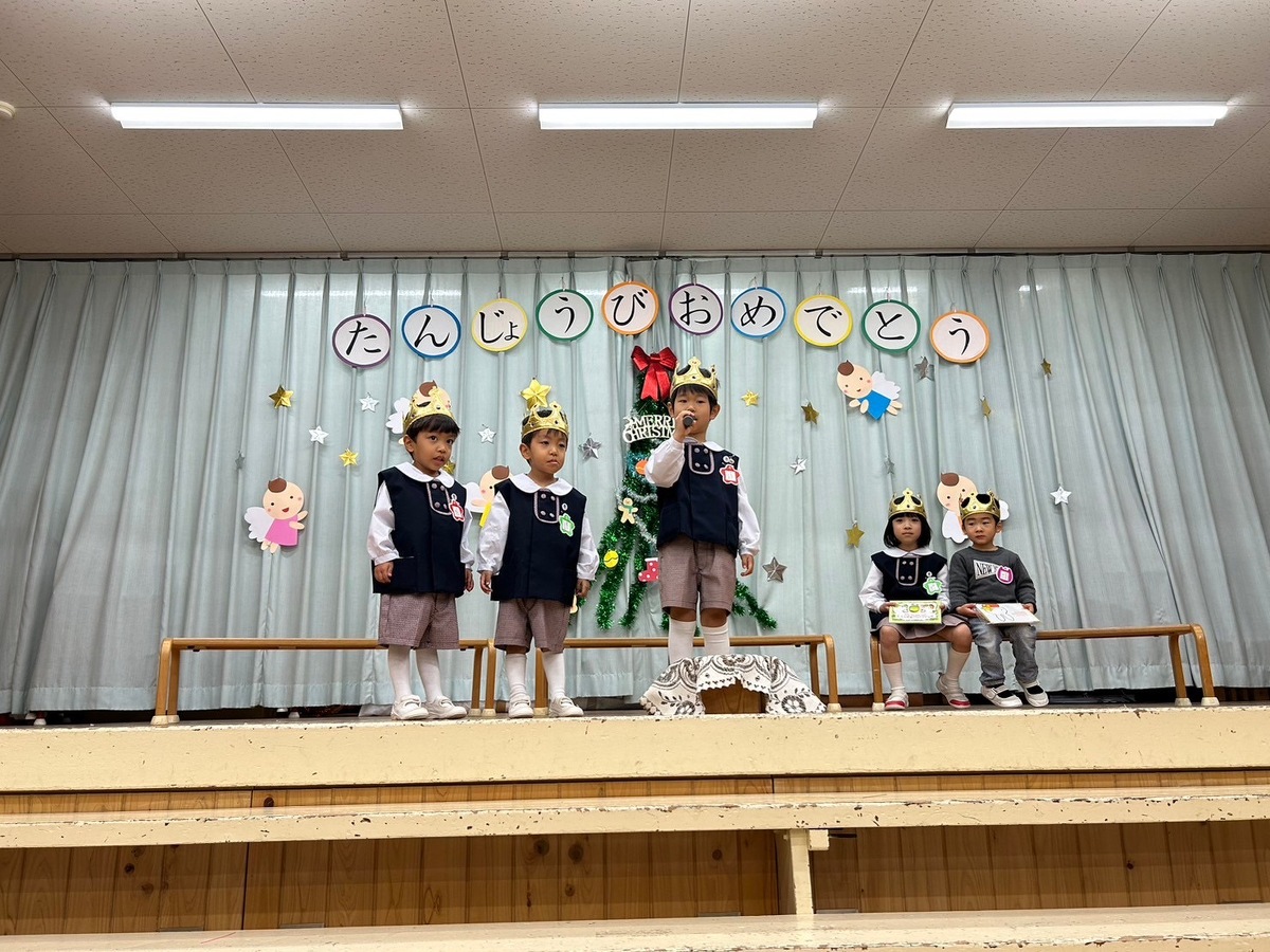 12月生まれの誕生日会がありました。 2023年12月08日(金) 12月の誕生日会がありました。今月の折り紙のプレゼントはサンタクロース!鈴の音が鳴って、とっても可愛かったです。お誕生日会係の皆様、ありがとうございます。 そして、12月生まれのお誕生日のお友だちの発表です。ステージの上でも元気に、一生懸命発表することができました。 お楽しみは、トナカイさんとクリスマスツリーさんが遊びにきてくれてお誕生日のお友だちと一緒にダンスをしました。その後、「クリスマスのうたがきこえてくるよ」のお話を聞きました。楽しい時間を過ごすことができました。