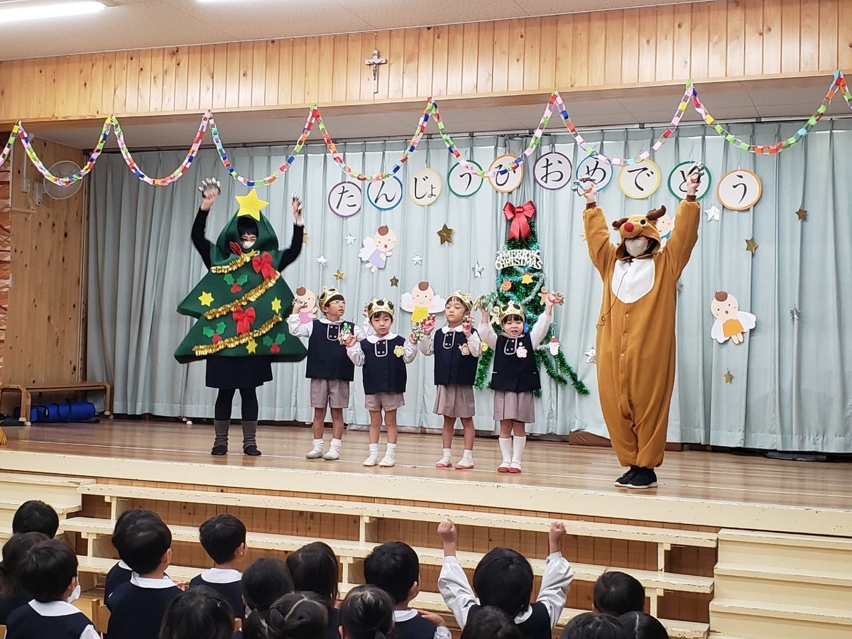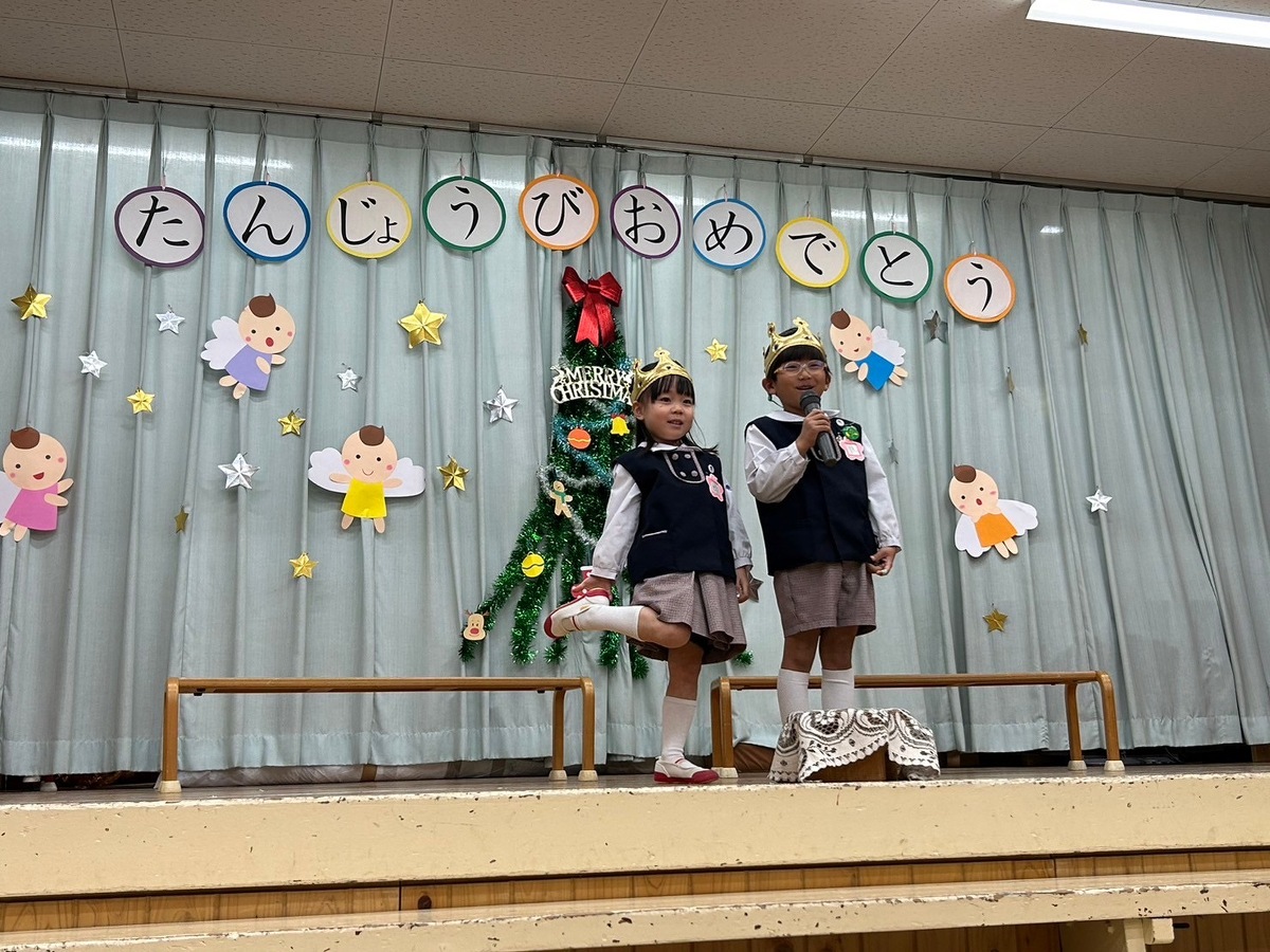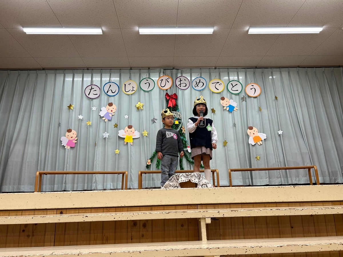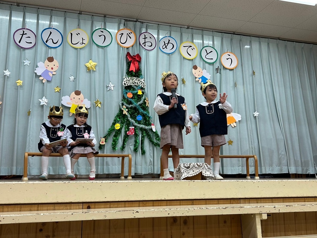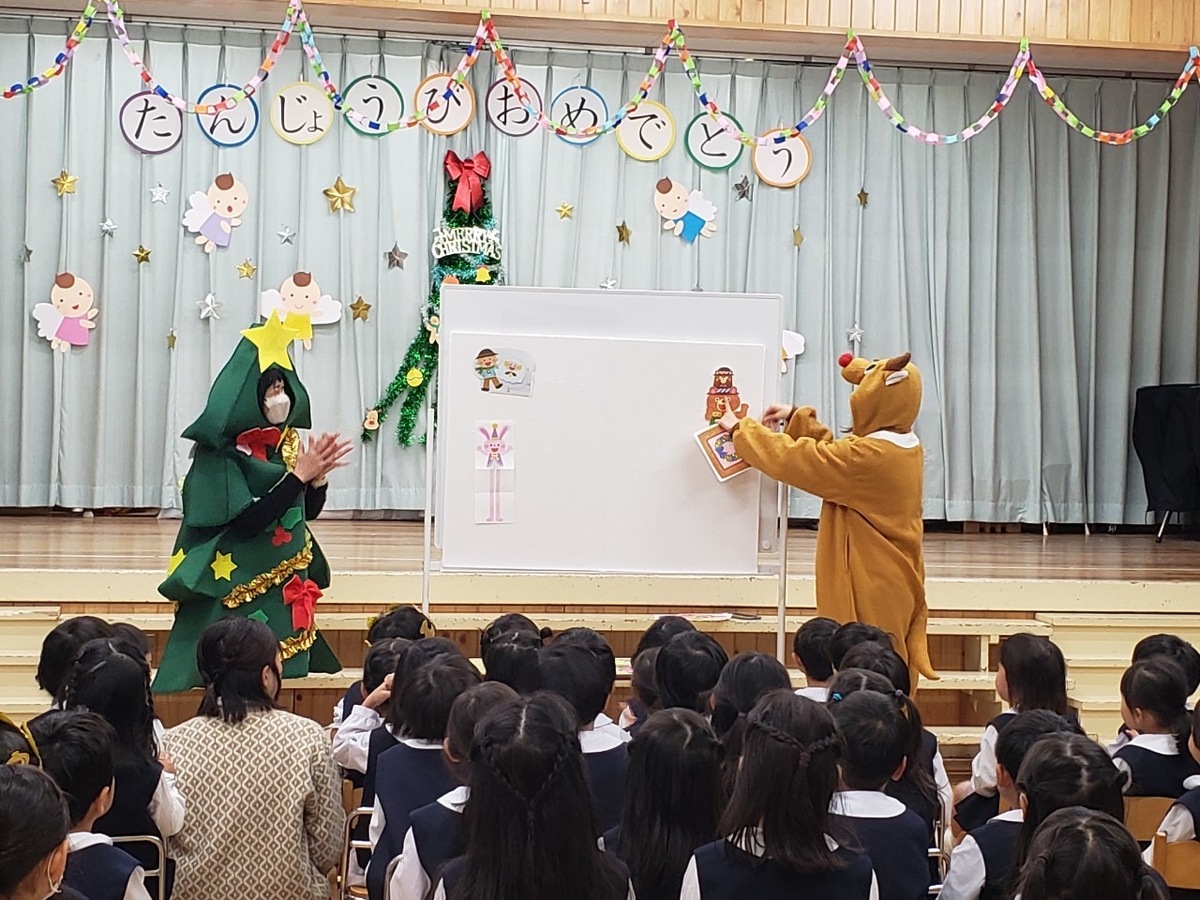12月生まれの誕生日会がありました。 2023年12月08日(金) 12月の誕生日会がありました。今月の折り紙のプレゼントはサンタクロース!鈴の音が鳴って、とっても可愛かったです。お誕生日会係の皆様、ありがとうございます。 そして、12月生まれのお誕生日のお友だちの発表です。ステージの上でも元気に、一生懸命発表することができました。 お楽しみは、トナカイさんとクリスマスツリーさんが遊びにきてくれてお誕生日のお友だちと一緒にダンスをしました。その後、「クリスマスのうたがきこえてくるよ」のお話を聞きました。楽しい時間を過ごすことができました。