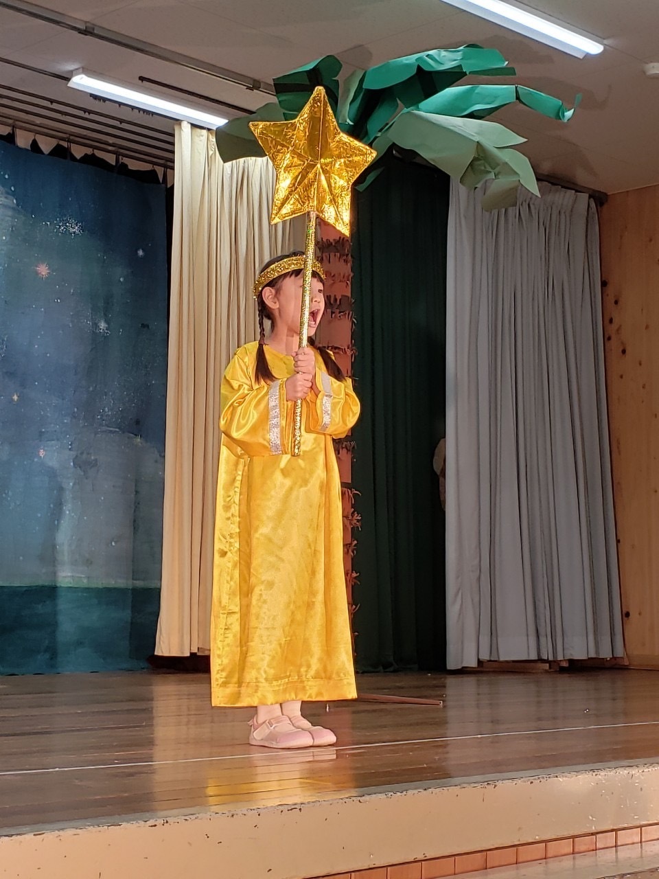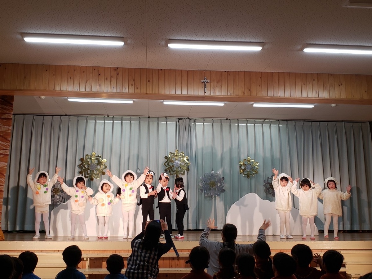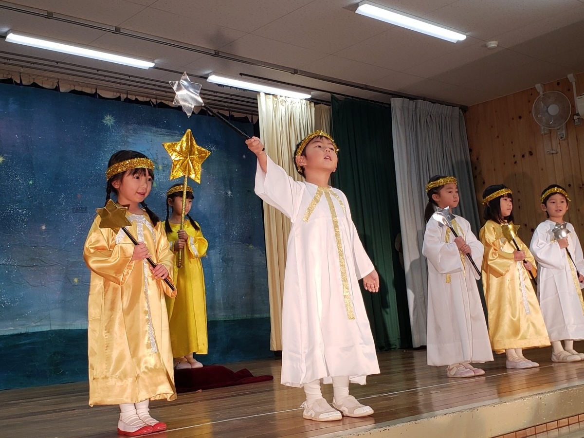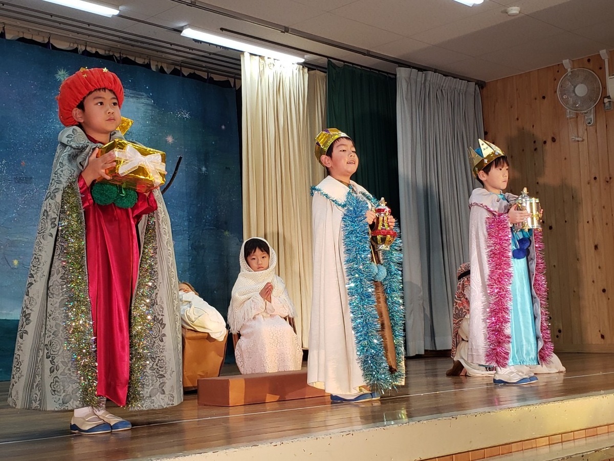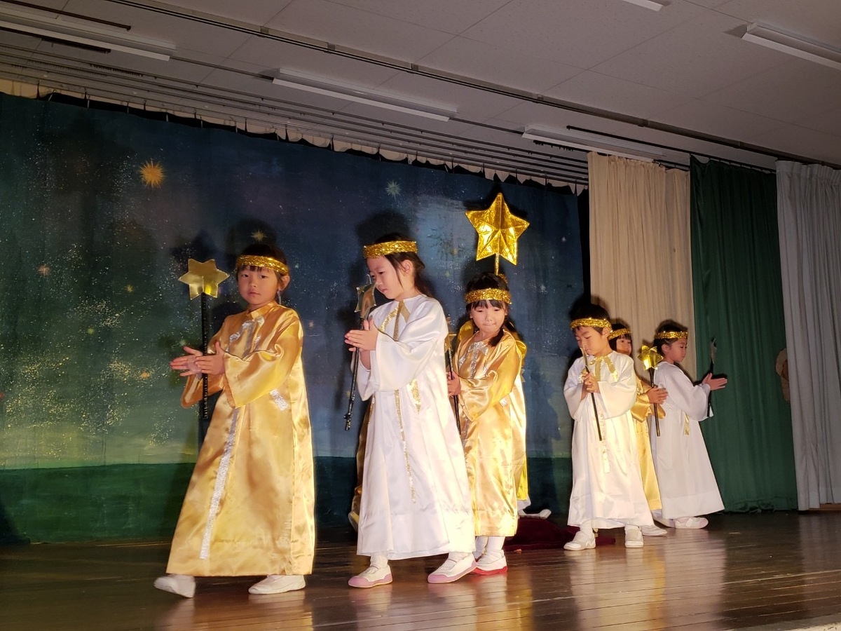 第一部は、年少児、年中児による天地創造です。音楽に合わせてダンスを踊ったり、セリフを言ったりして、世界の始まり、春夏秋冬を表現しました。そして、第二部はご降誕。年長児による聖劇を行いました。子どもたちそれぞれ役になりきって、堂々と表現することができました。