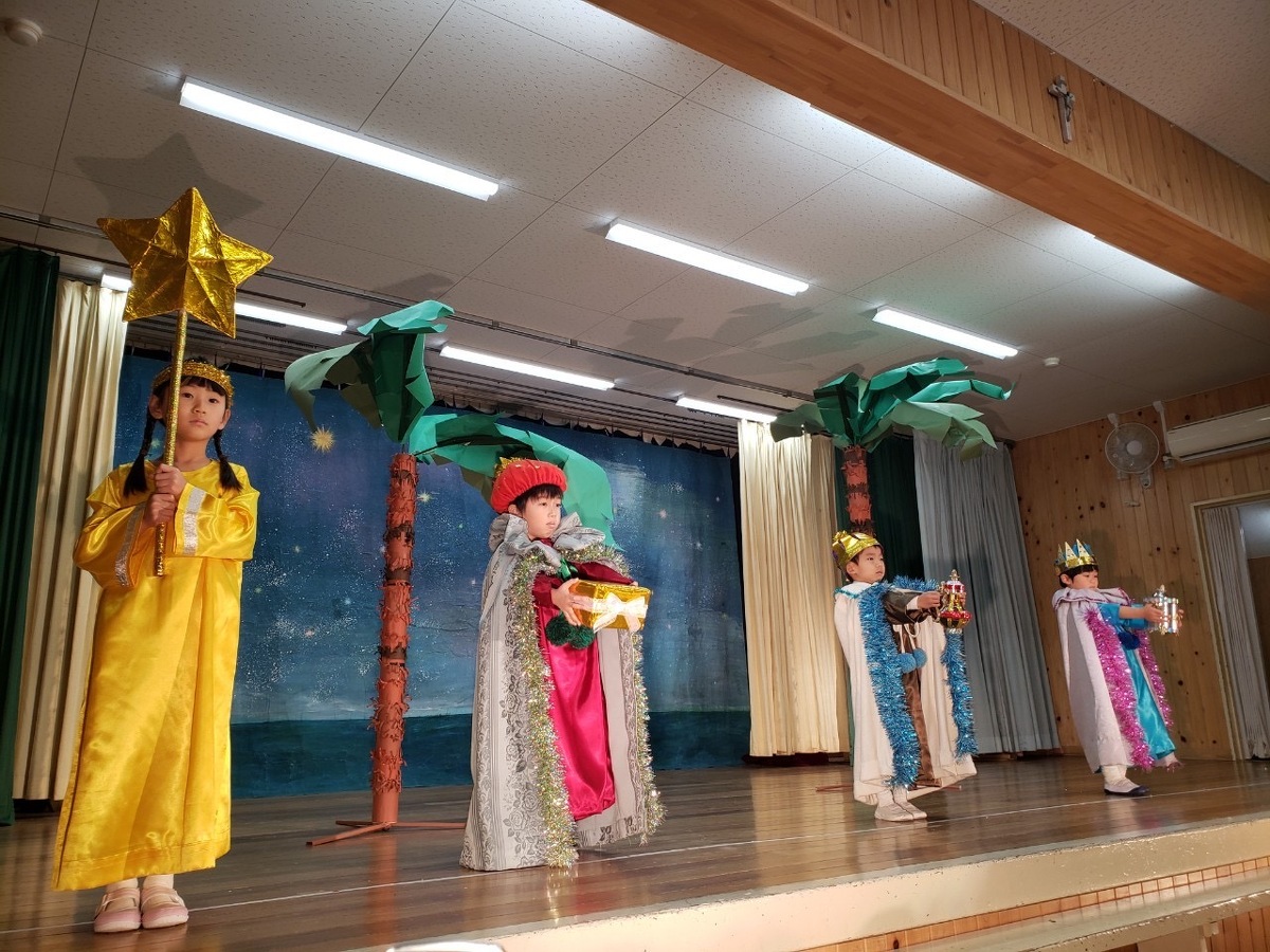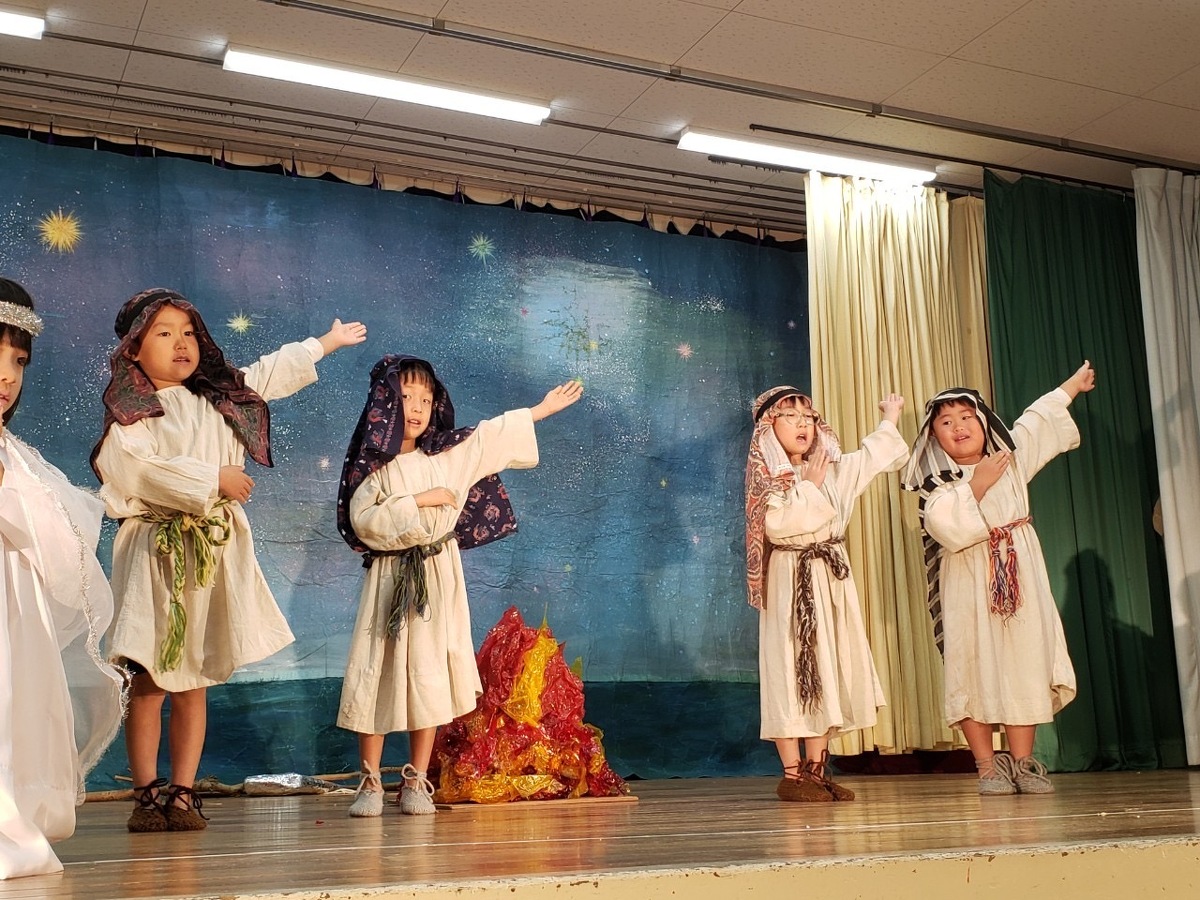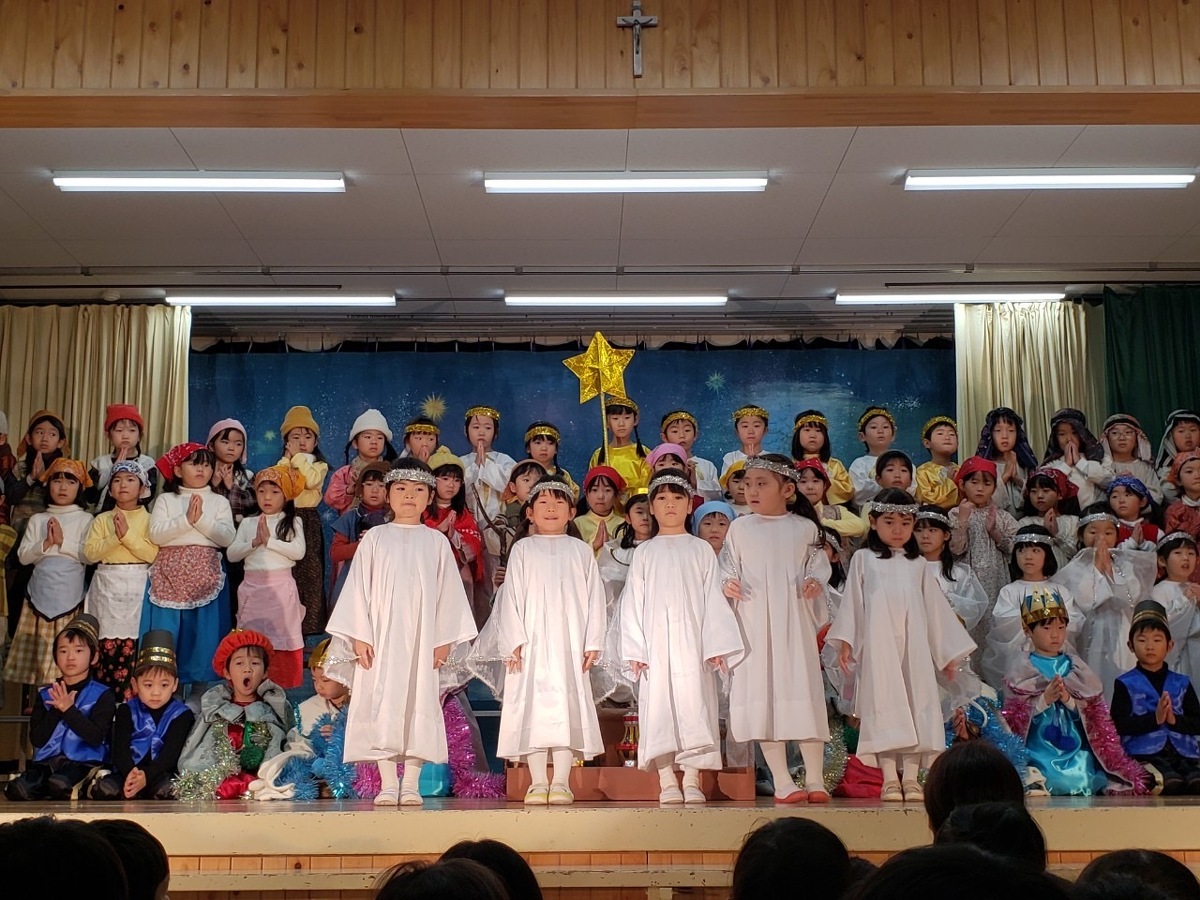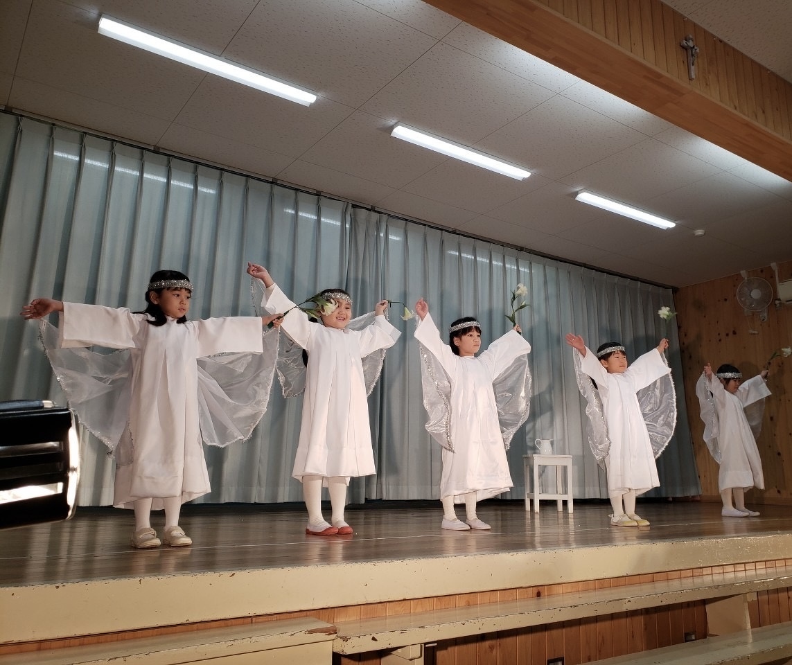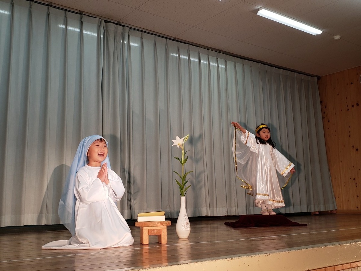 第一部は、年少児、年中児による天地創造です。音楽に合わせてダンスを踊ったり、セリフを言ったりして、世界の始まり、春夏秋冬を表現しました。そして、第二部はご降誕。年長児による聖劇を行いました。子どもたちそれぞれ役になりきって、堂々と表現することができました。