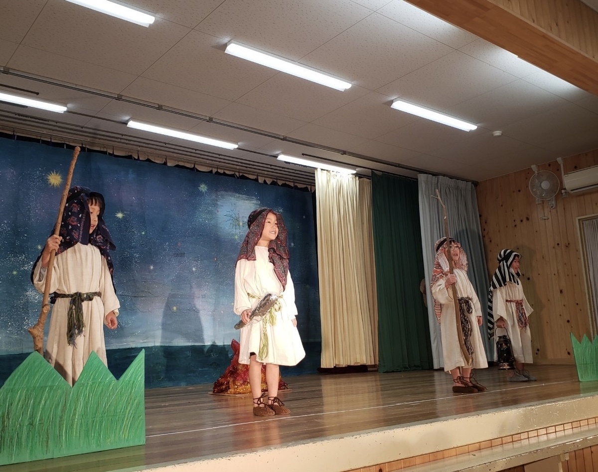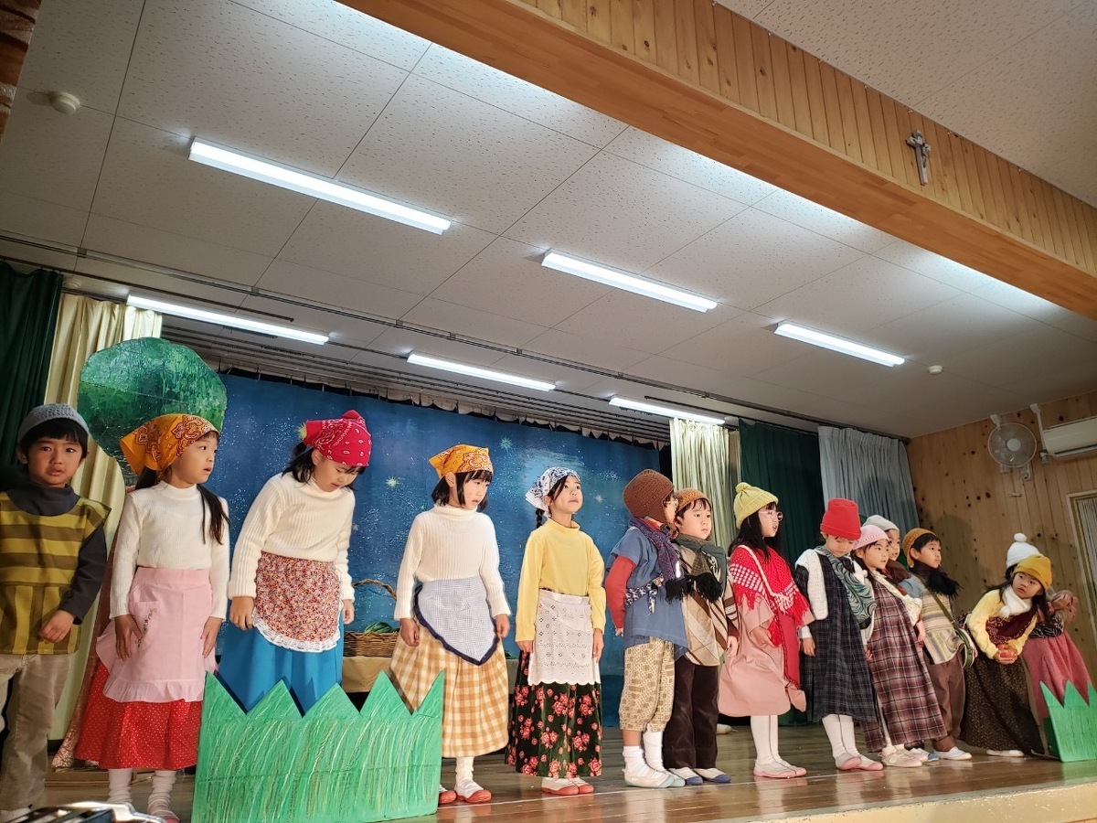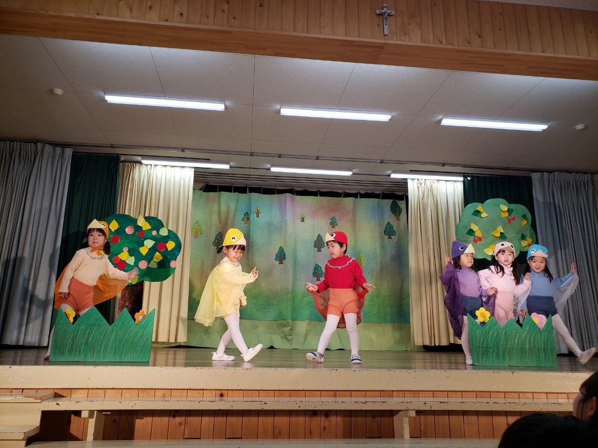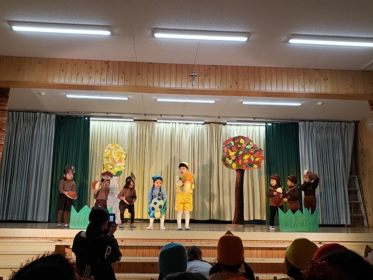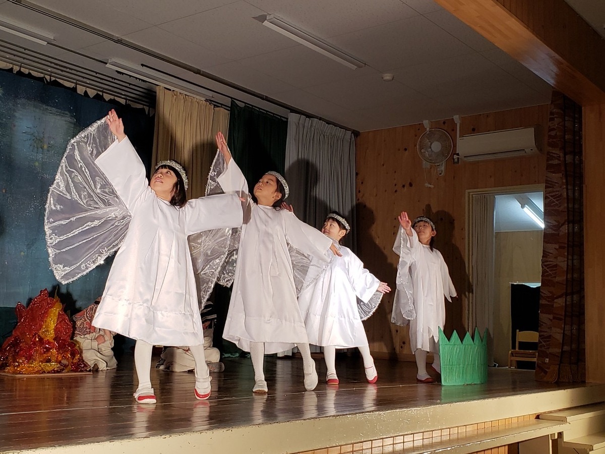 第一部は、年少児、年中児による天地創造です。音楽に合わせてダンスを踊ったり、セリフを言ったりして、世界の始まり、春夏秋冬を表現しました。そして、第二部はご降誕。年長児による聖劇を行いました。子どもたちそれぞれ役になりきって、堂々と表現することができました。