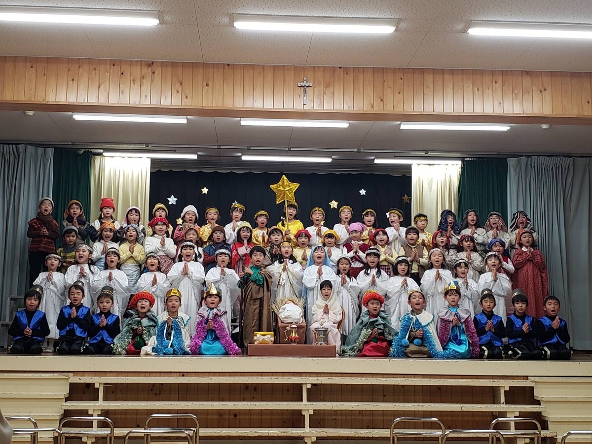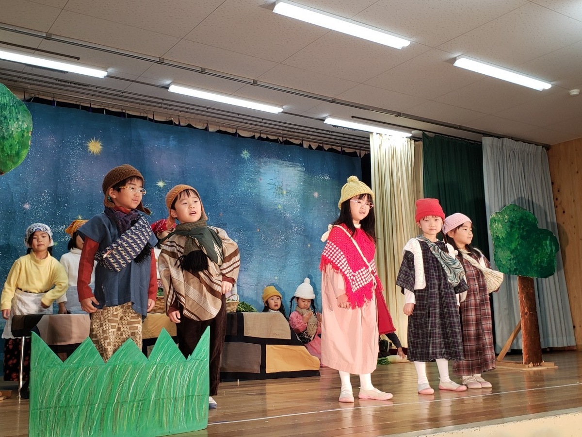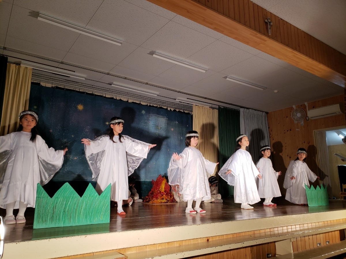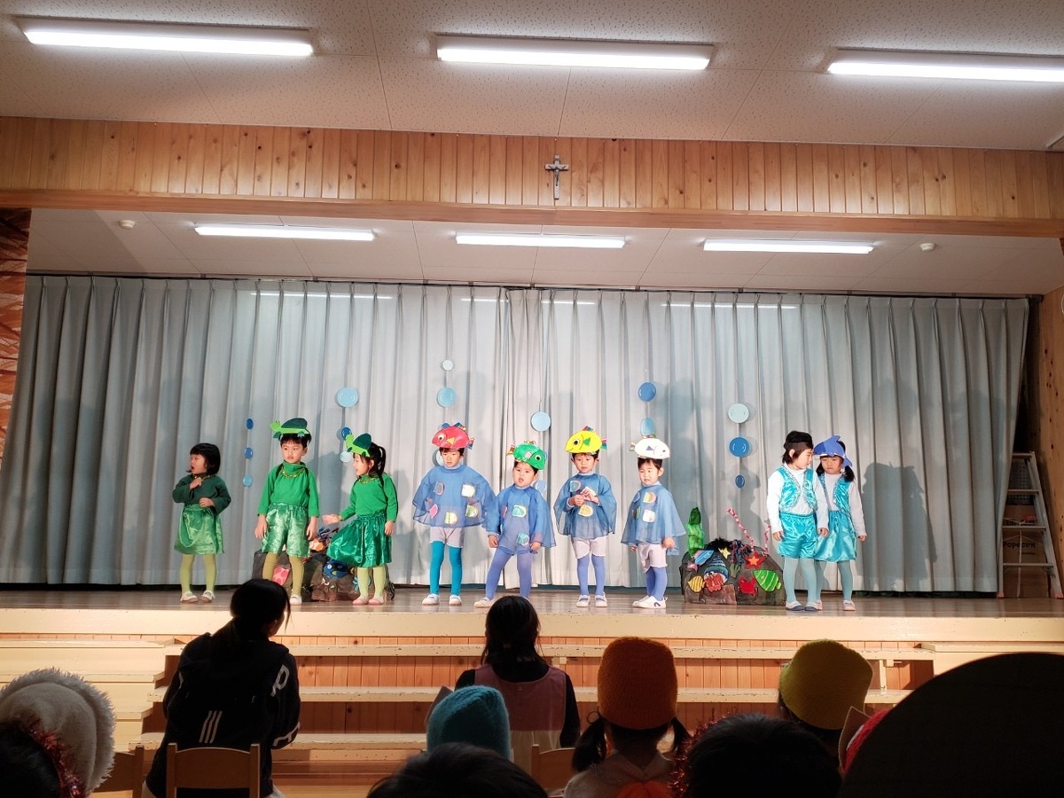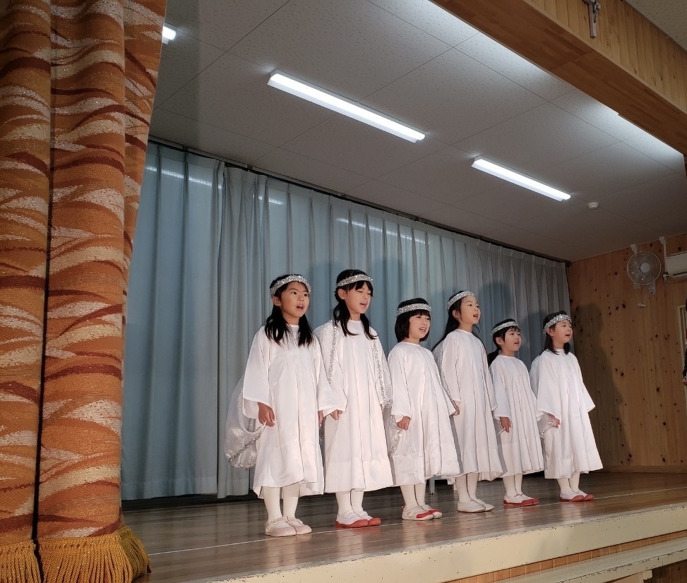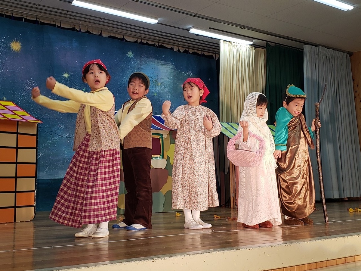 第一部は、年少児、年中児による天地創造です。音楽に合わせてダンスを踊ったり、セリフを言ったりして、世界の始まり、春夏秋冬を表現しました。そして、第二部はご降誕。年長児による聖劇を行いました。子どもたちそれぞれ役になりきって、堂々と表現することができました。