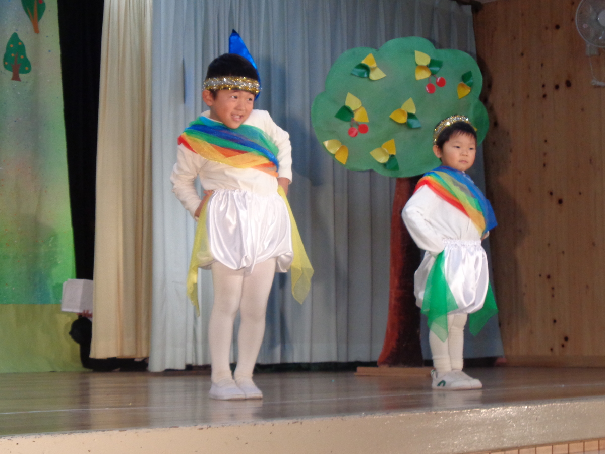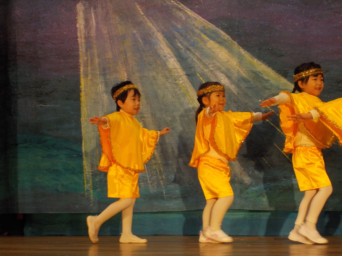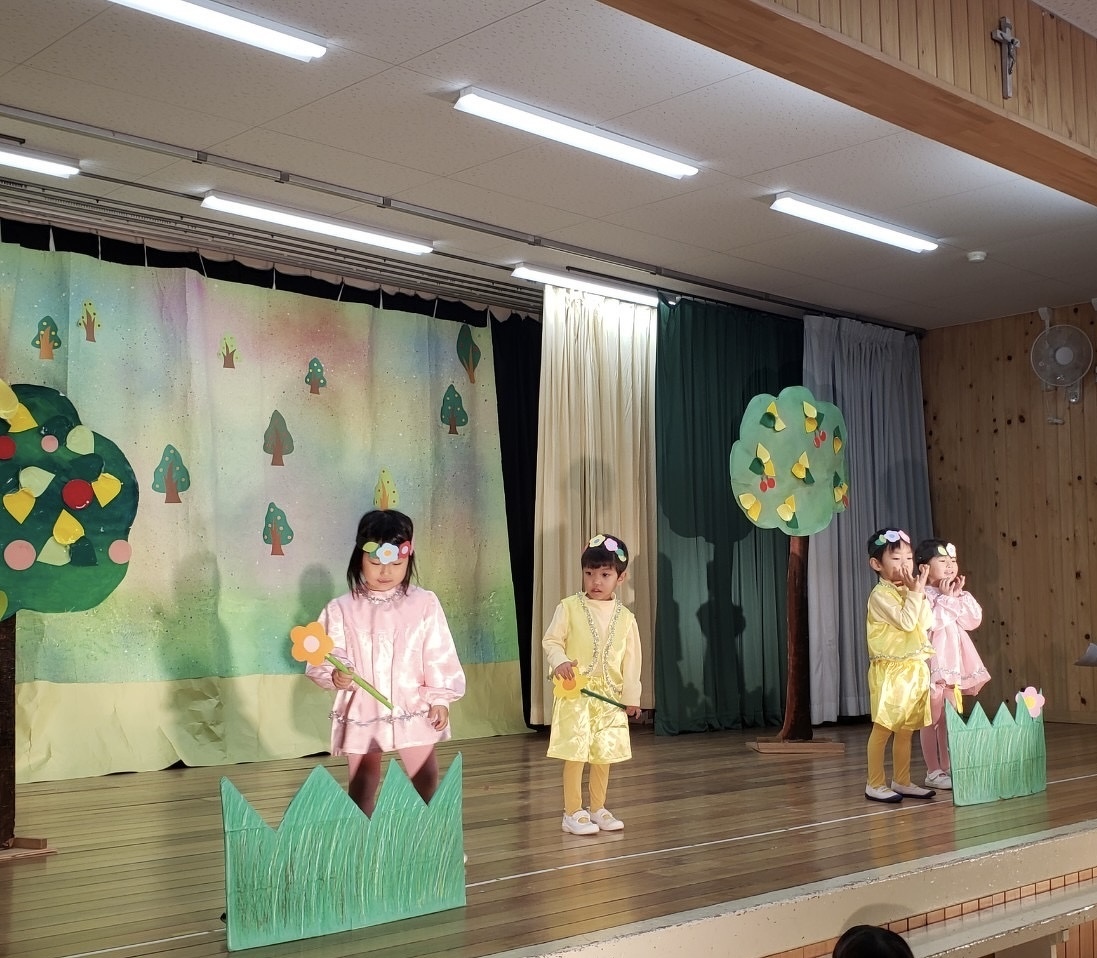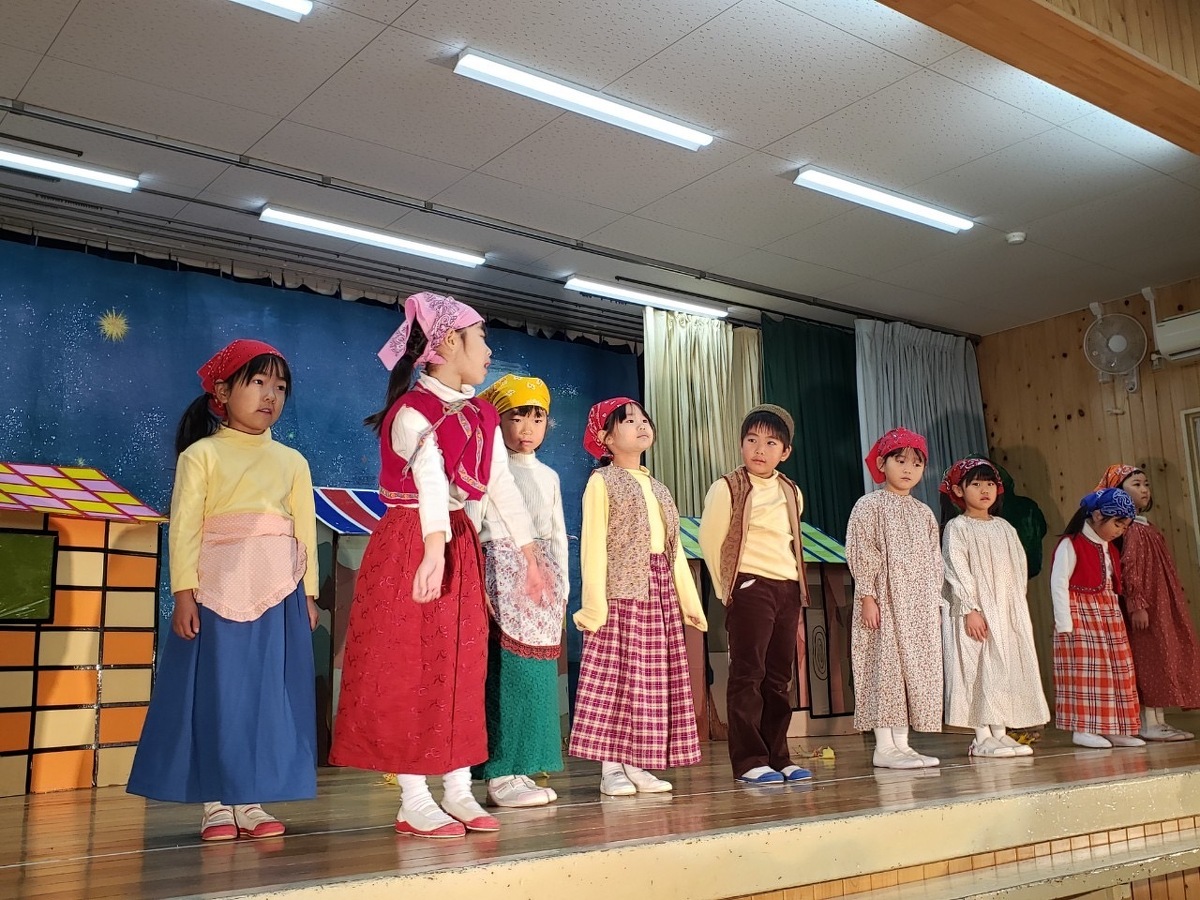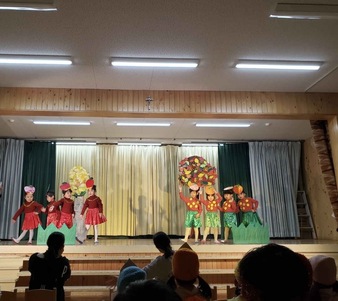 第一部は、年少児、年中児による天地創造です。音楽に合わせてダンスを踊ったり、セリフを言ったりして、世界の始まり、春夏秋冬を表現しました。そして、第二部はご降誕。年長児による聖劇を行いました。子どもたちそれぞれ役になりきって、堂々と表現することができました。