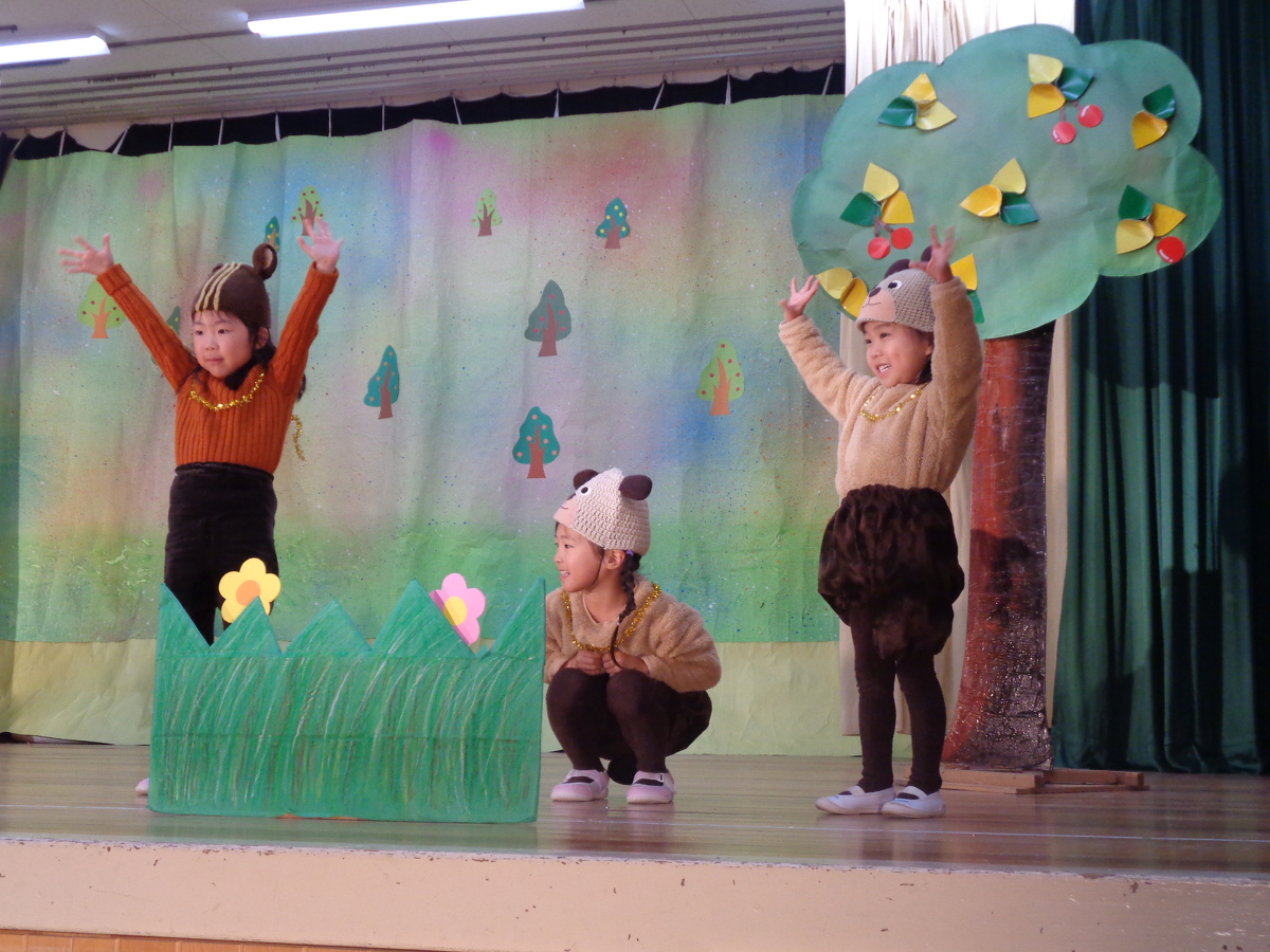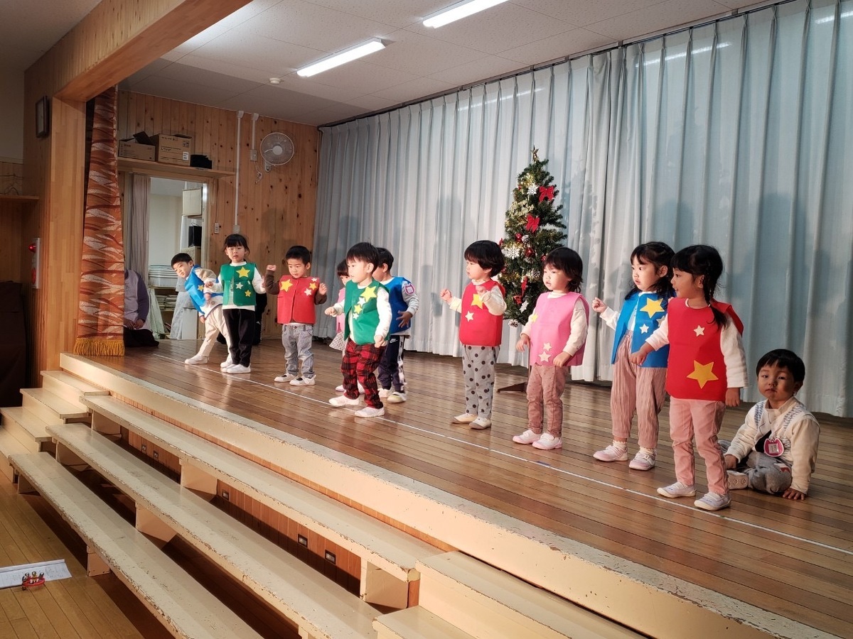 クリスマス会を行いました。まず始めのオープニングは満3歳児によるダンス「森のクリスマス」元気いっぱい楽しく踊ることができました。