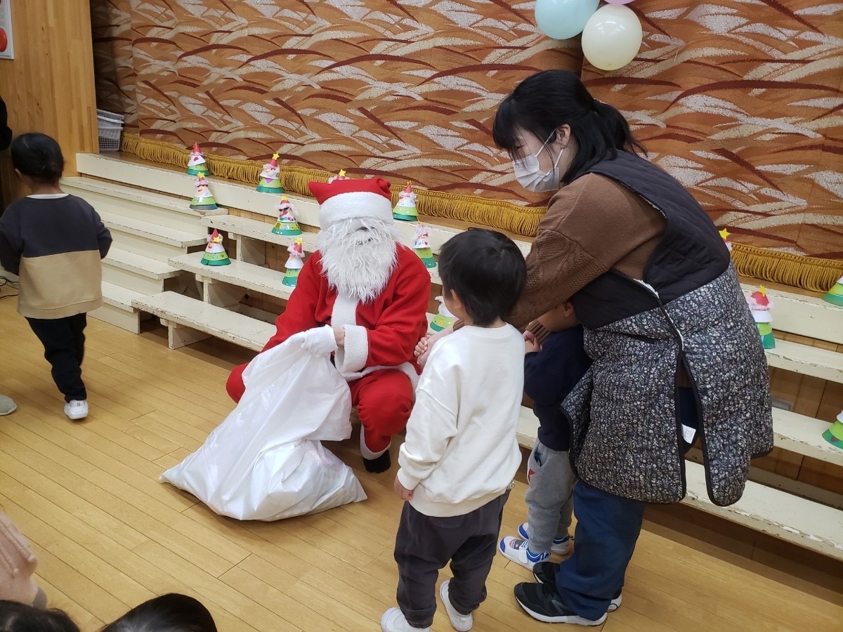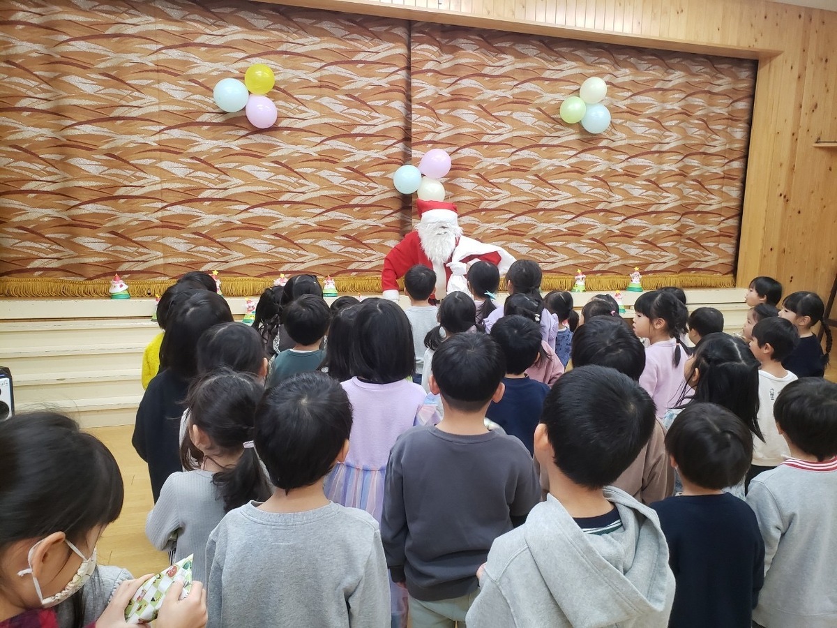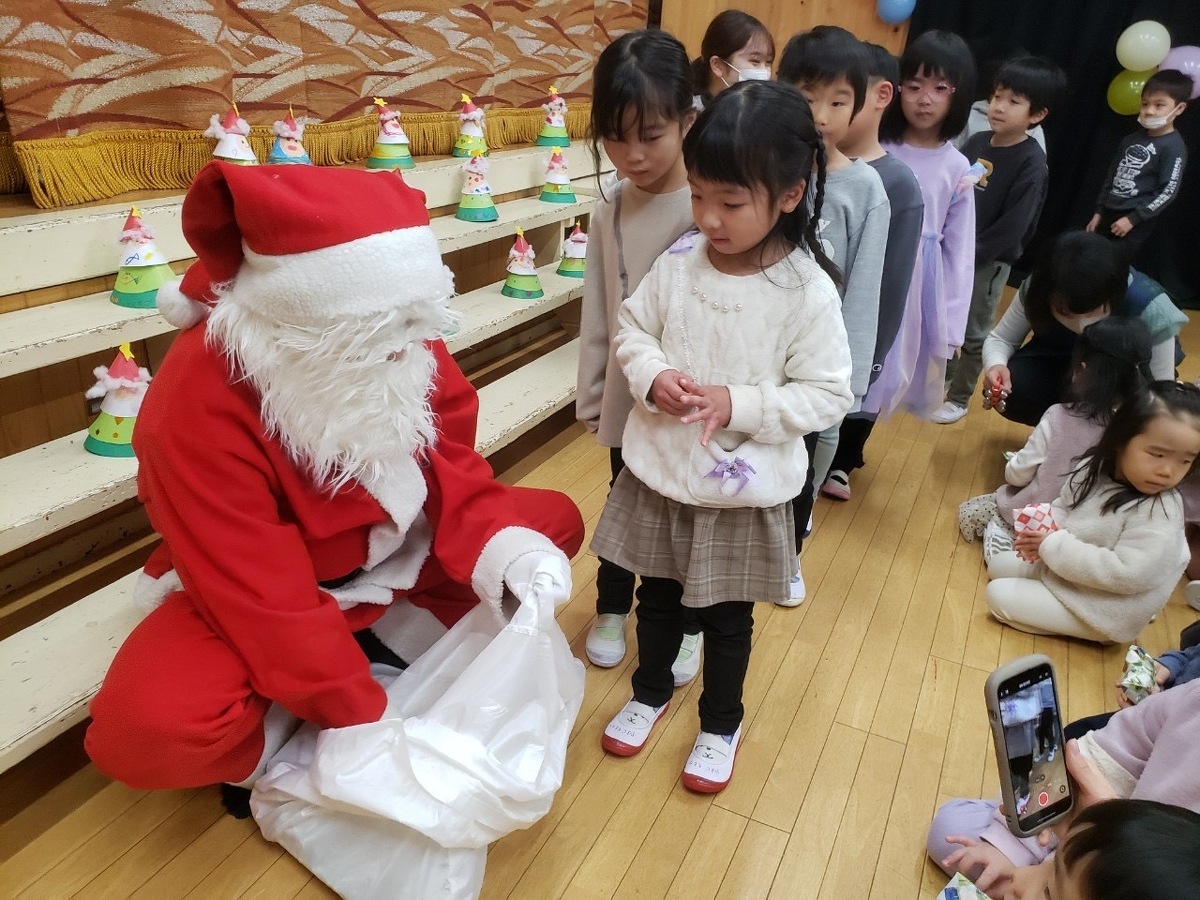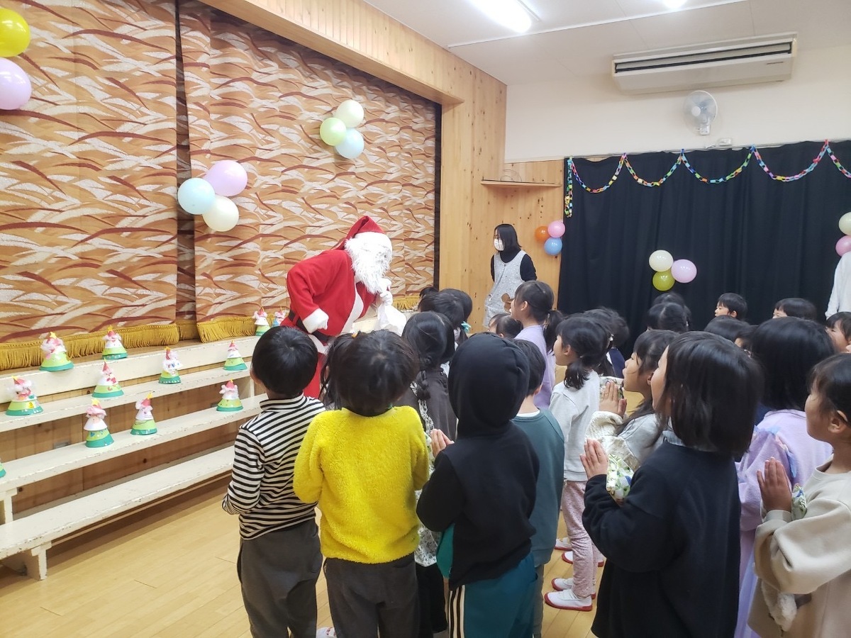 先日みんなで頑張ったクリスマス会お空から見てたよと言ってくれたサンタさんにプレゼントをいただきました。その後は、サンタさんに歌のプレゼント。色んな幼稚園に遊びに行っているけれどお礼に歌を歌ってもらったのは初めてと、とても喜んでくれました。