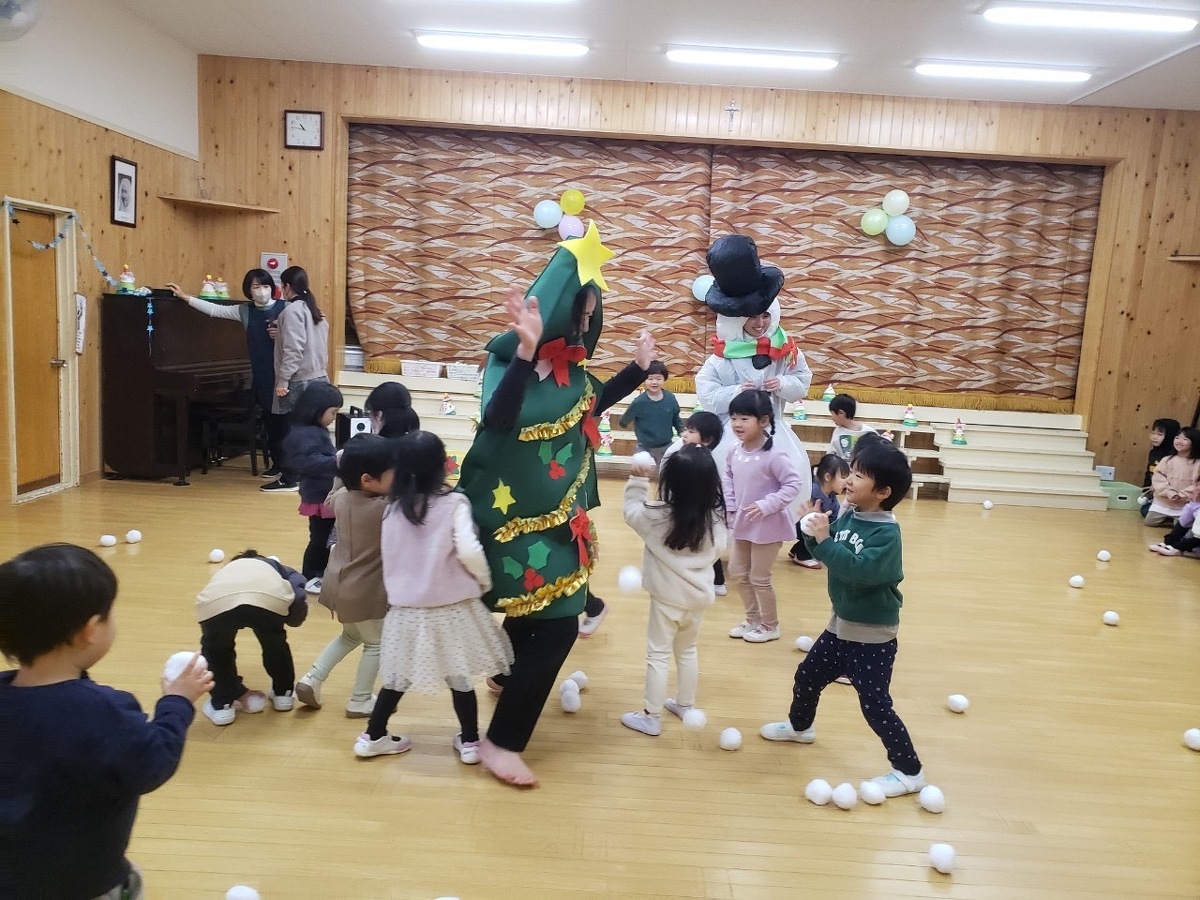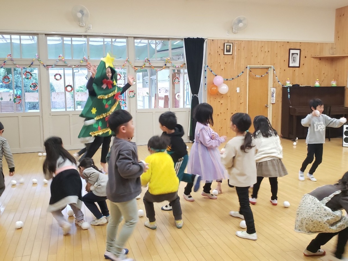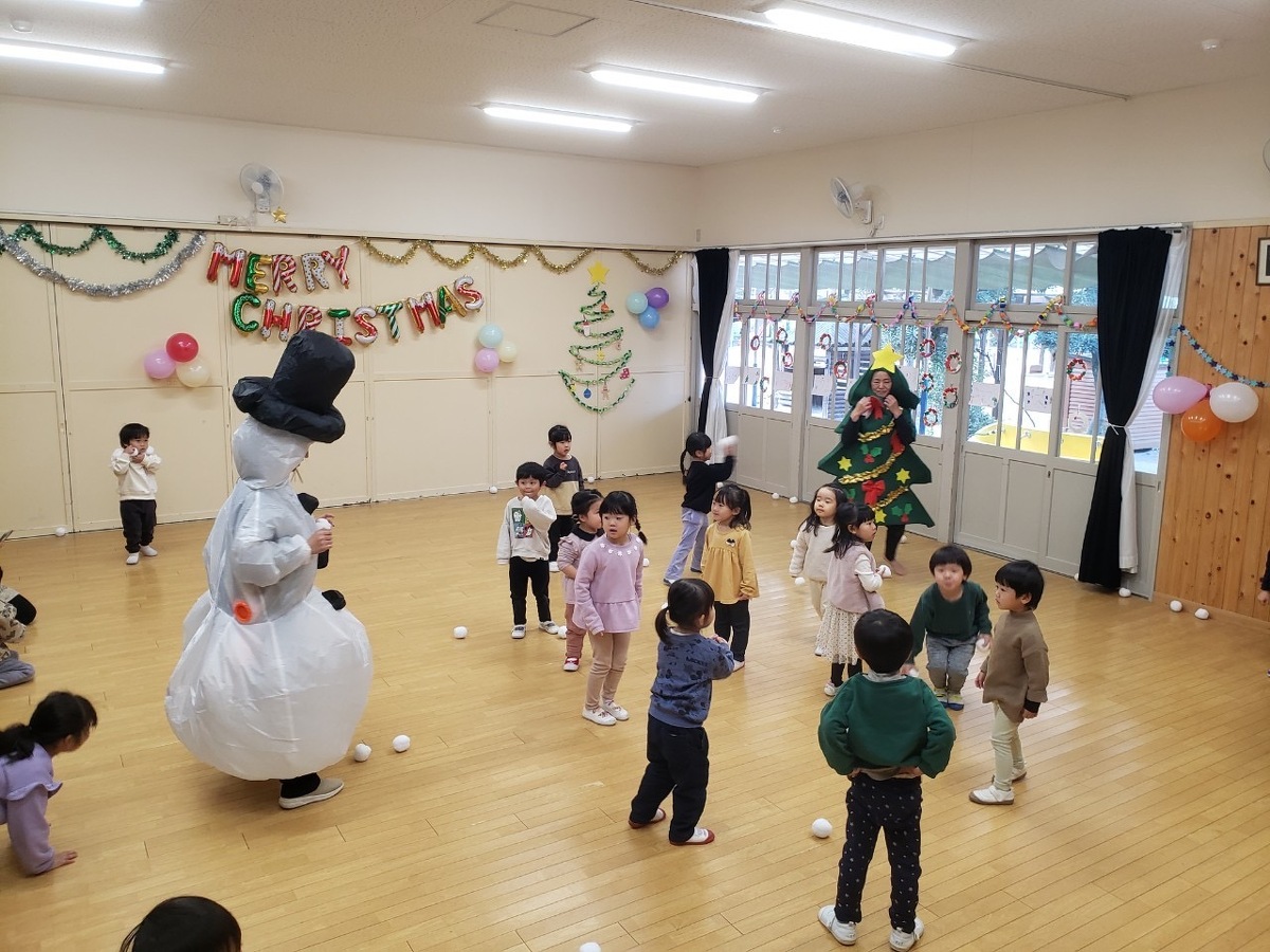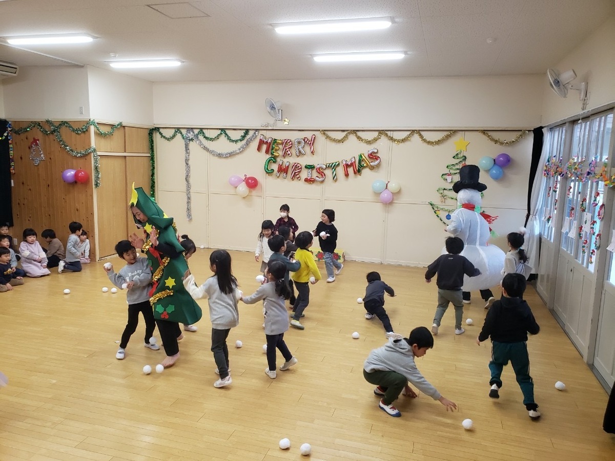 そして、サンタさんが帰った後は雪だるまとクリスマスツリーと一緒に雪合戦大会!みんなで一生懸命雪を投げて大盛り上がりでした!最後はみんなでじゃんけん列車をして楽しく過ごしました。