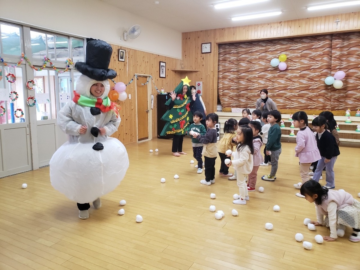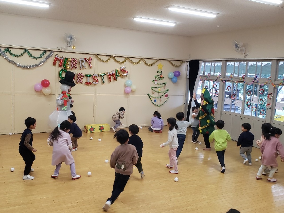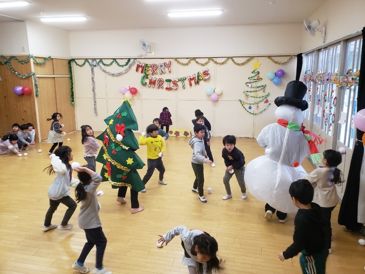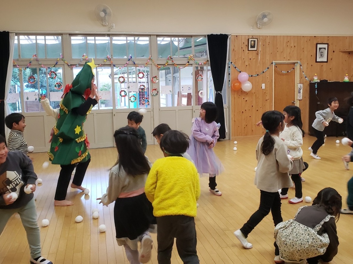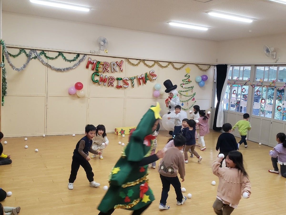 そして、サンタさんが帰った後は雪だるまとクリスマスツリーと一緒に雪合戦大会!みんなで一生懸命雪を投げて大盛り上がりでした!最後はみんなでじゃんけん列車をして楽しく過ごしました。