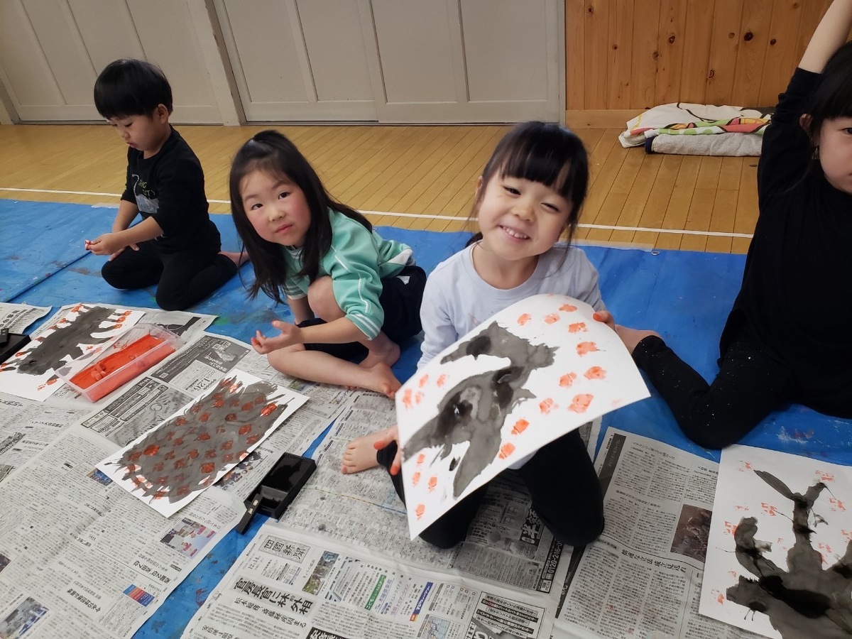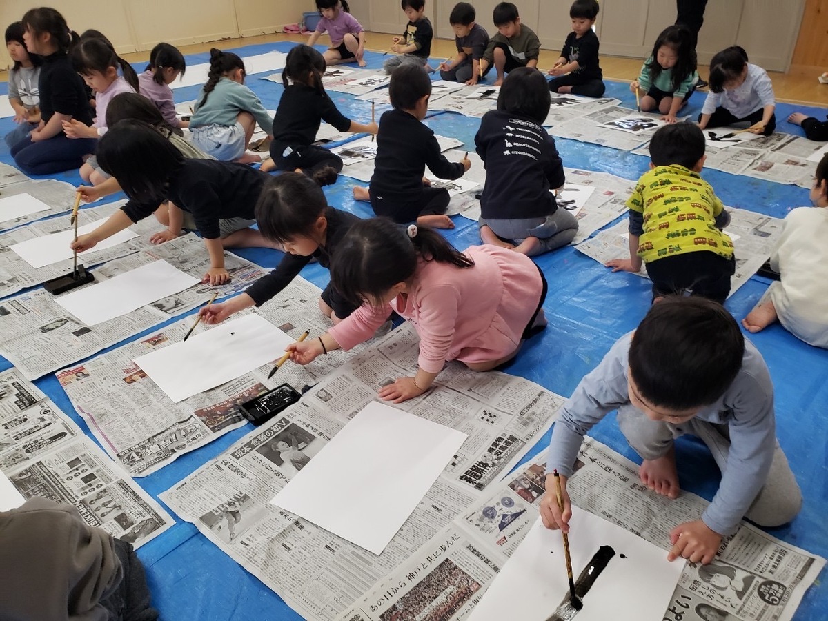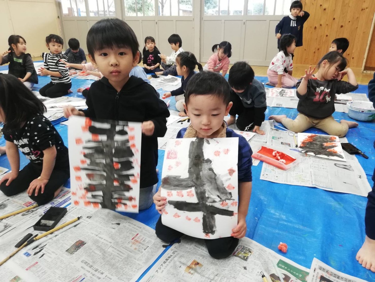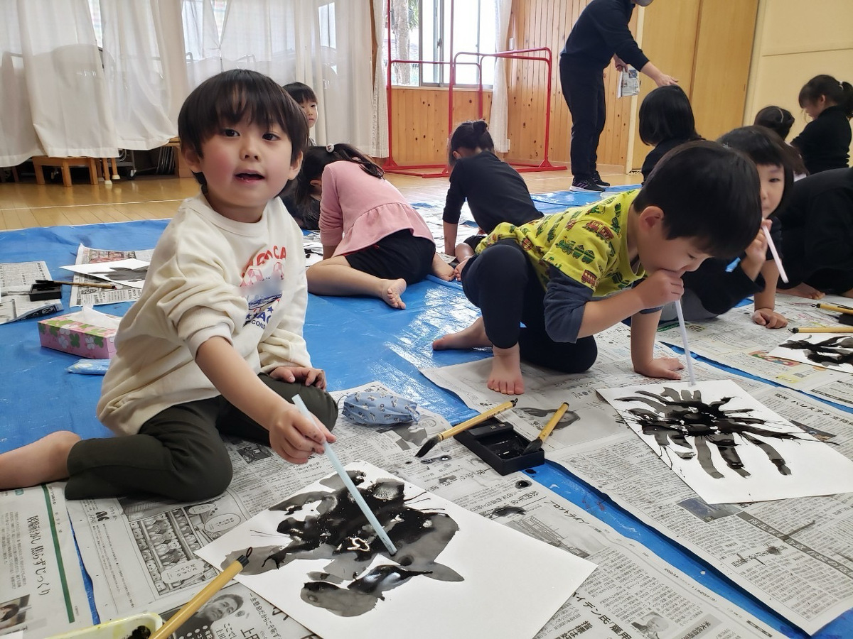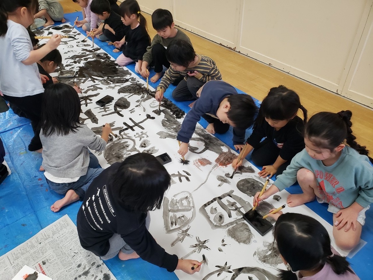 Bグループ(4歳児)のアートの日がありました。 2024年01月17日(水) Bグループ(4歳児)のアートの日。1月初めということで、みんなで書き初めを行いました。実際に硯に水を少し入れて墨を自分たちで磨りました。そして、筆を使って書いた後は、ストローでふいたり、スポンジで作った梅の花のスタンプを使って、一人ひとりのオリジナルの木が出来上がりました。最後は、みんなで思いっきり大きな紙にたくさん書いて、とっても楽しかったですね! 後藤先生、楽しい時間をありがとうございました。