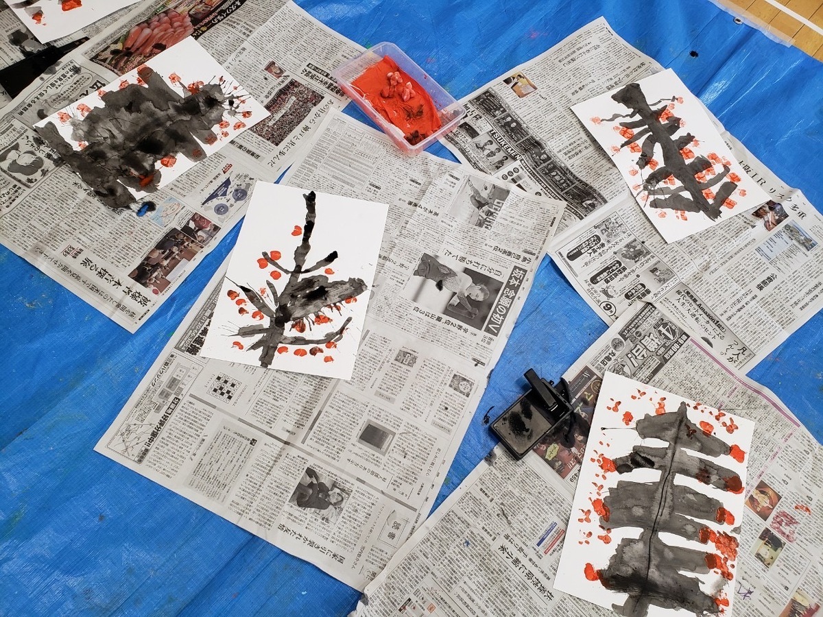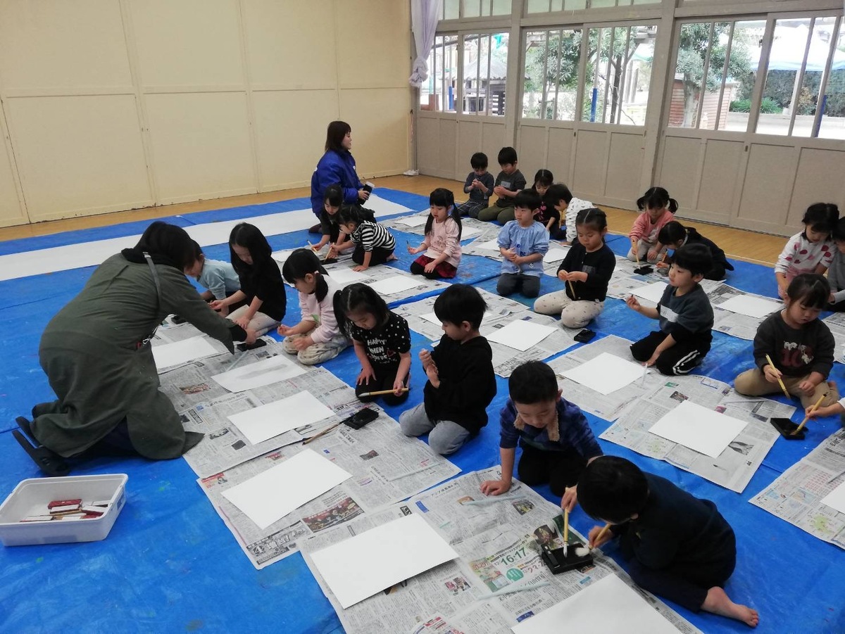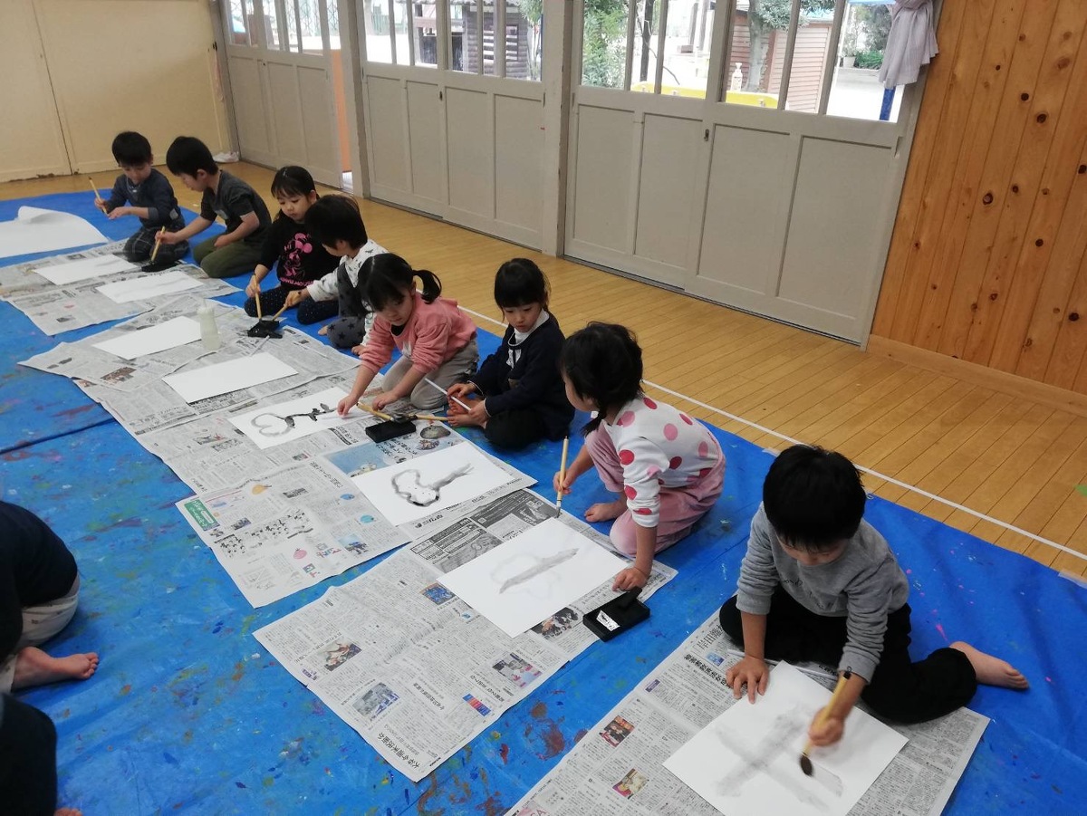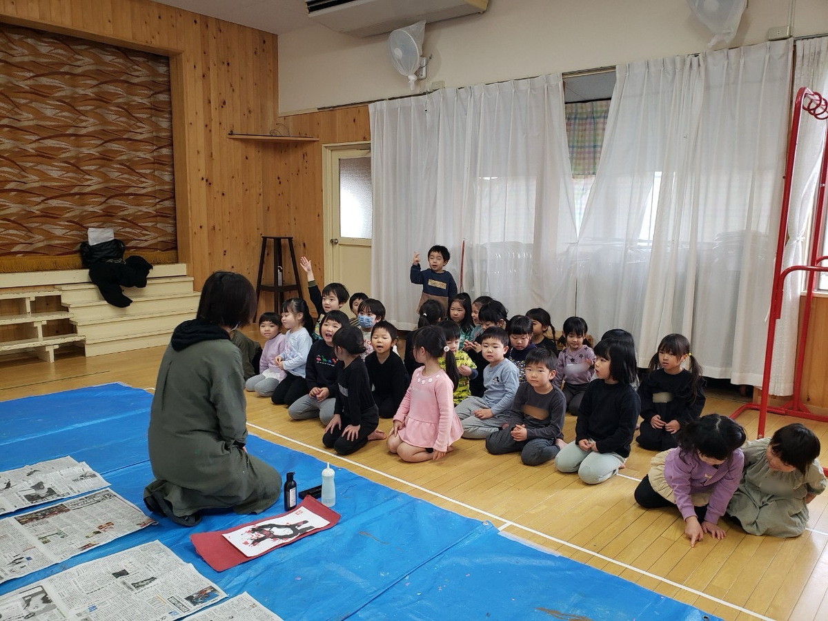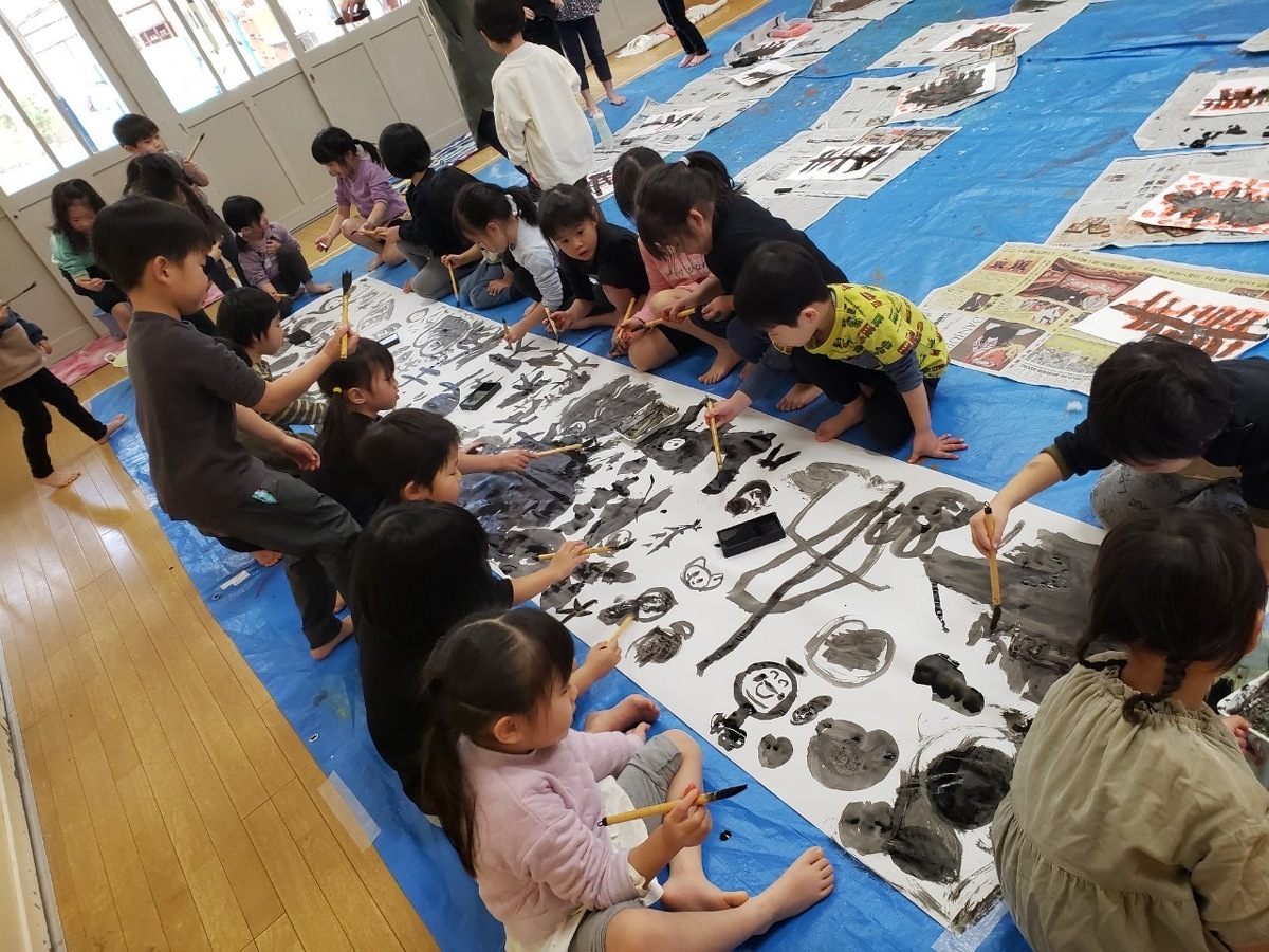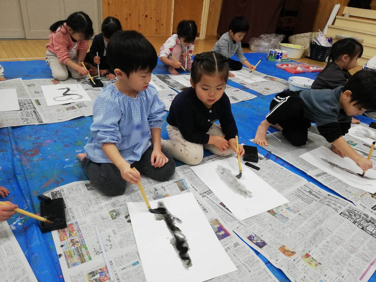 Bグループ(4歳児)のアートの日がありました。 2024年01月17日(水) Bグループ(4歳児)のアートの日。1月初めということで、みんなで書き初めを行いました。実際に硯に水を少し入れて墨を自分たちで磨りました。そして、筆を使って書いた後は、ストローでふいたり、スポンジで作った梅の花のスタンプを使って、一人ひとりのオリジナルの木が出来上がりました。最後は、みんなで思いっきり大きな紙にたくさん書いて、とっても楽しかったですね! 後藤先生、楽しい時間をありがとうございました。
