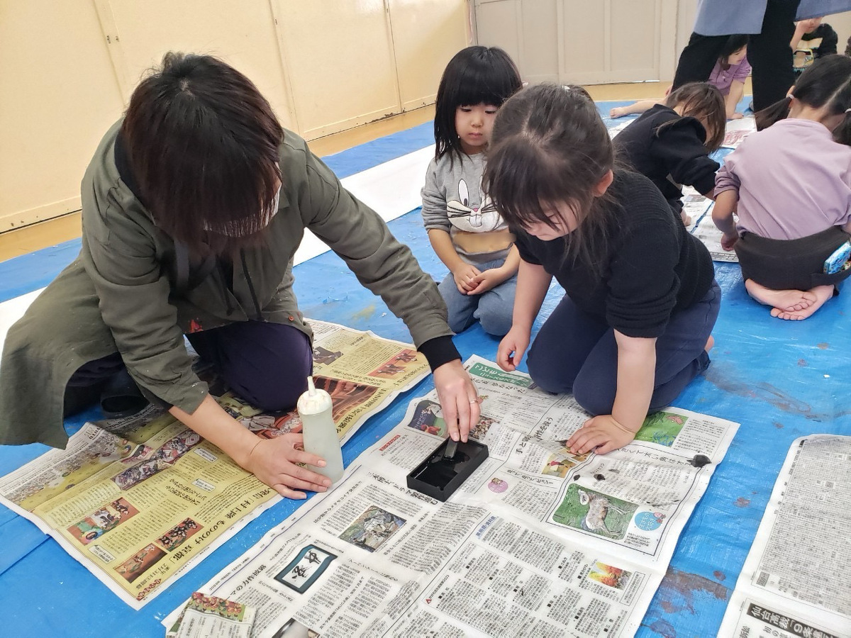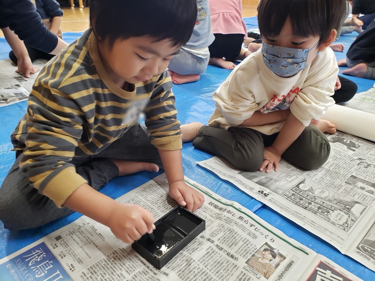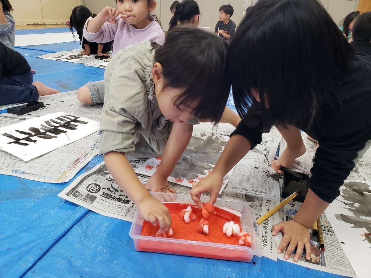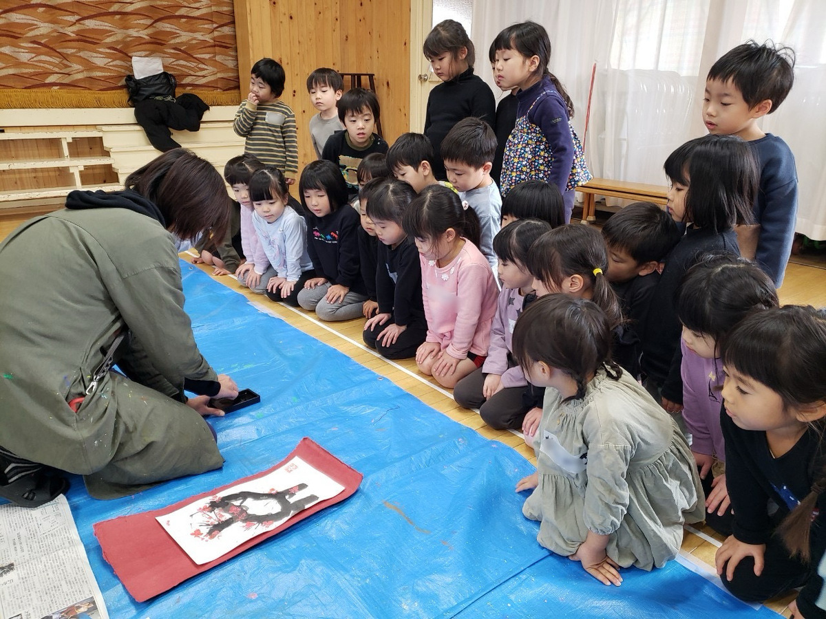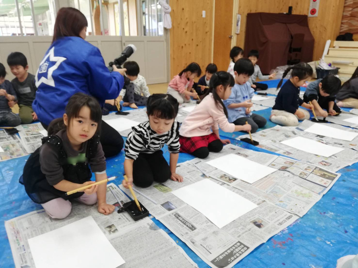 Bグループ(4歳児)のアートの日がありました。 2024年01月17日(水) Bグループ(4歳児)のアートの日。1月初めということで、みんなで書き初めを行いました。実際に硯に水を少し入れて墨を自分たちで磨りました。そして、筆を使って書いた後は、ストローでふいたり、スポンジで作った梅の花のスタンプを使って、一人ひとりのオリジナルの木が出来上がりました。最後は、みんなで思いっきり大きな紙にたくさん書いて、とっても楽しかったですね! 後藤先生、楽しい時間をありがとうございました。