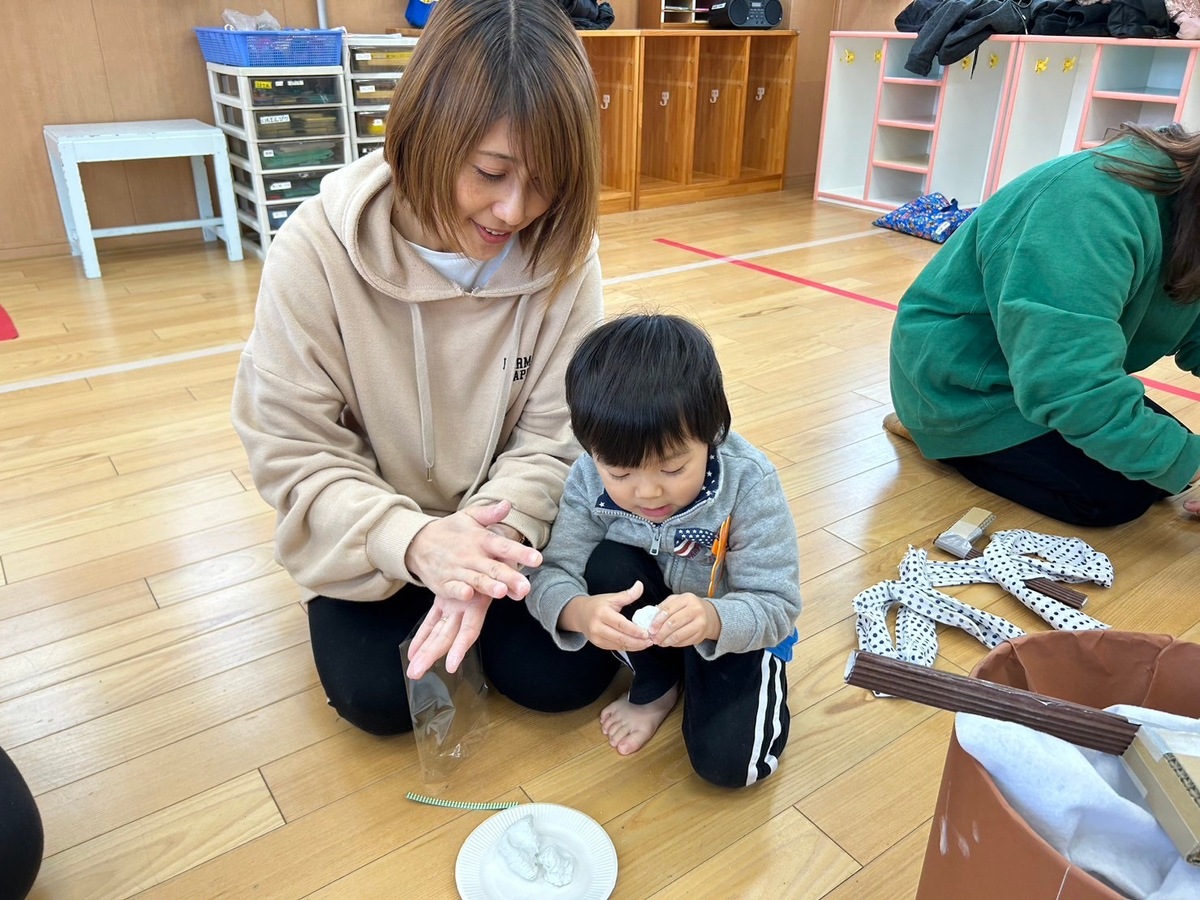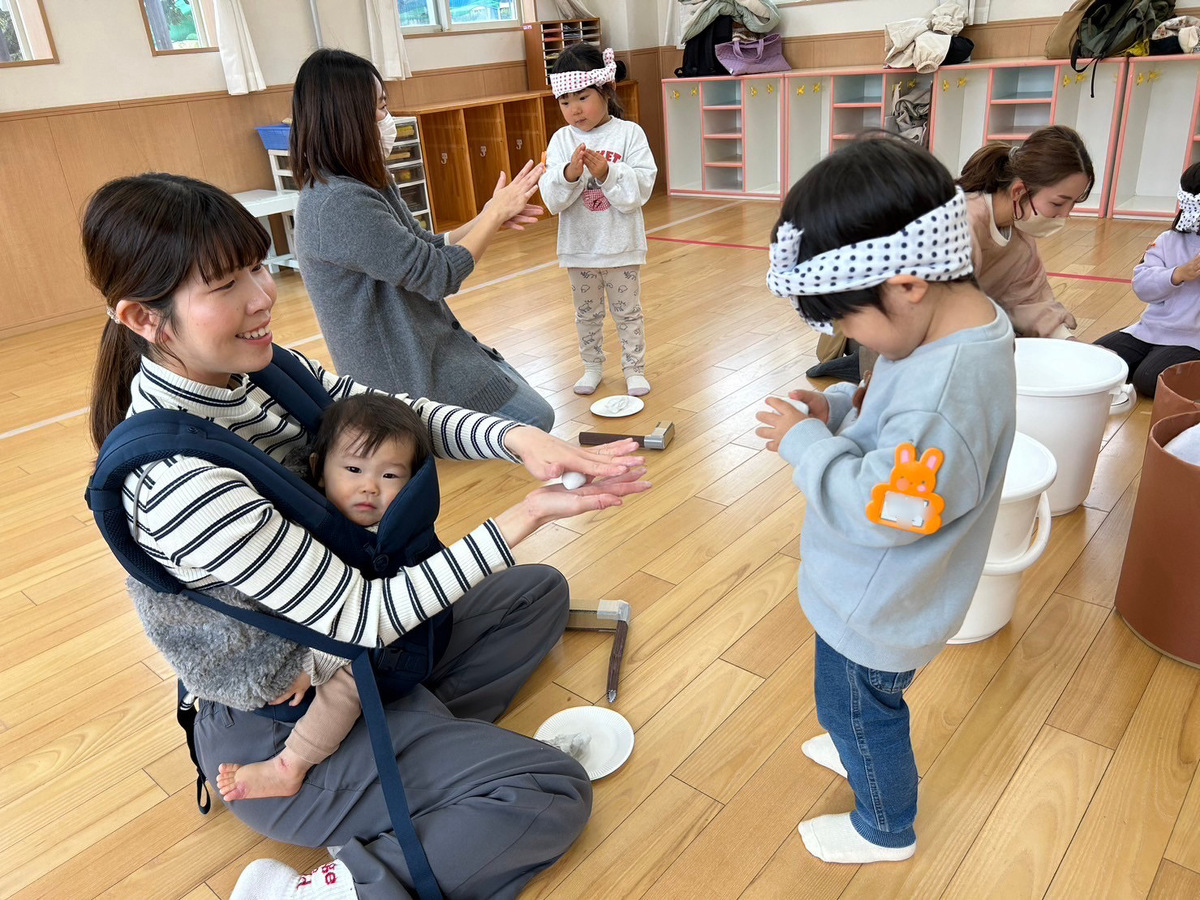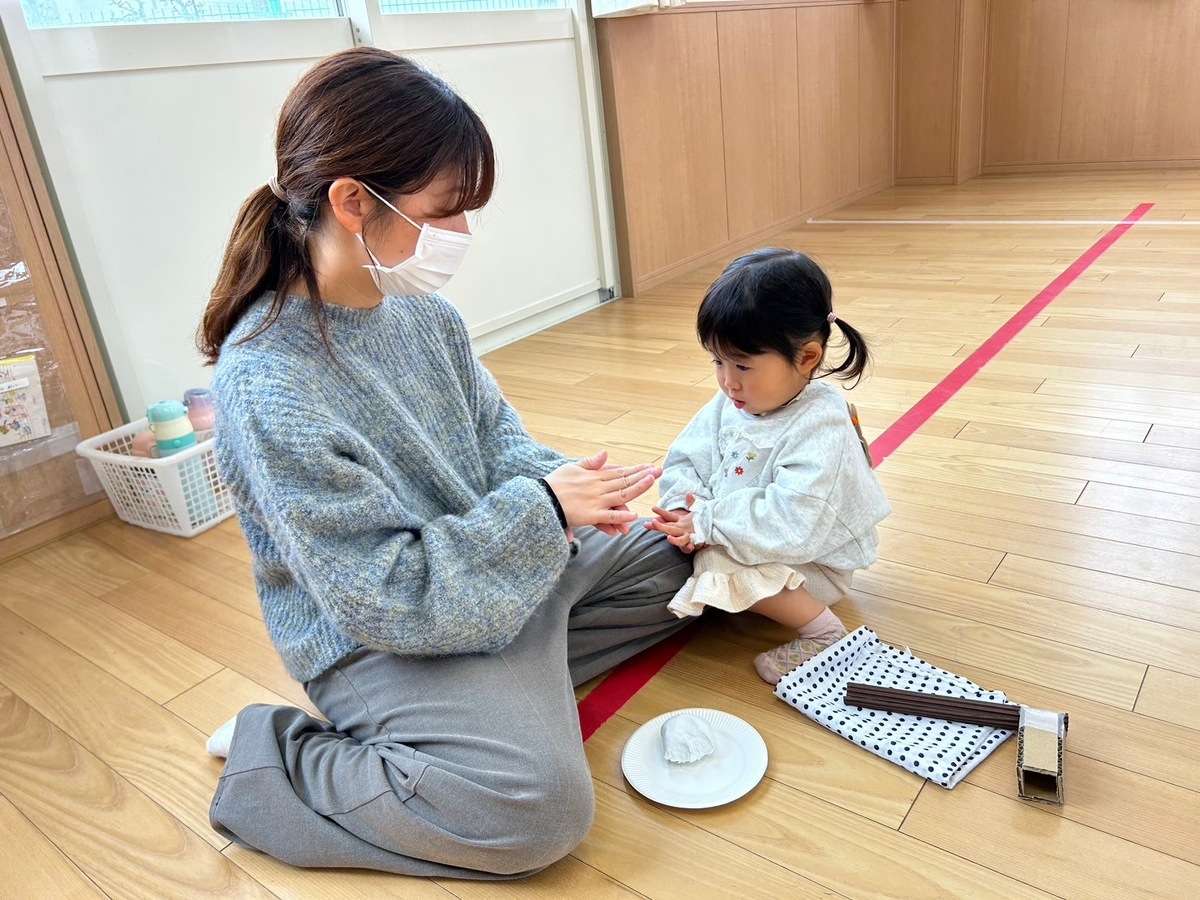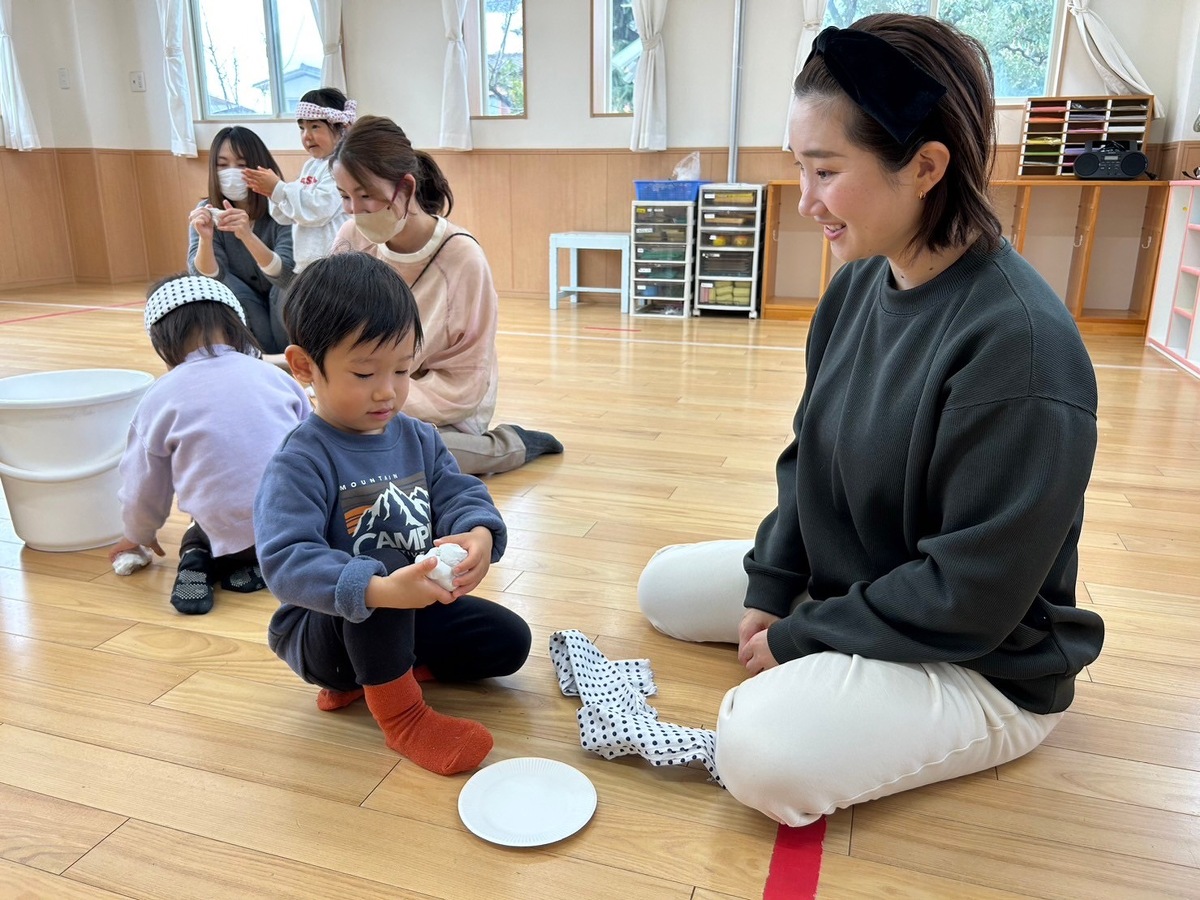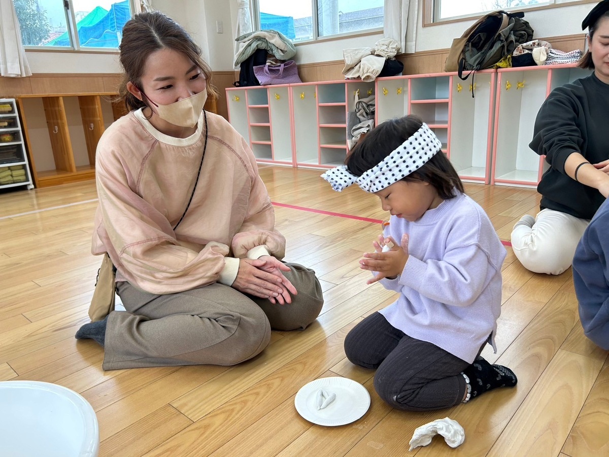 つぼみクラスでリトミックを行いました。 2024年01月18日(木) つぼみクラスでリトミックを行いました。今回は、一月ということで、みんなで餅つき!子どもたちは小さい杵を使って、みんなで楽しくお餅つきをしました。すると、園長先生の大きな杵にお餅がくっついて、「びよーーん」と伸びてきました!そのお餅を分けてもらって、今度はお家の人と一緒にコロコロたくさんお餅を丸めて作りました。お皿に素敵なお餅がたくさんできましたね!楽しい時間を過ごすことができました。