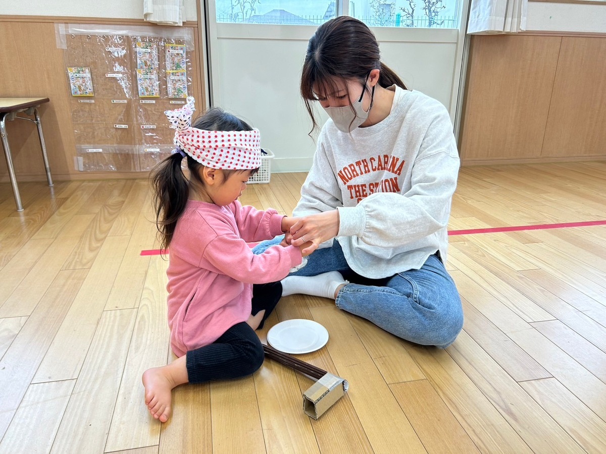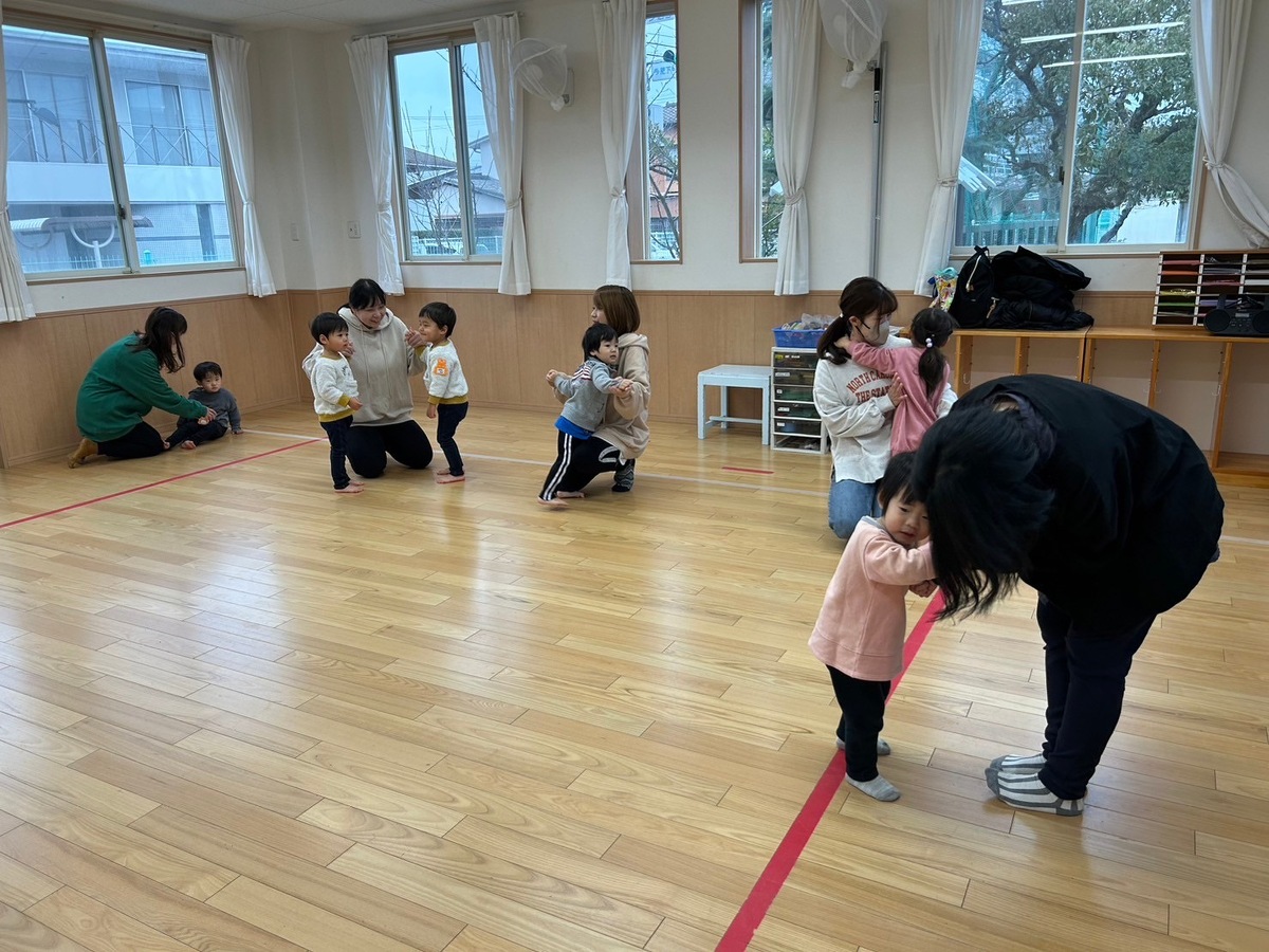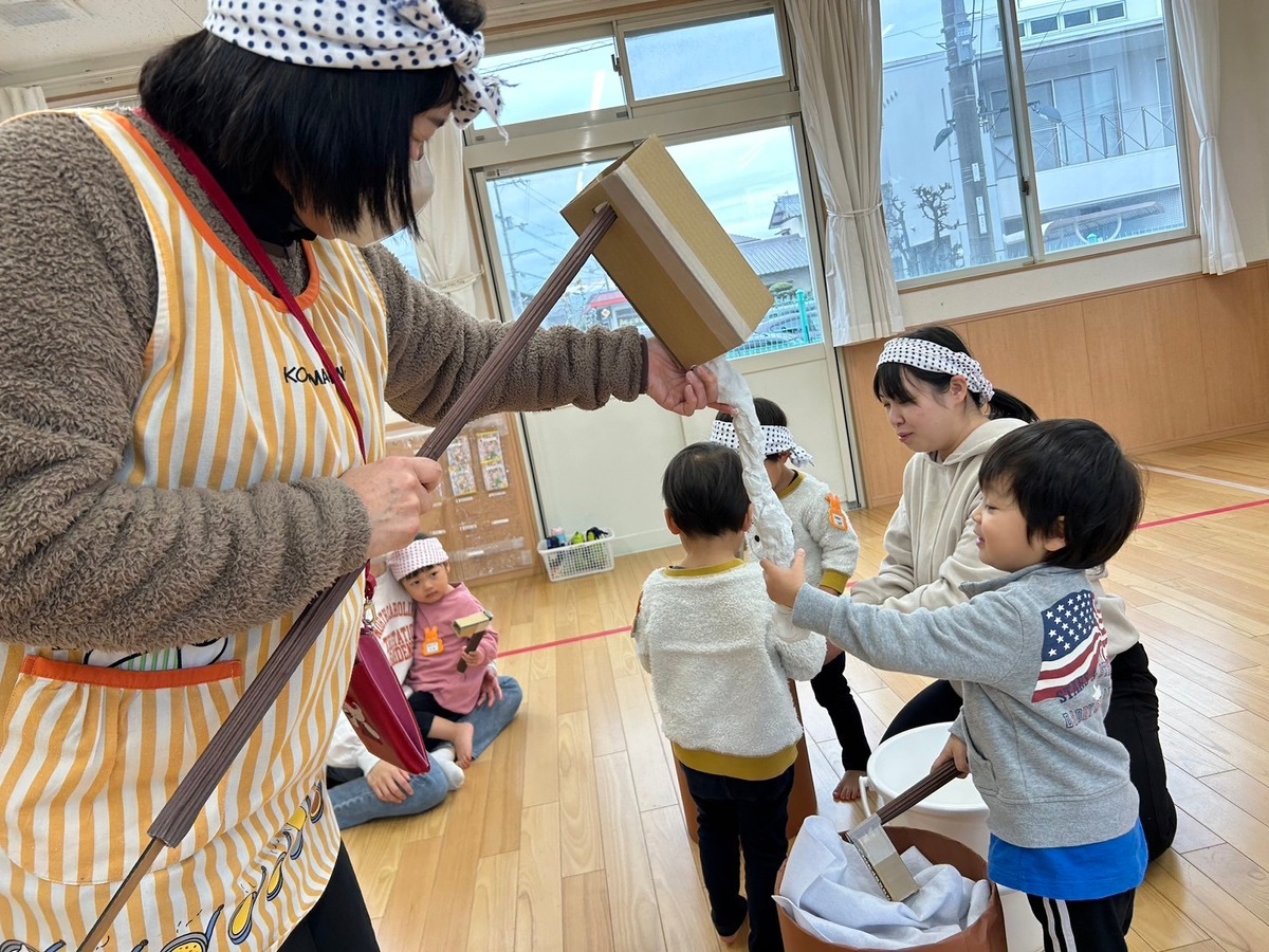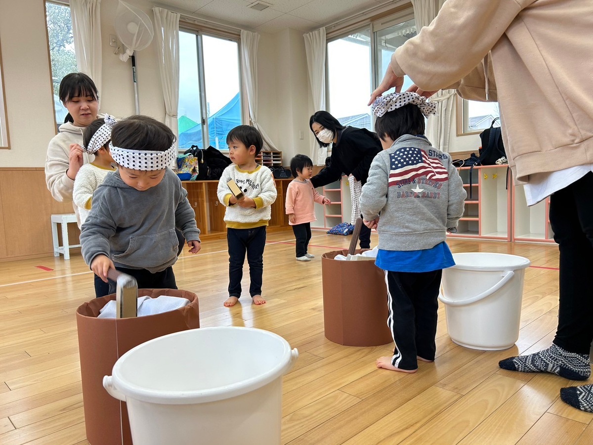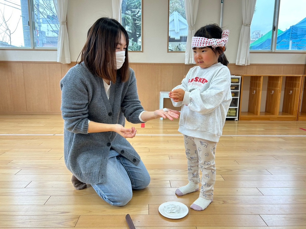 つぼみクラスでリトミックを行いました。 2024年01月18日(木) つぼみクラスでリトミックを行いました。今回は、一月ということで、みんなで餅つき!子どもたちは小さい杵を使って、みんなで楽しくお餅つきをしました。すると、園長先生の大きな杵にお餅がくっついて、「びよーーん」と伸びてきました!そのお餅を分けてもらって、今度はお家の人と一緒にコロコロたくさんお餅を丸めて作りました。お皿に素敵なお餅がたくさんできましたね!楽しい時間を過ごすことができました。