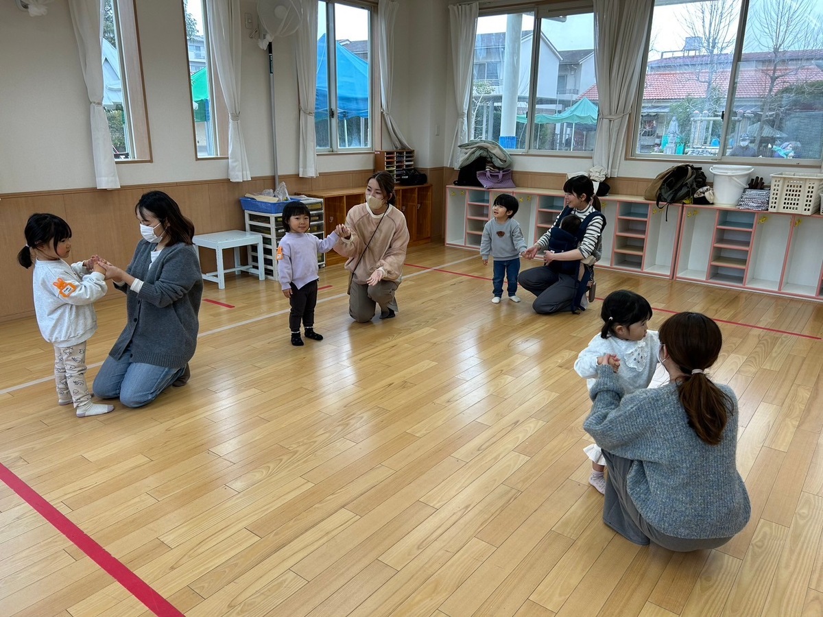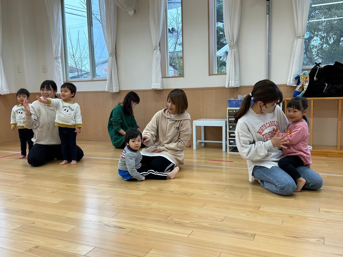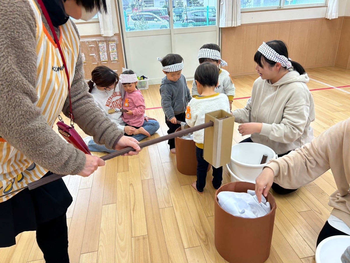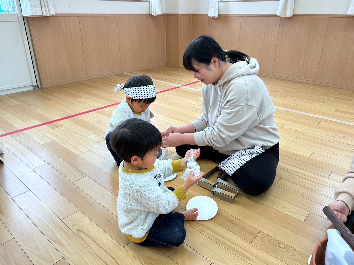 つぼみクラスでリトミックを行いました。 2024年01月18日(木) つぼみクラスでリトミックを行いました。今回は、一月ということで、みんなで餅つき!子どもたちは小さい杵を使って、みんなで楽しくお餅つきをしました。すると、園長先生の大きな杵にお餅がくっついて、「びよーーん」と伸びてきました!そのお餅を分けてもらって、今度はお家の人と一緒にコロコロたくさんお餅を丸めて作りました。お皿に素敵なお餅がたくさんできましたね!楽しい時間を過ごすことができました。
