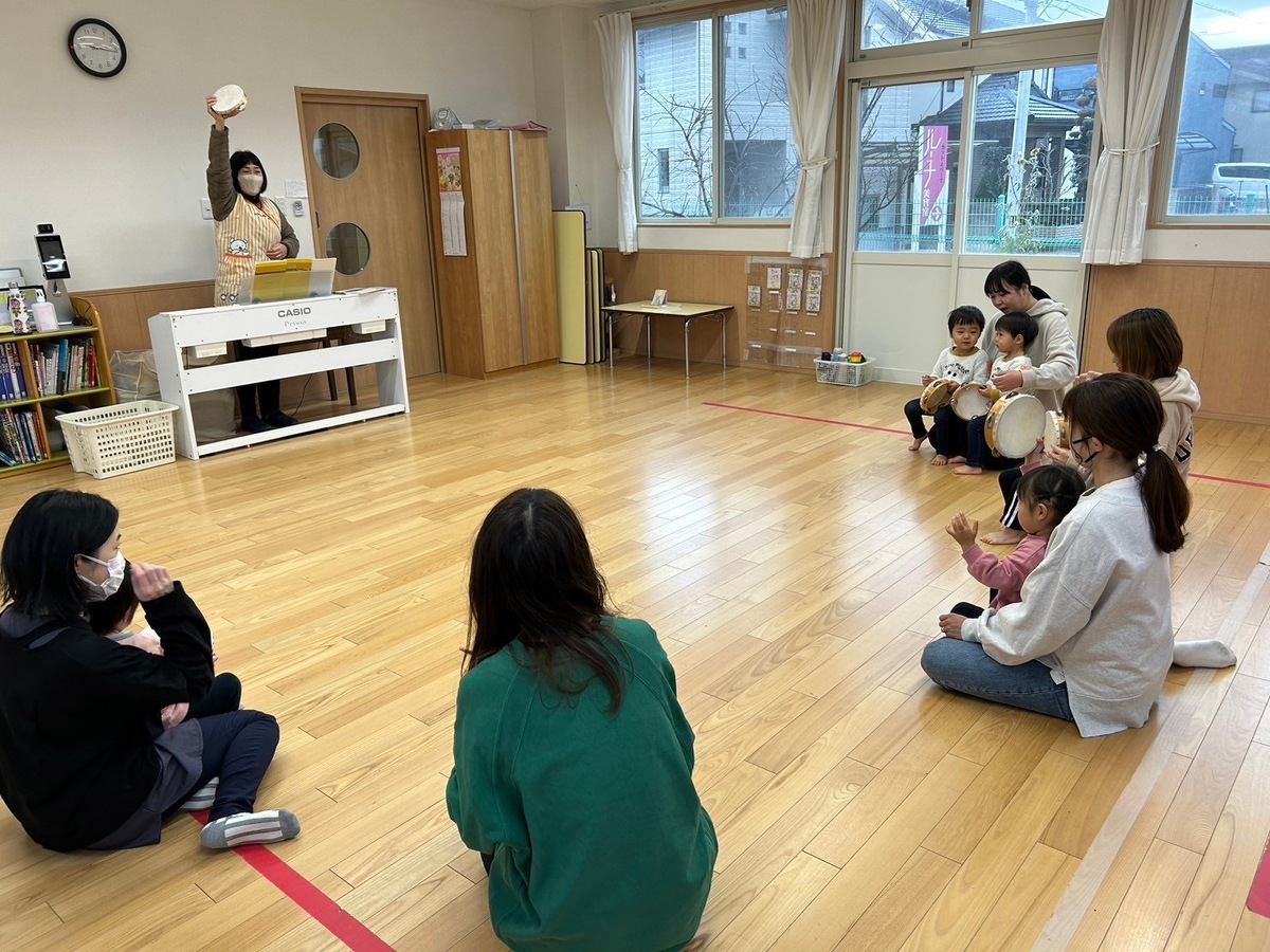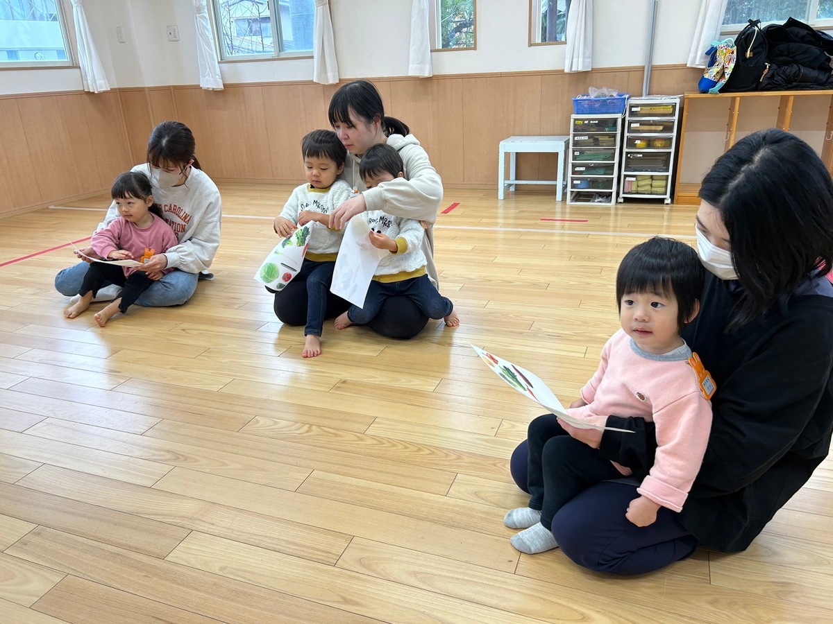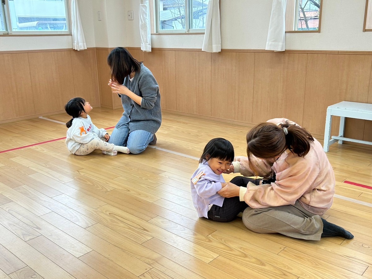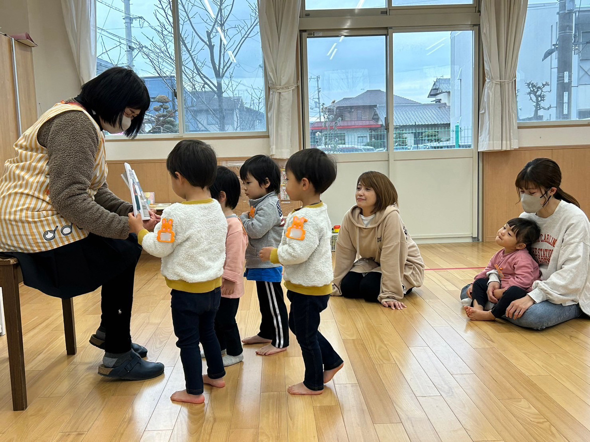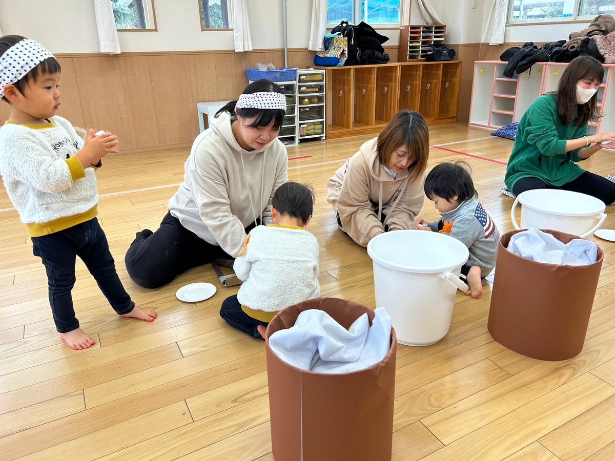 つぼみクラスでリトミックを行いました。 2024年01月18日(木) つぼみクラスでリトミックを行いました。今回は、一月ということで、みんなで餅つき!子どもたちは小さい杵を使って、みんなで楽しくお餅つきをしました。すると、園長先生の大きな杵にお餅がくっついて、「びよーーん」と伸びてきました!そのお餅を分けてもらって、今度はお家の人と一緒にコロコロたくさんお餅を丸めて作りました。お皿に素敵なお餅がたくさんできましたね!楽しい時間を過ごすことができました。