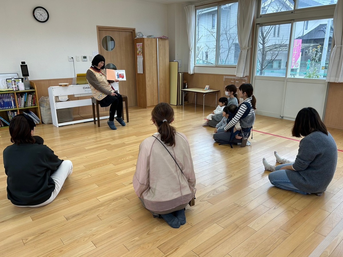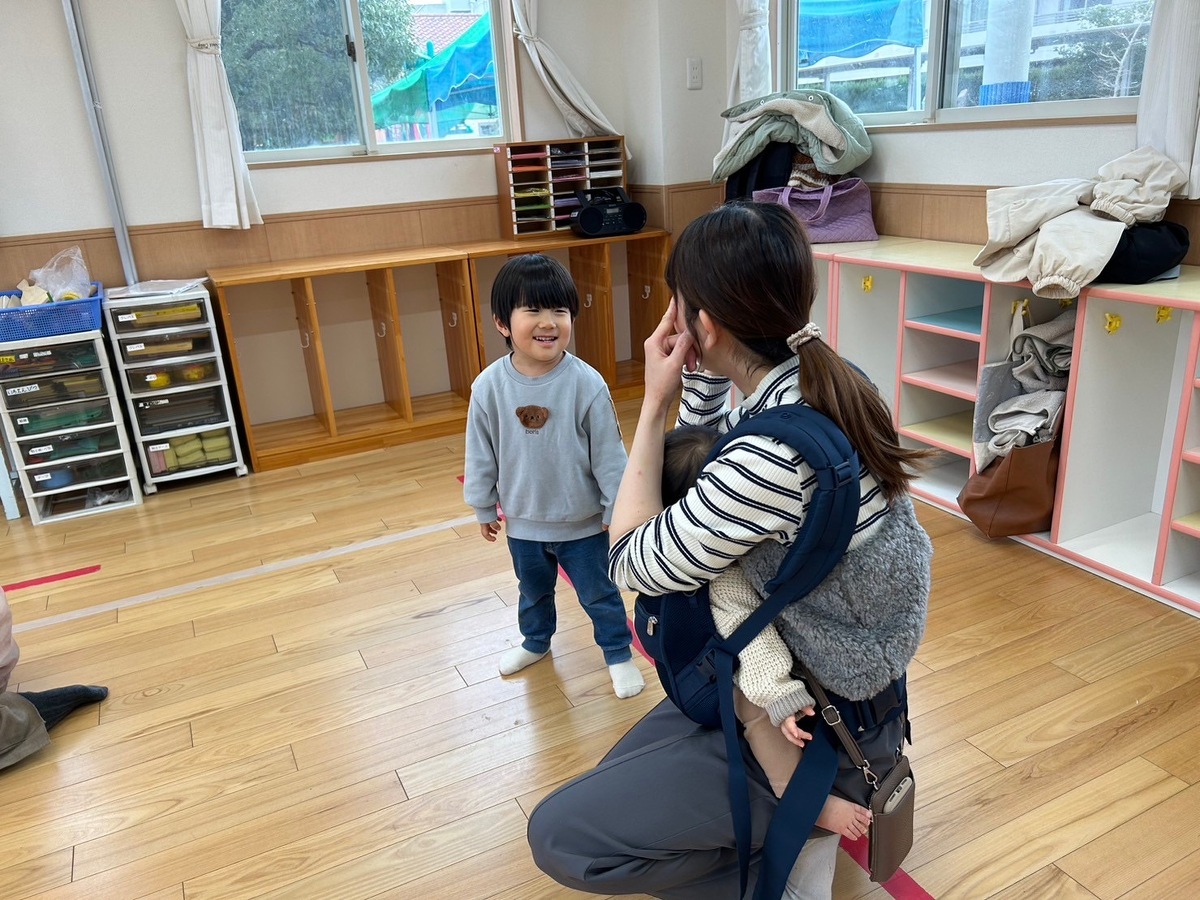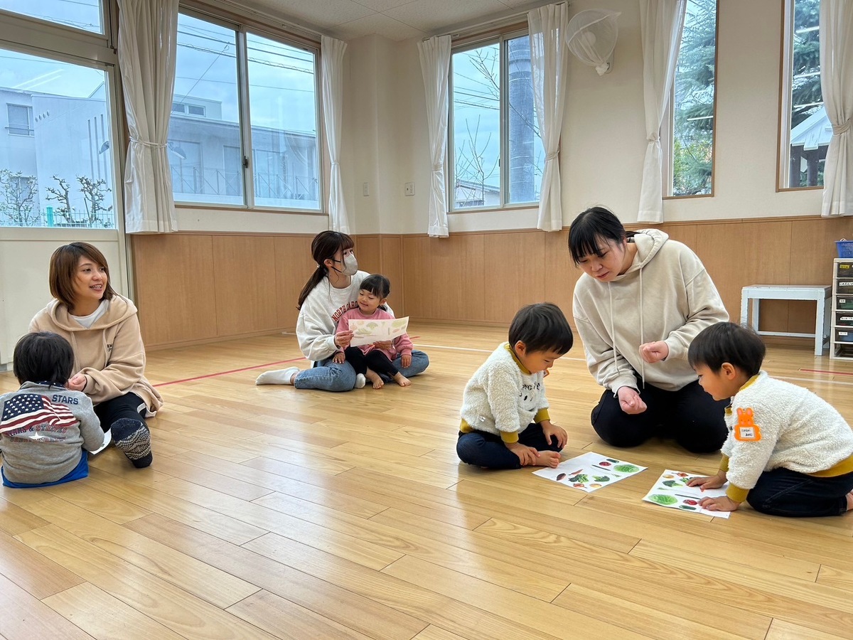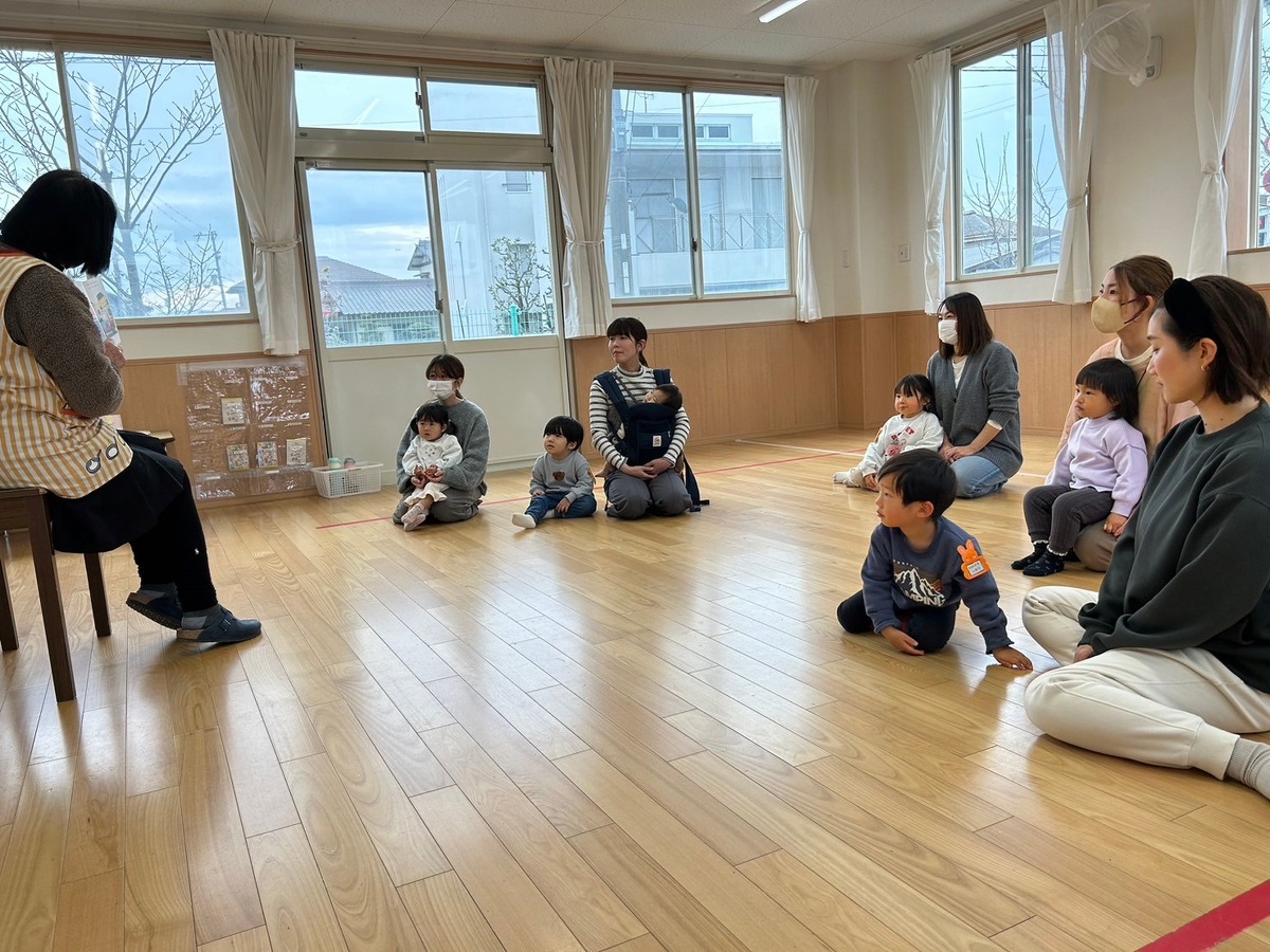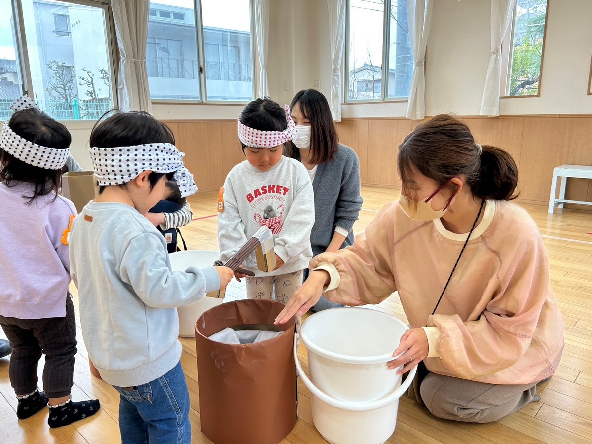 つぼみクラスでリトミックを行いました。 2024年01月18日(木) つぼみクラスでリトミックを行いました。今回は、一月ということで、みんなで餅つき!子どもたちは小さい杵を使って、みんなで楽しくお餅つきをしました。すると、園長先生の大きな杵にお餅がくっついて、「びよーーん」と伸びてきました!そのお餅を分けてもらって、今度はお家の人と一緒にコロコロたくさんお餅を丸めて作りました。お皿に素敵なお餅がたくさんできましたね!楽しい時間を過ごすことができました。