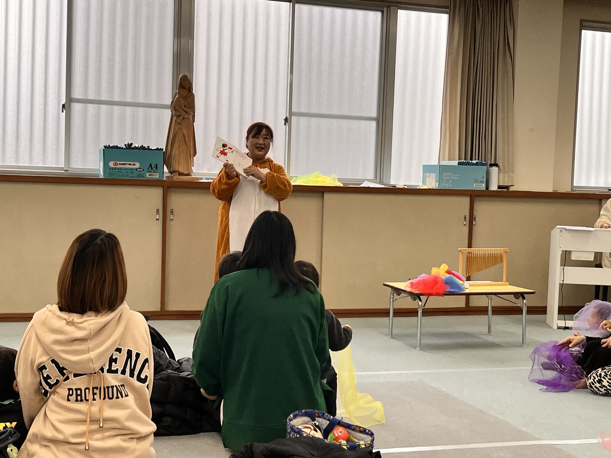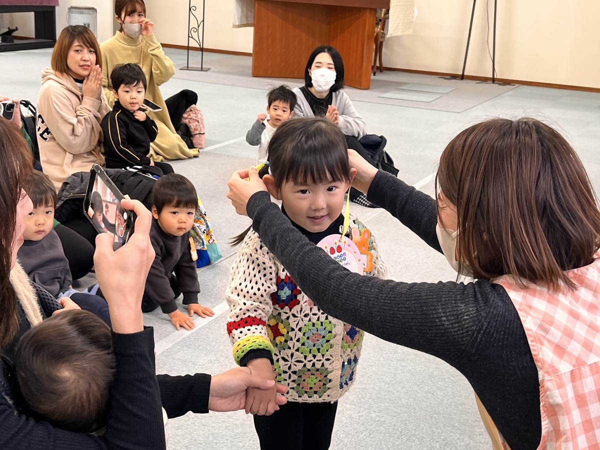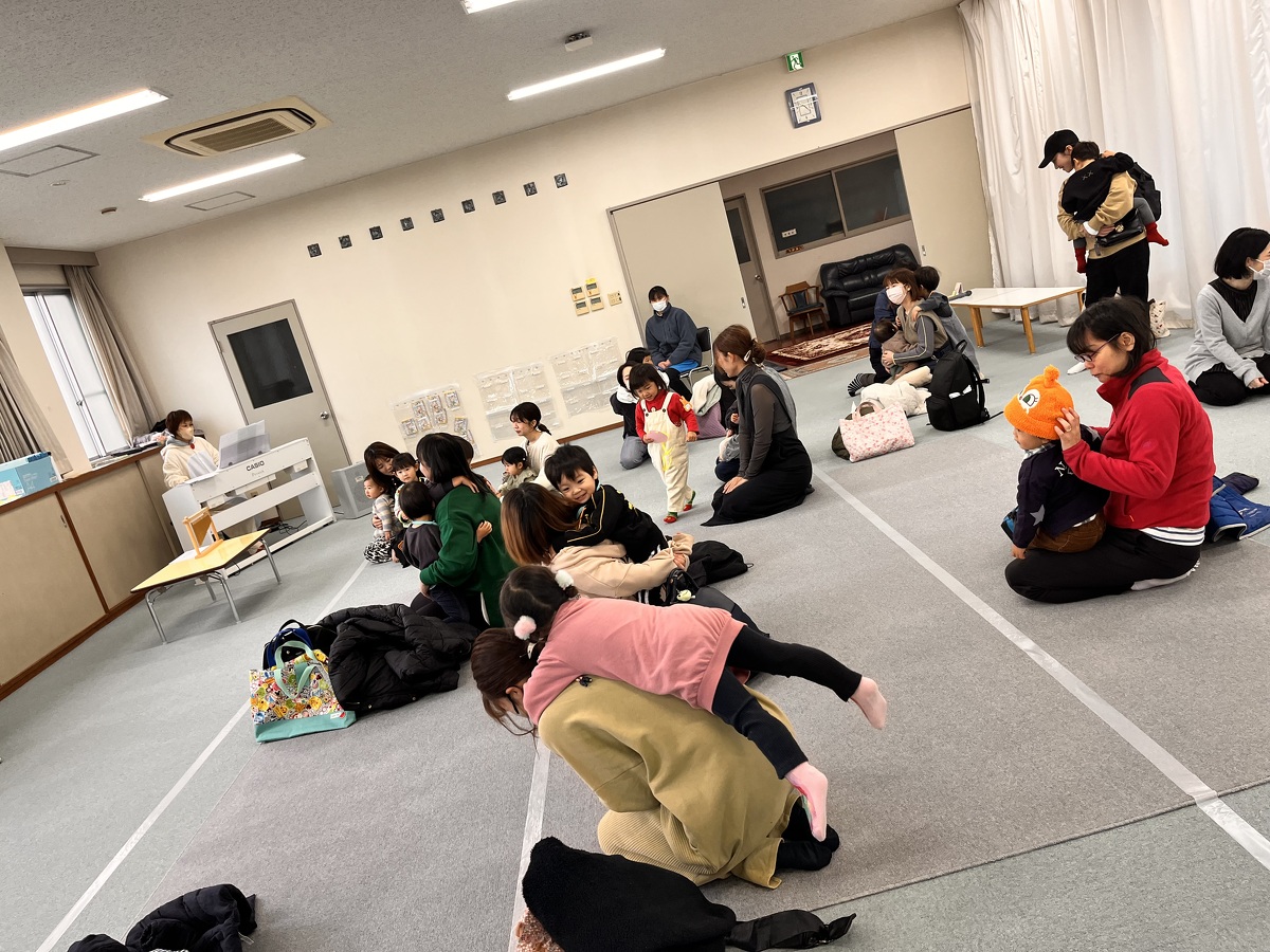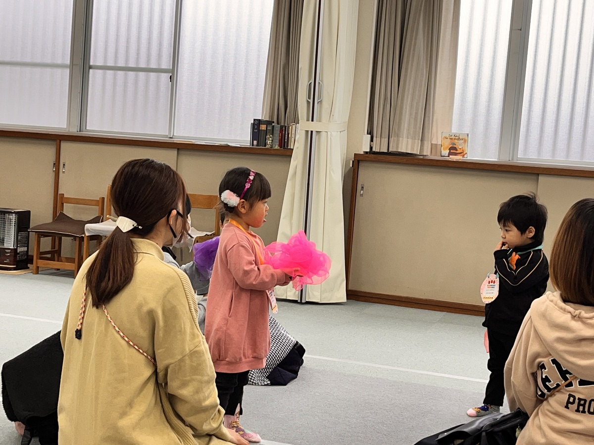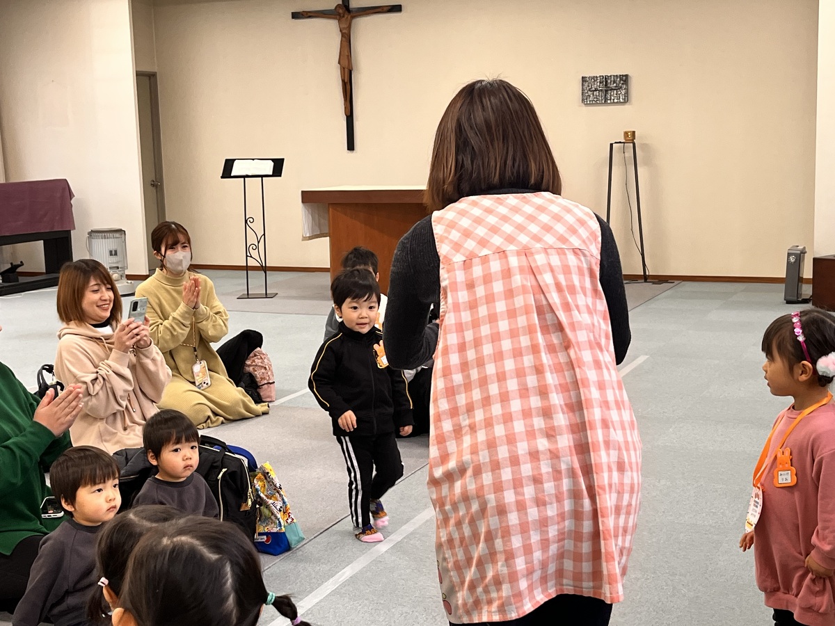 つぼみクラス、プチつぼみクラスの修了式(お楽しみ会)を行いました。まず始めに1月、2月、3月生まれのお友だちのお祝いをしました。みんなでハッピーバースデーの歌を歌って子どもたちも嬉しそうでした。その後は、お楽しみ!ゆうこお姉さんとゆりこお姉さんが遊びに来てくれ、みんなで身体を動かしながら親子でのふれあい遊びを楽しんだり、スカーフて遊んだり、素敵なピアノに合わせての歌はとても感動的でした。楽しい時間をありがとうございました。