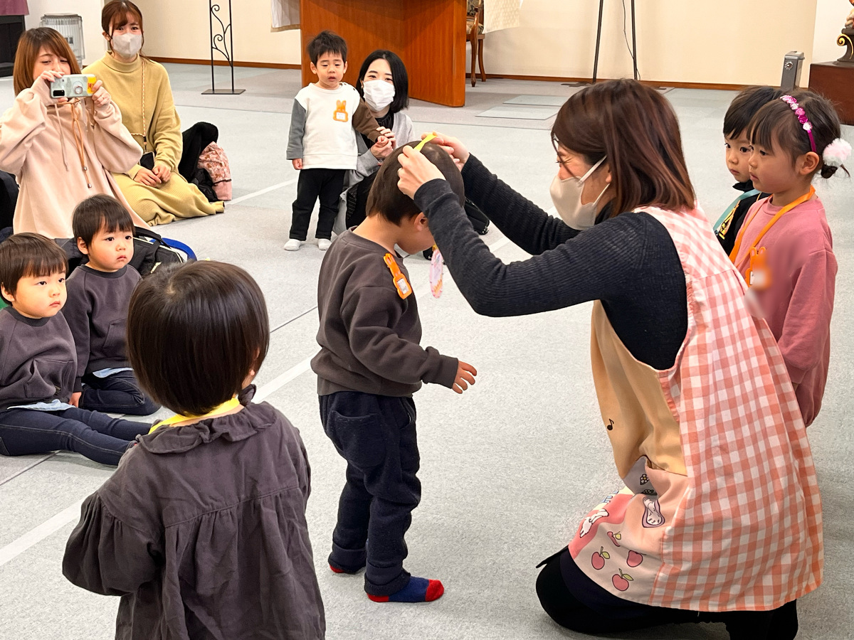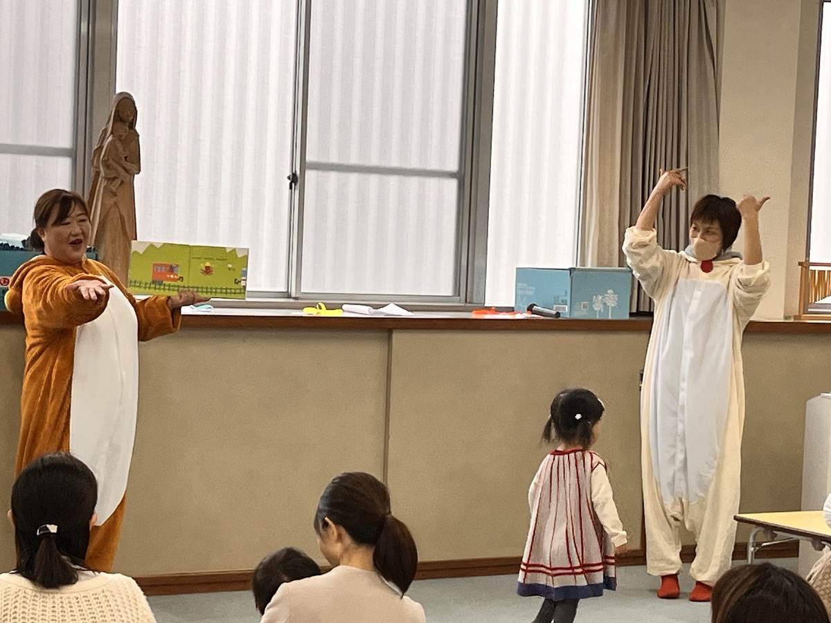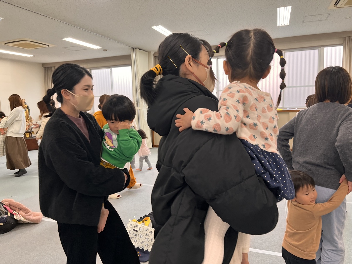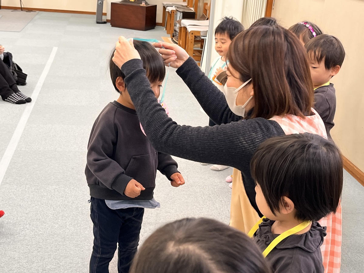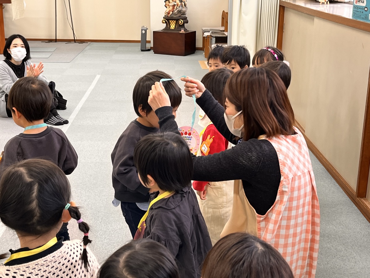 つぼみクラス、プチつぼみクラスの修了式(お楽しみ会)を行いました。まず始めに1月、2月、3月生まれのお友だちのお祝いをしました。みんなでハッピーバースデーの歌を歌って子どもたちも嬉しそうでした。その後は、お楽しみ!ゆうこお姉さんとゆりこお姉さんが遊びに来てくれ、みんなで身体を動かしながら親子でのふれあい遊びを楽しんだり、スカーフて遊んだり、素敵なピアノに合わせての歌はとても感動的でした。楽しい時間をありがとうございました。