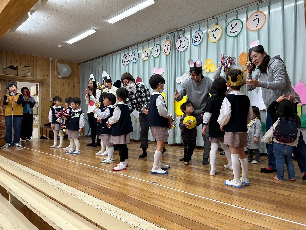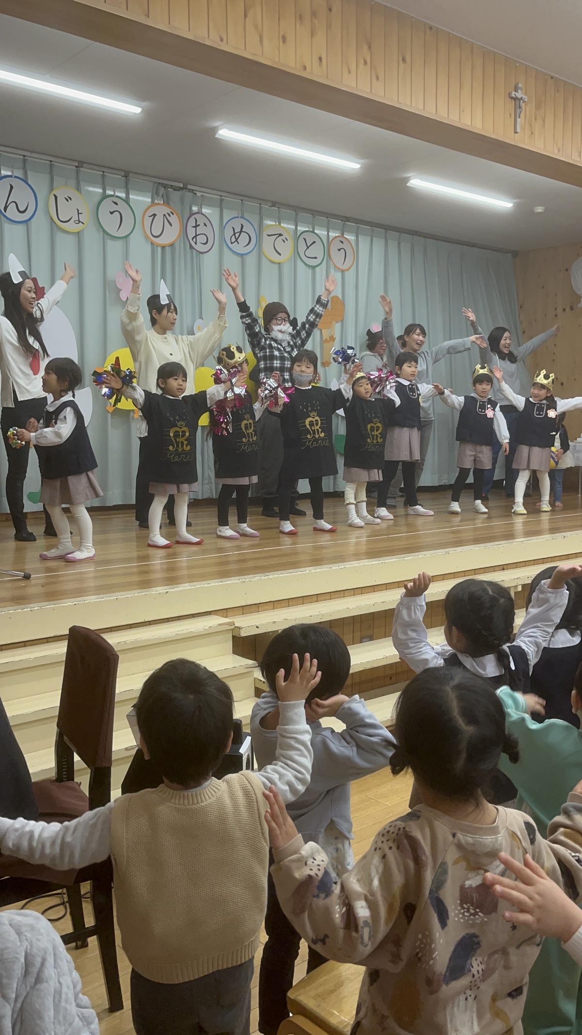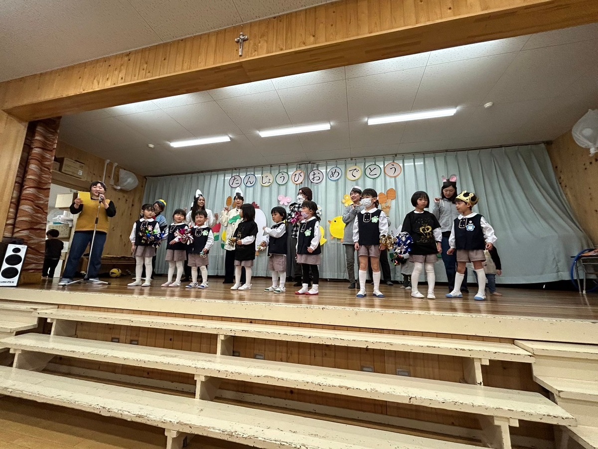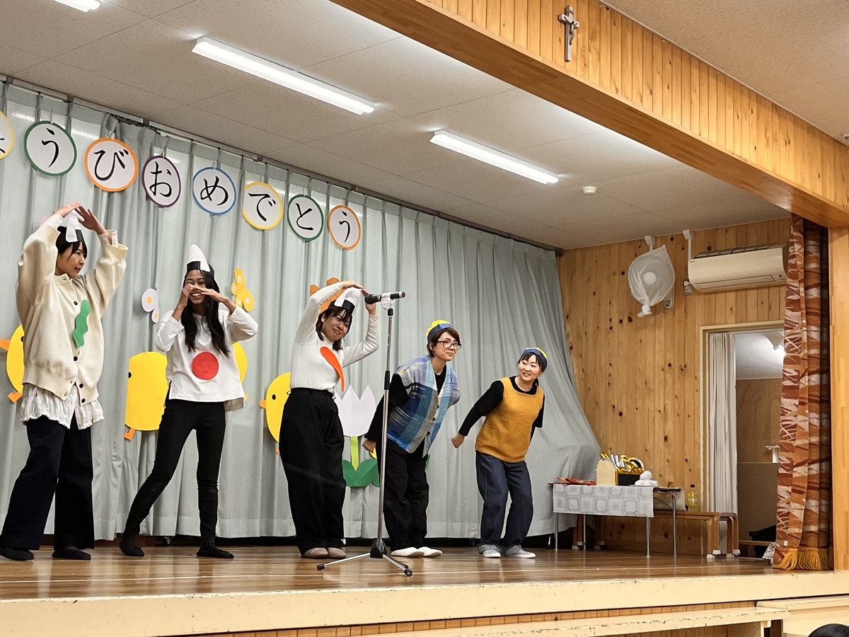 そして、お楽しみはコーラス部の楽しい「おむすびころりん」のお話や、一緒に歌って踊って楽しみました。今回は子どもたちも参加型で大好きなGood Luck体操を一緒に踊り、笑顔いっぱいの子どもたちでした。最後の歌もとても感動しましたね。楽しい時間をありがとうございました。