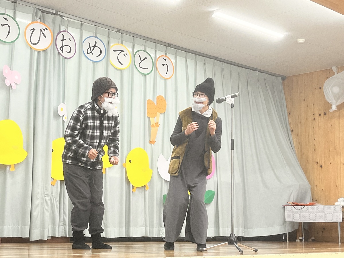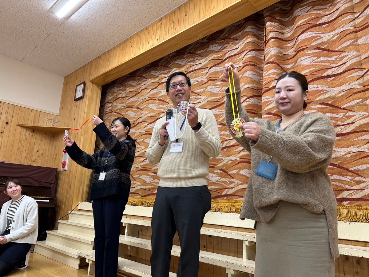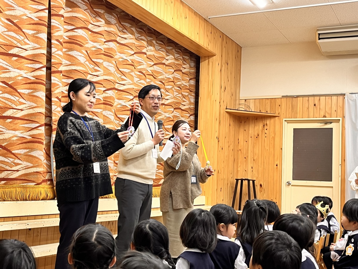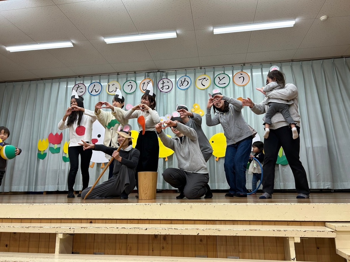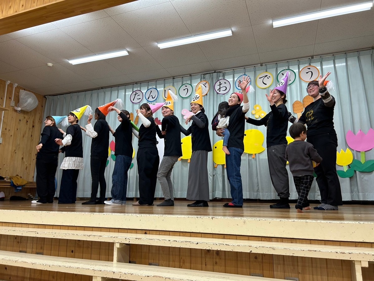 そして、お楽しみはコーラス部の楽しい「おむすびころりん」のお話や、一緒に歌って踊って楽しみました。今回は子どもたちも参加型で大好きなGood Luck体操を一緒に踊り、笑顔いっぱいの子どもたちでした。最後の歌もとても感動しましたね。楽しい時間をありがとうございました。