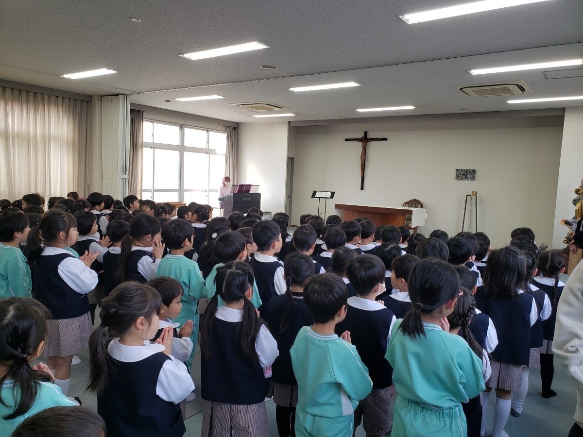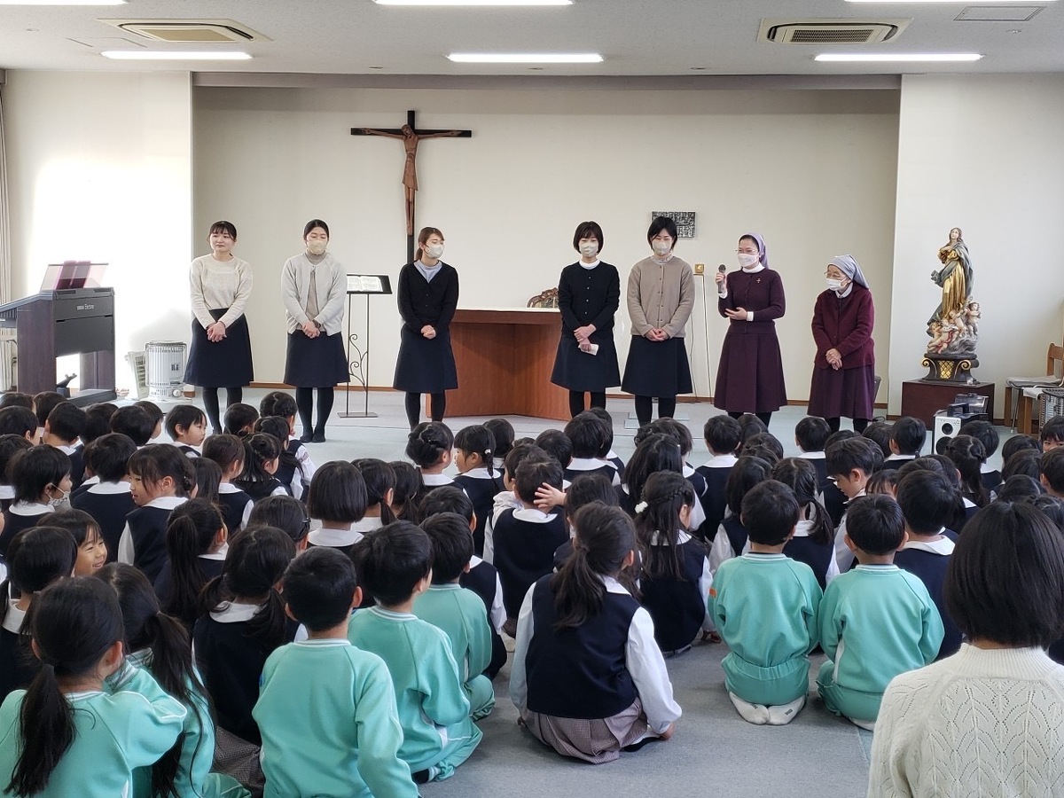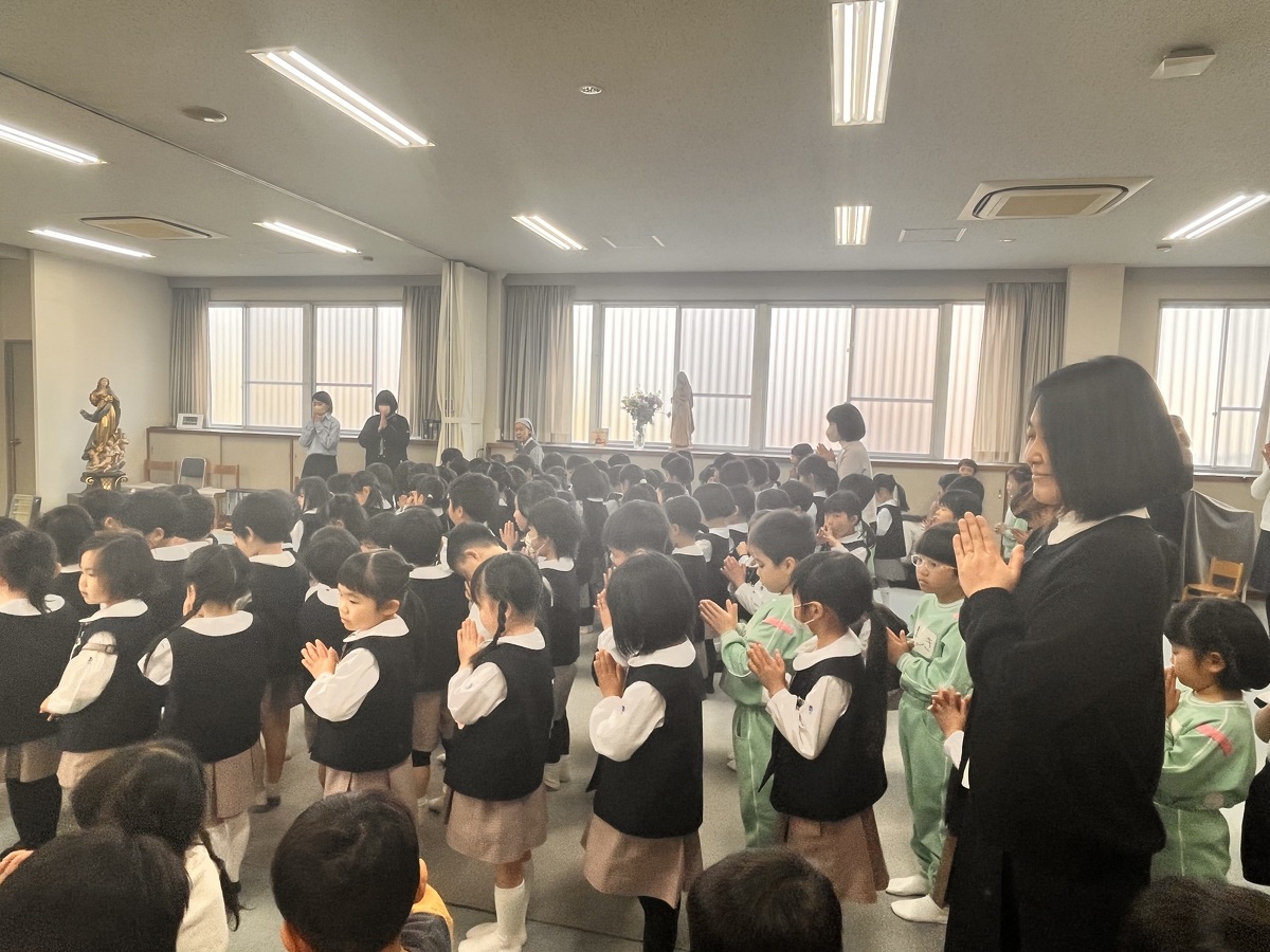 3学期の終業式、離任式を行いました。 2024年03月26日(火) 3学期の終業式、離任式を行いました。1年間、お友だちや先生とたくさんの思い出ができましたね! マリア幼稚園を離れることになったお友だち、先生もそれぞれの場所でいつも神様が見守ってくださるようお祈りしています。 また4月にひとつ大きくなったみなさんに会えるのを楽しみにしています。保護者の皆様、1年間本当にありがとうございました。