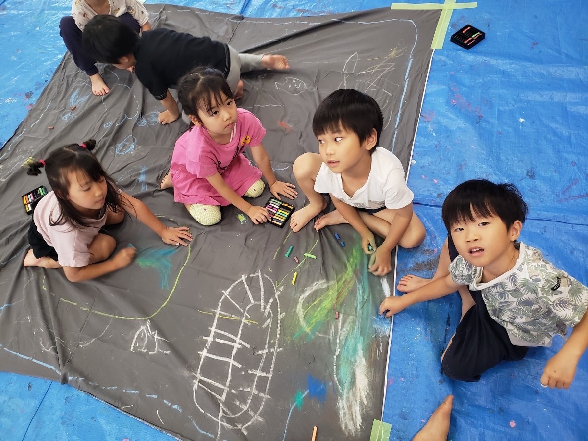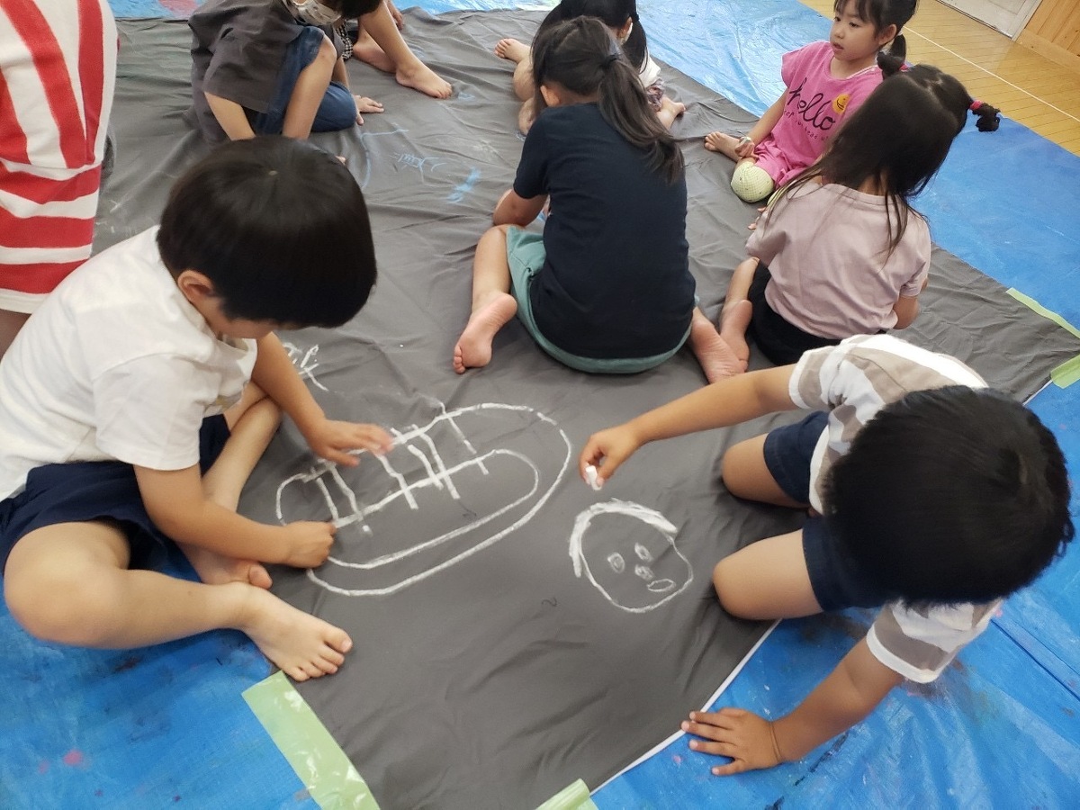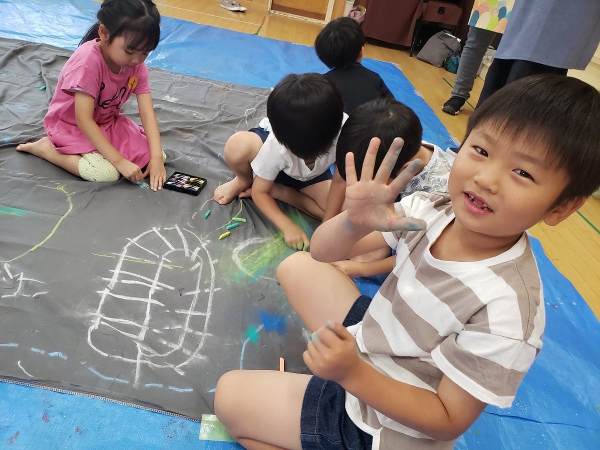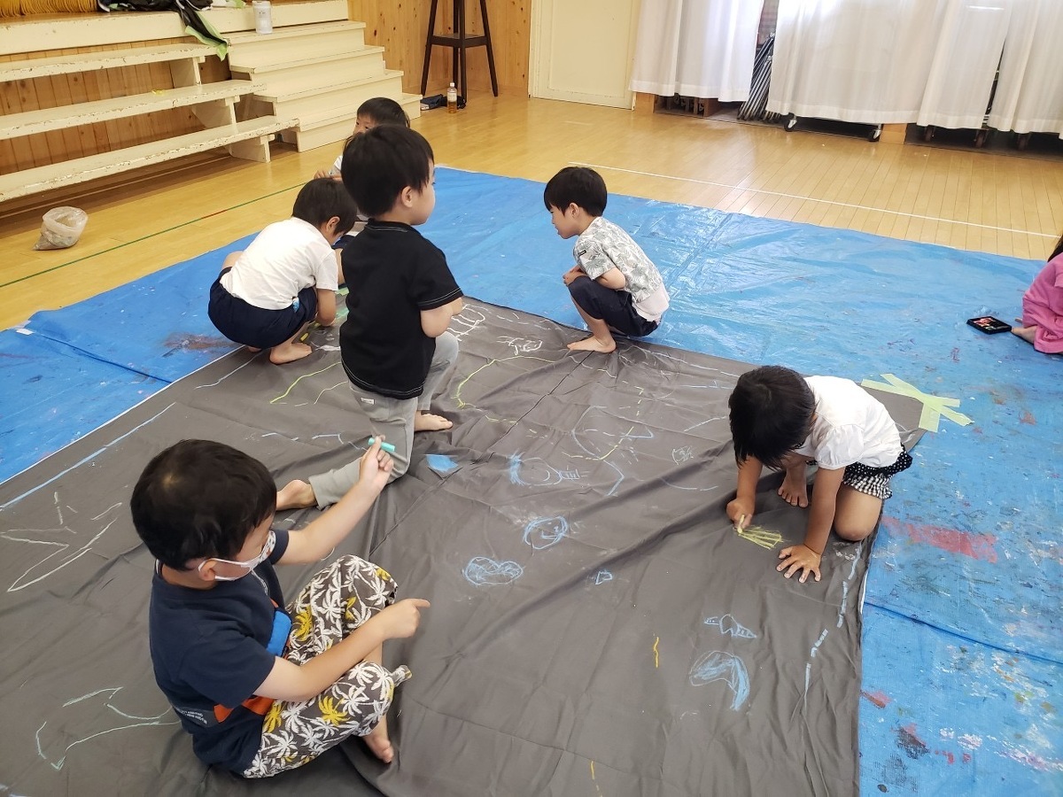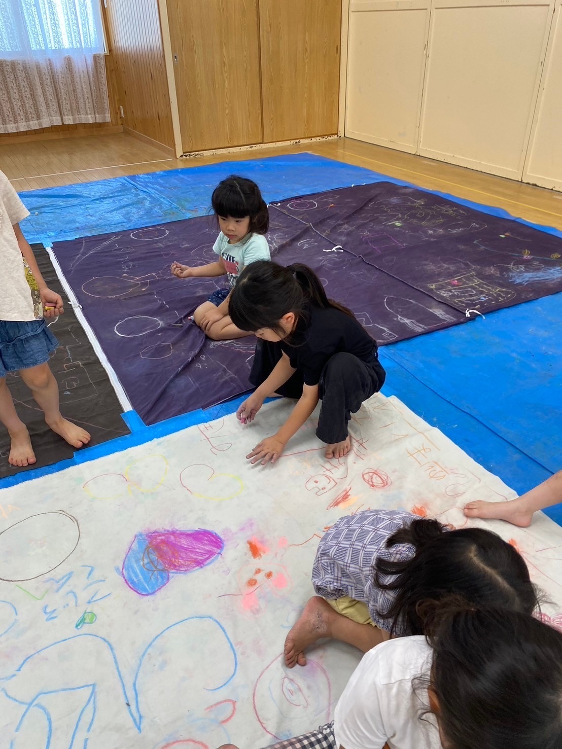 Aグループ(5歳児)のアートの日がありました。 2024年05月24日(金) Aグループ(5歳児)のアートの日がありました。 今回は、チョークとパステルを使って、白い紙ではなく、暗い色の布にお絵描きをしました。子どもたちは、紙に描く時とは違う感触や見え方に気付き、楽しんでいる様子でした♪ 最後には、布を繋げて大きなテントにしました!子どもたちは、中に潜り込んで大盛り上がり!! みきゆき先生、素敵な体験をさせてくださり、ありがとうございました!