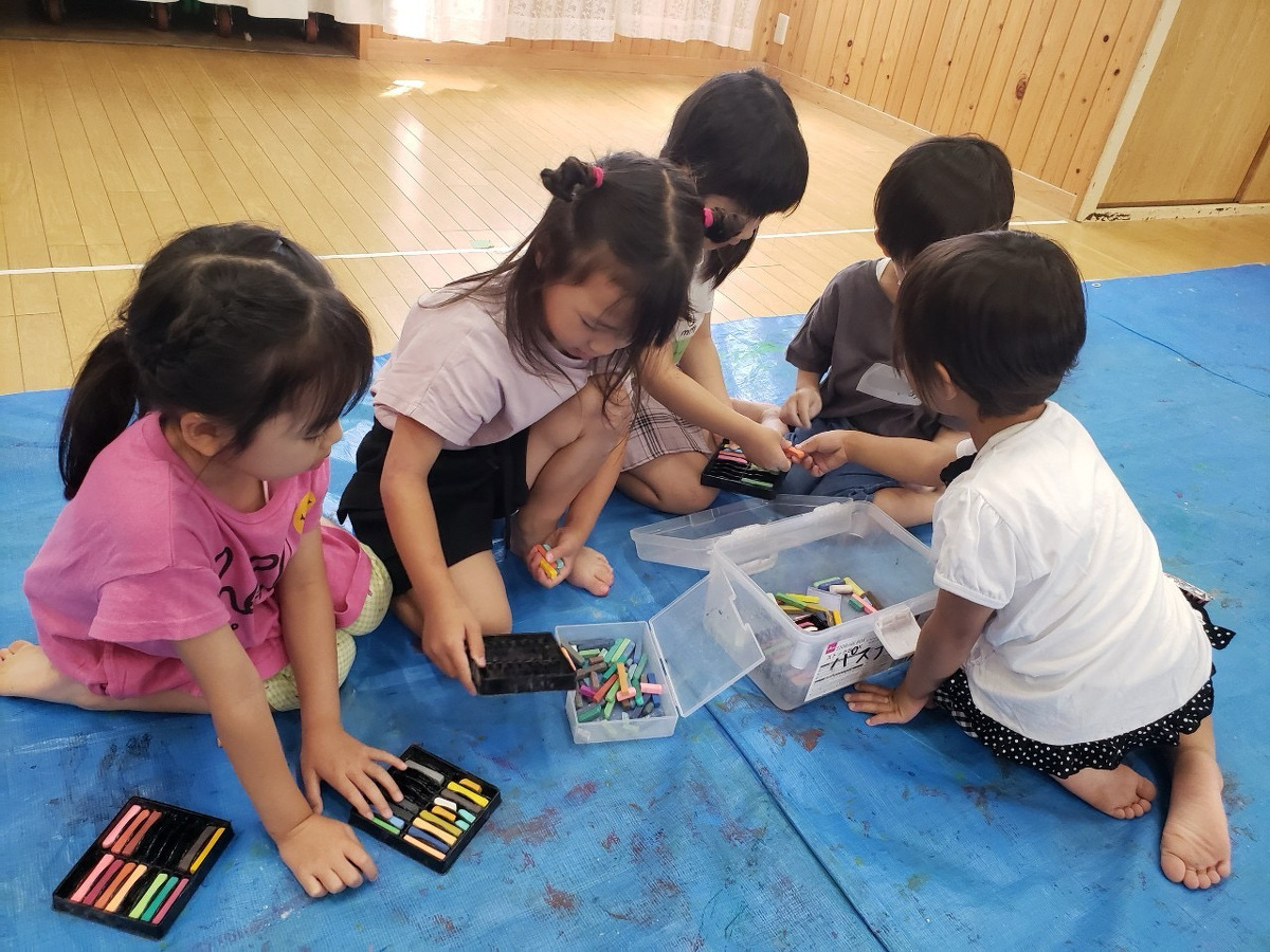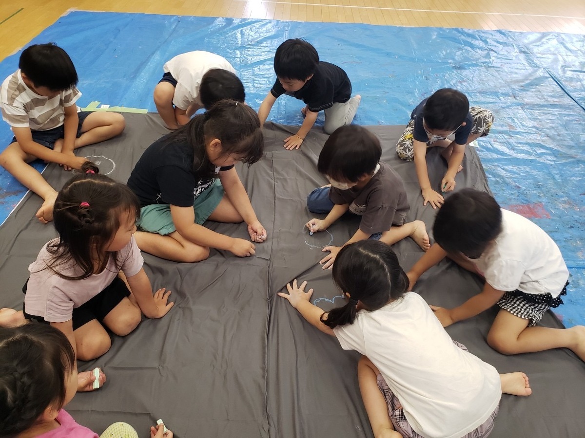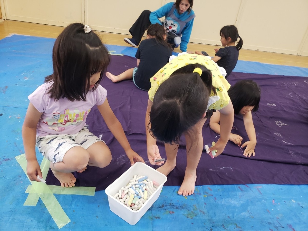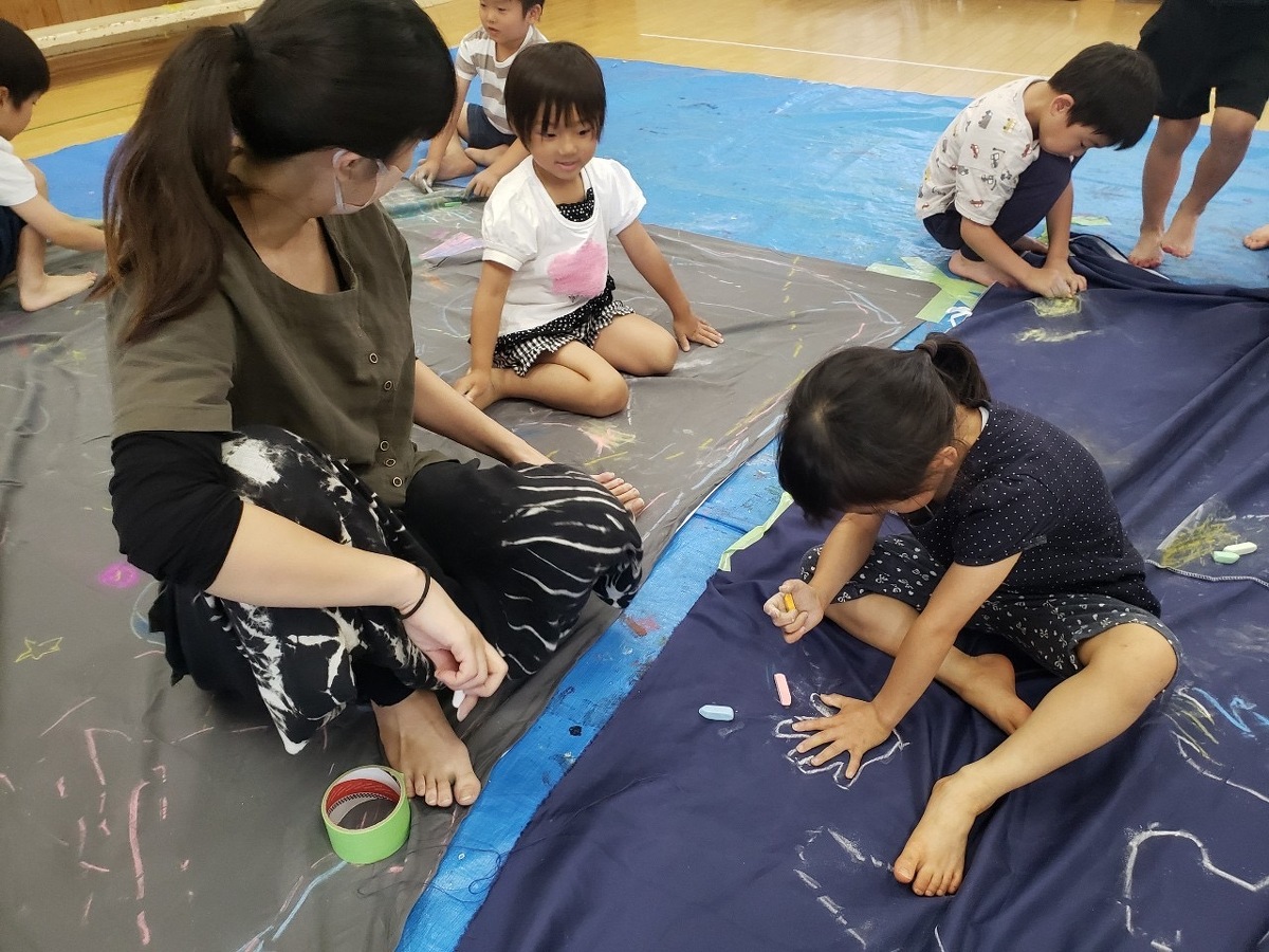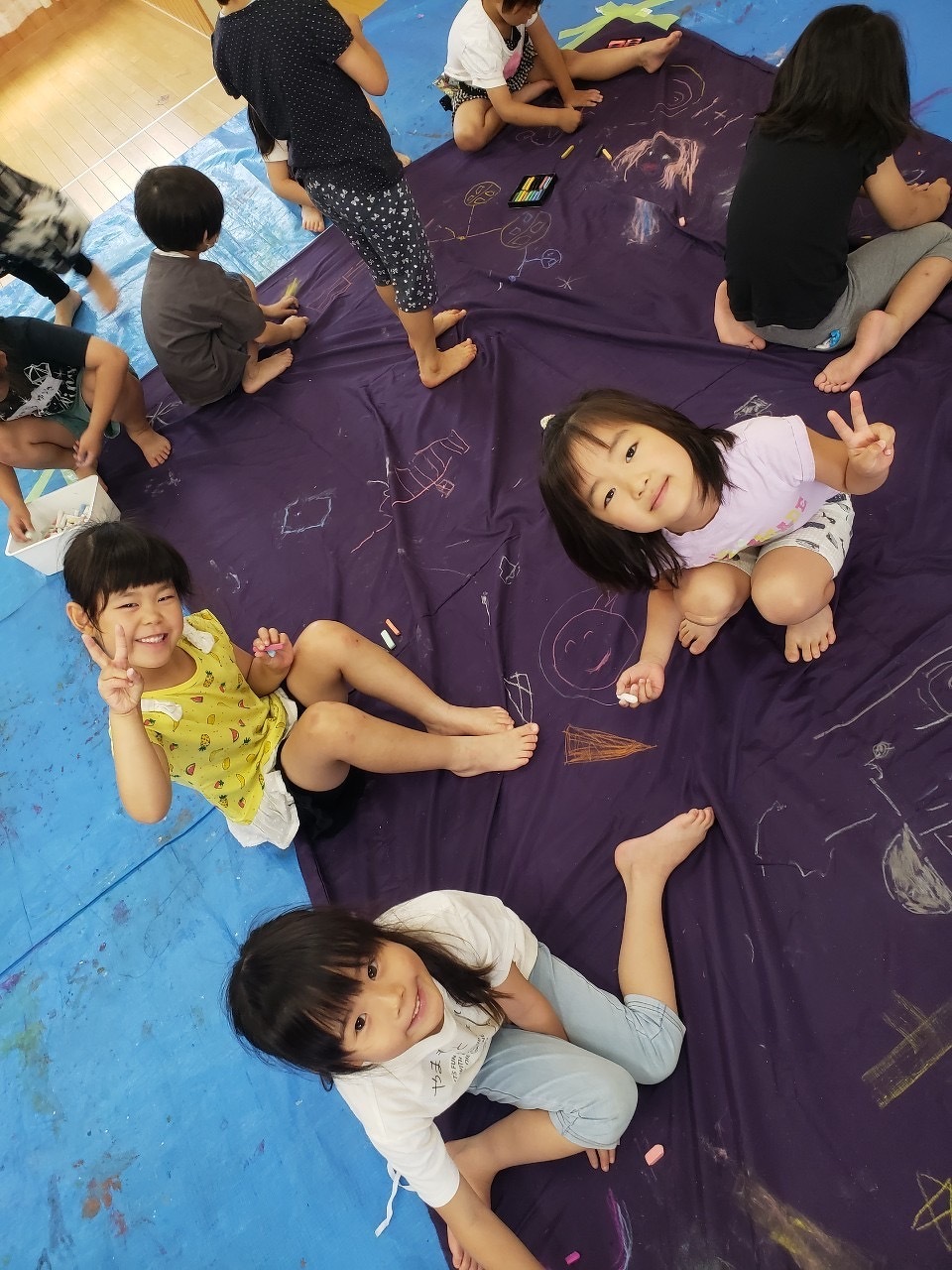 Aグループ(5歳児)のアートの日がありました。 2024年05月24日(金) Aグループ(5歳児)のアートの日がありました。 今回は、チョークとパステルを使って、白い紙ではなく、暗い色の布にお絵描きをしました。子どもたちは、紙に描く時とは違う感触や見え方に気付き、楽しんでいる様子でした♪ 最後には、布を繋げて大きなテントにしました!子どもたちは、中に潜り込んで大盛り上がり!! みきゆき先生、素敵な体験をさせてくださり、ありがとうございました!