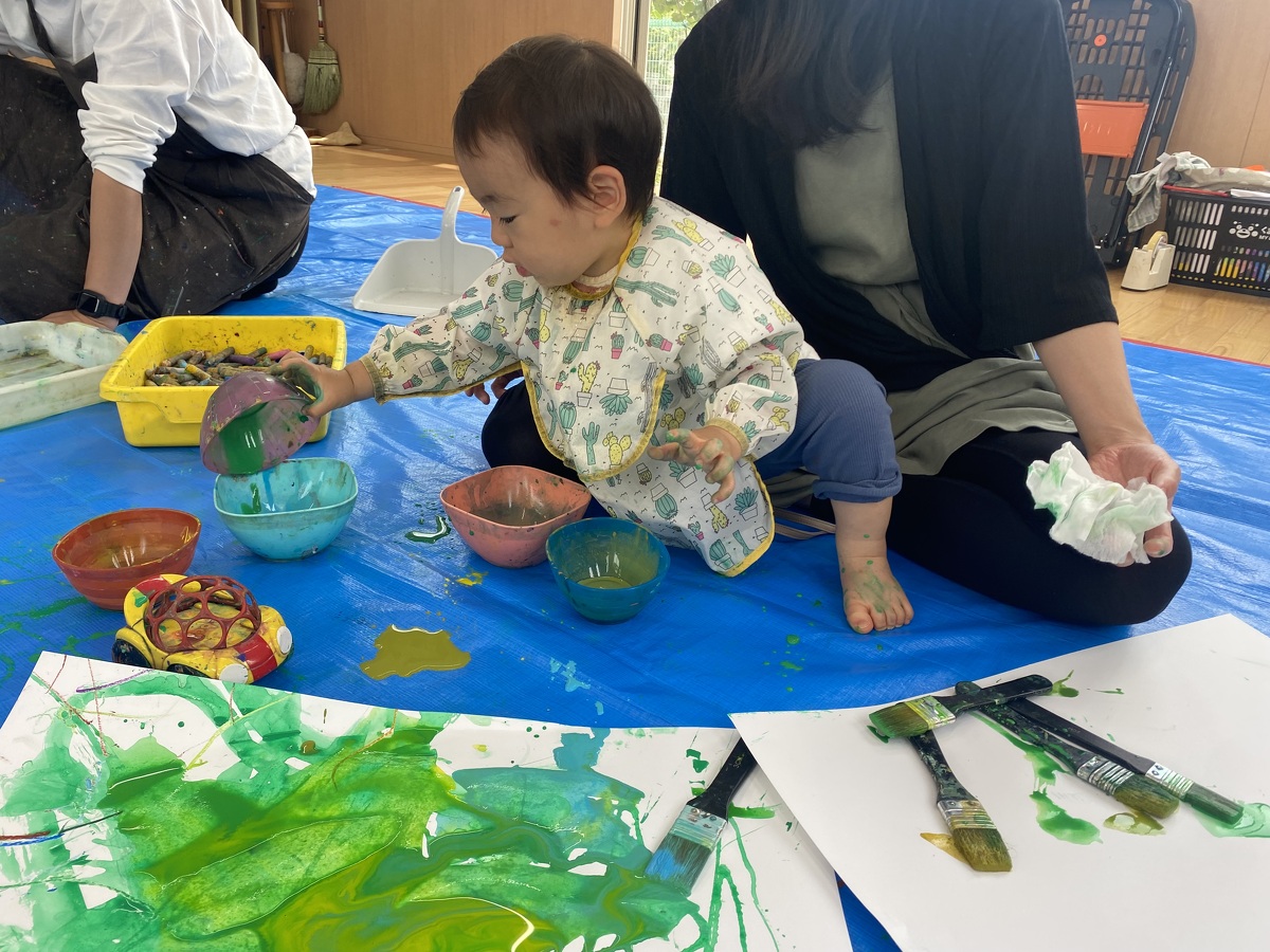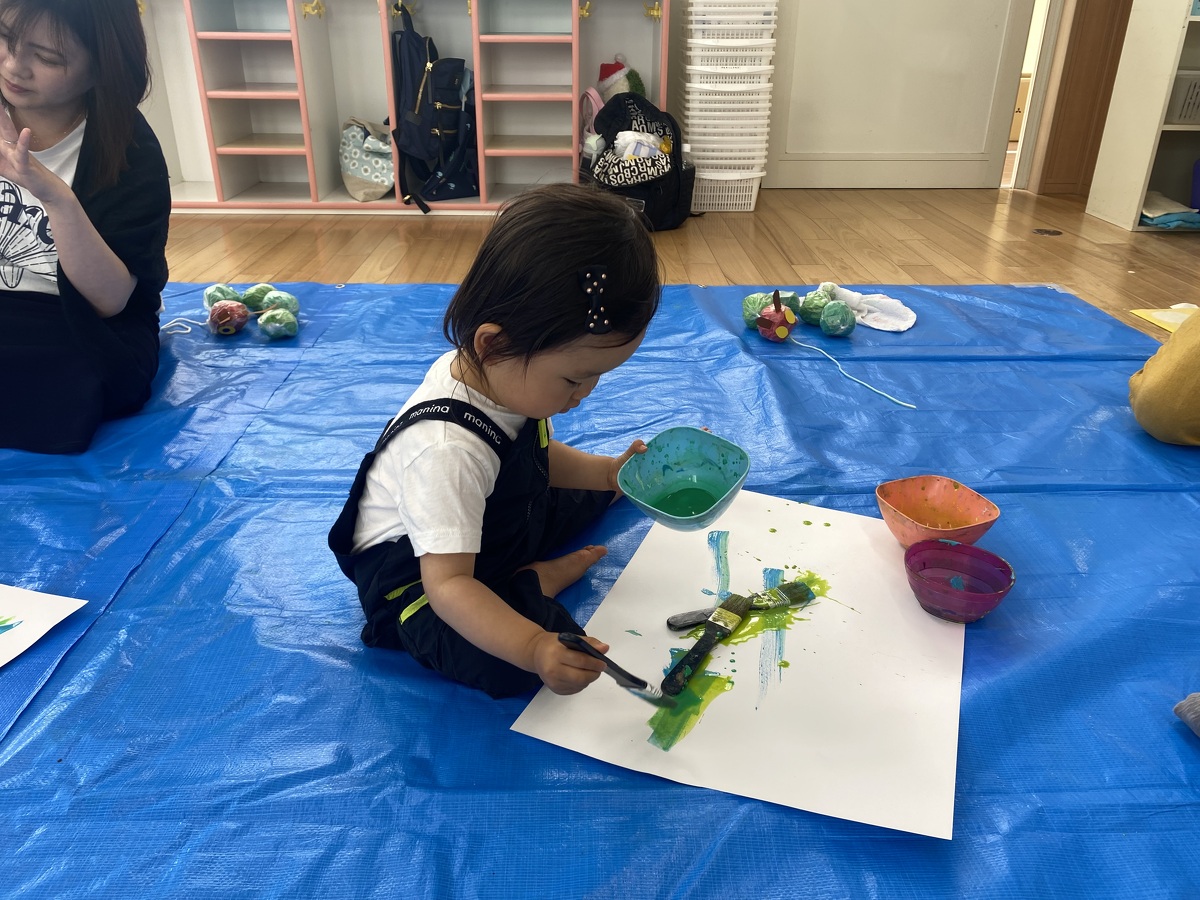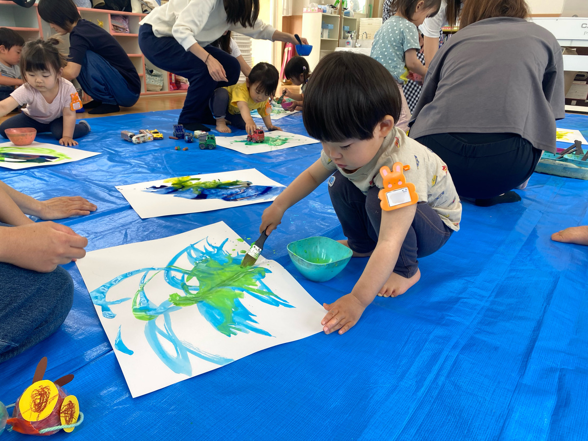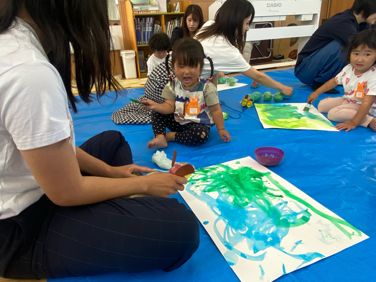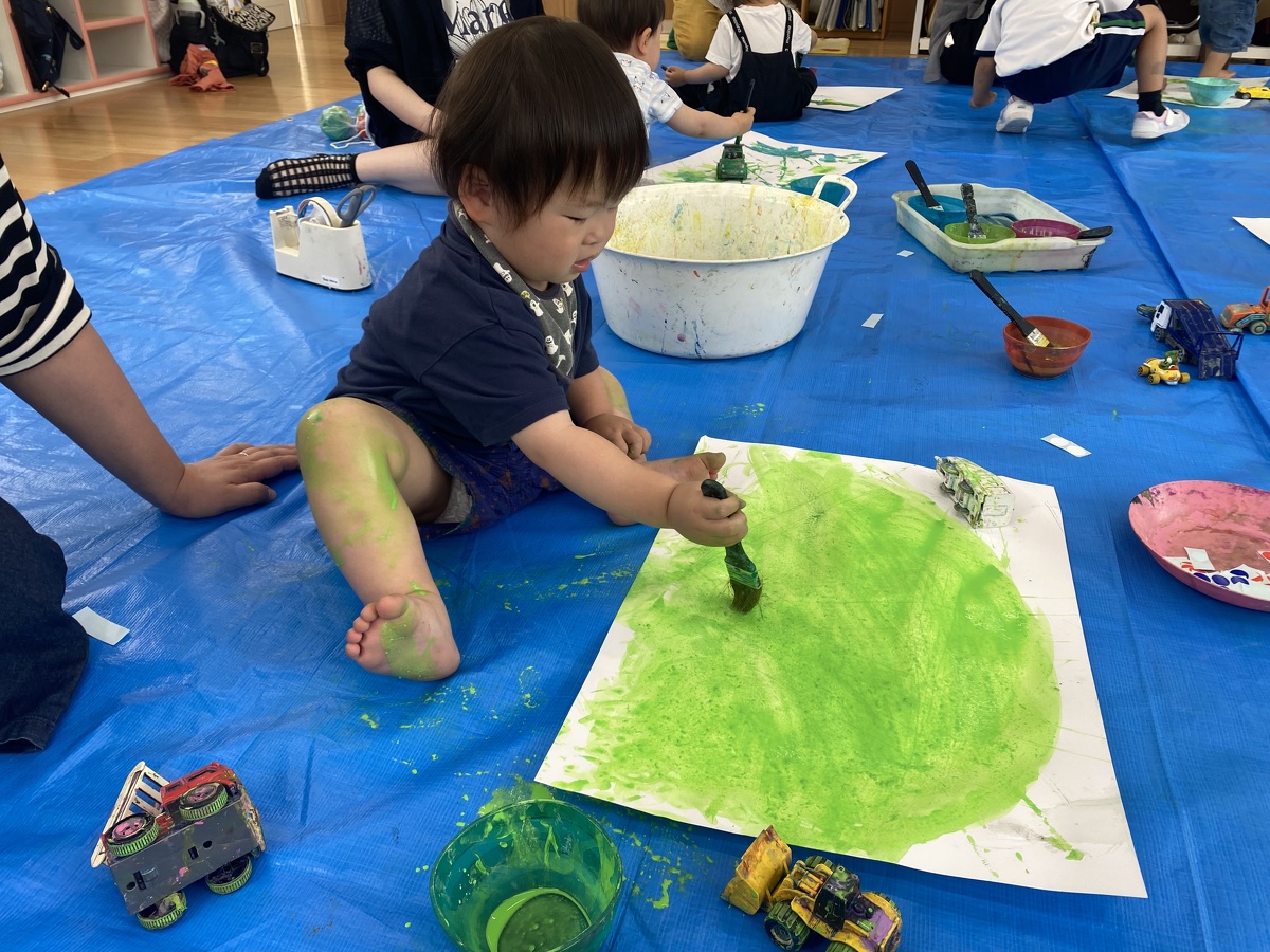 最後は、はらぺこあおむしの大好きな葉っぱを絵の具でお絵描きしました。色を混ぜたり、電車のおもちゃを使って描いたり楽しかったですね♪