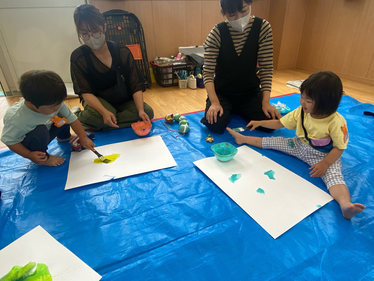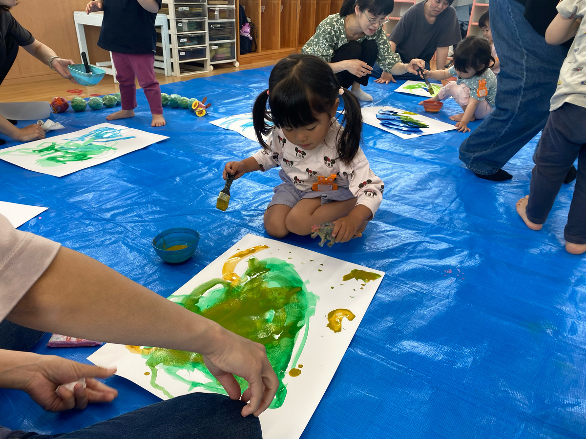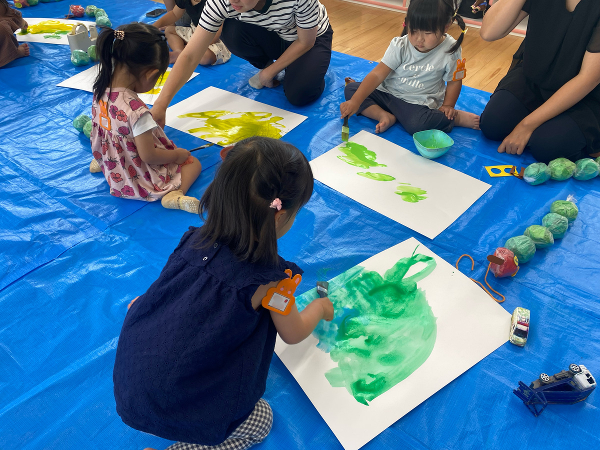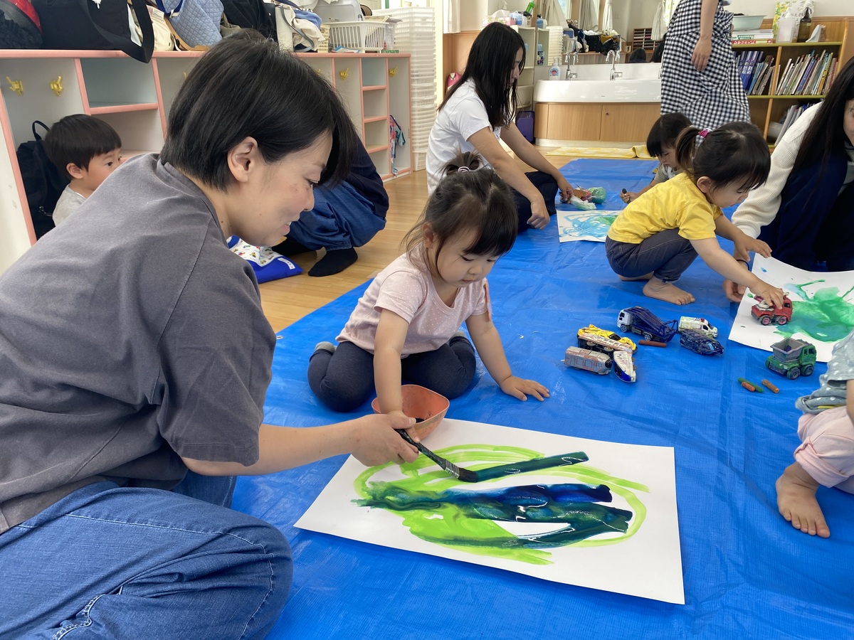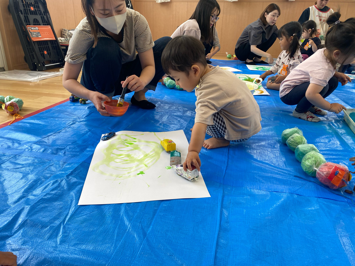 最後は、はらぺこあおむしの大好きな葉っぱを絵の具でお絵描きしました。色を混ぜたり、電車のおもちゃを使って描いたり楽しかったですね♪