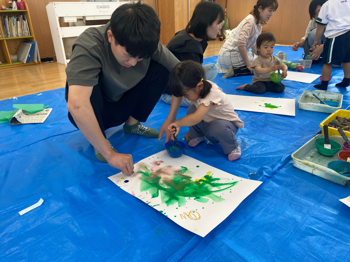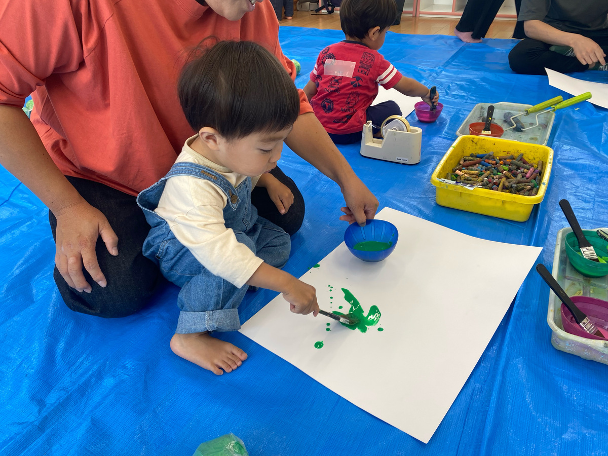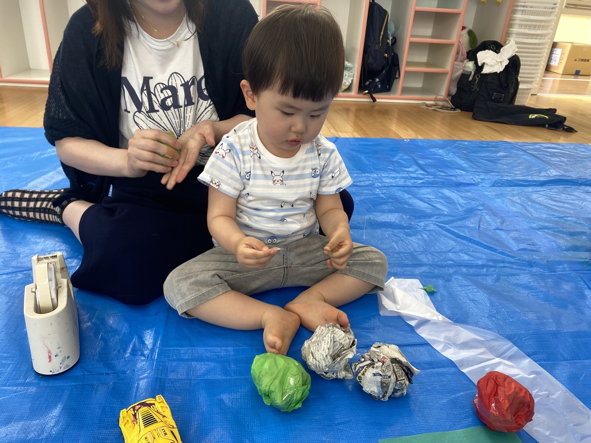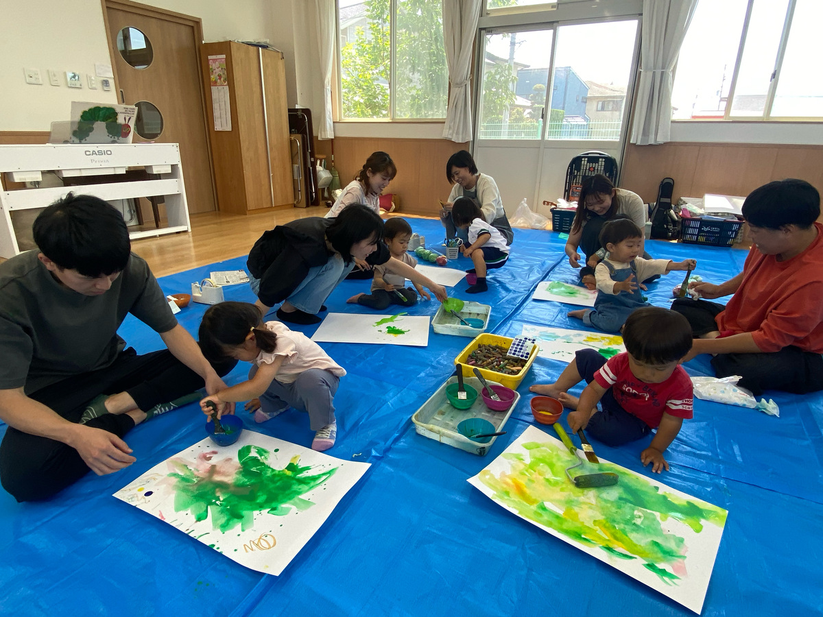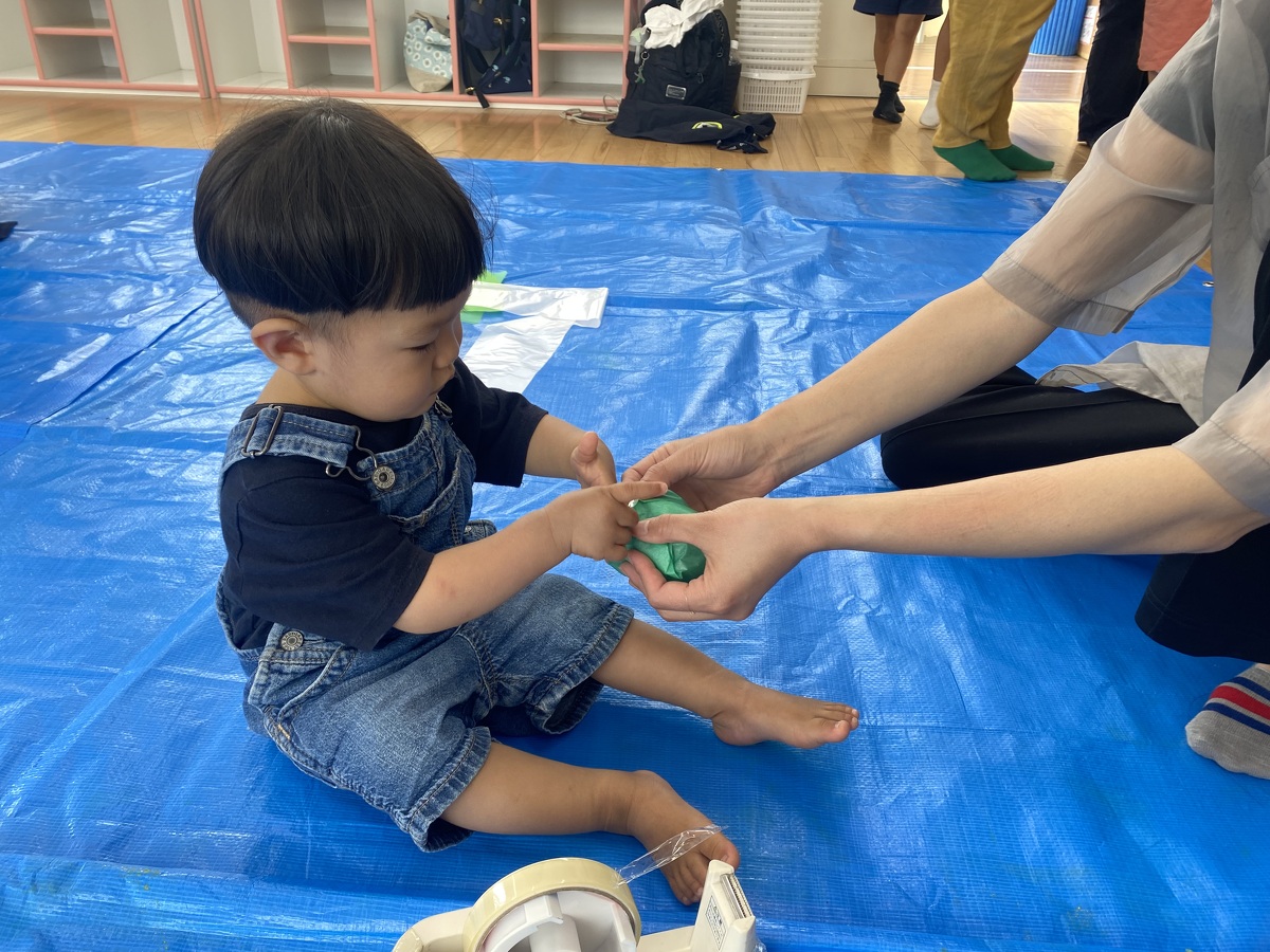 最後は、はらぺこあおむしの大好きな葉っぱを絵の具でお絵描きしました。色を混ぜたり、電車のおもちゃを使って描いたり楽しかったですね♪