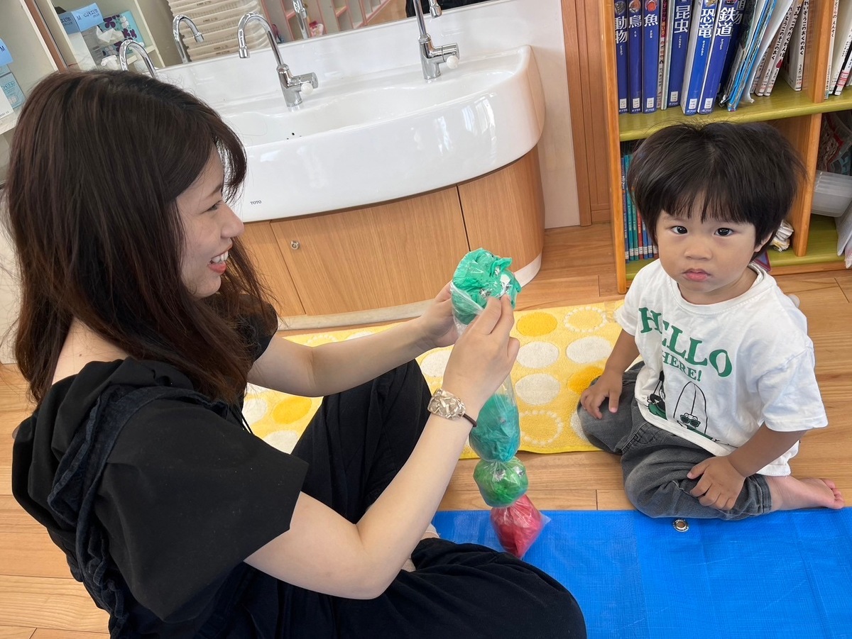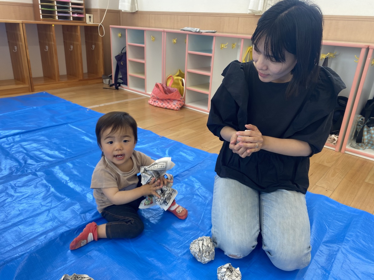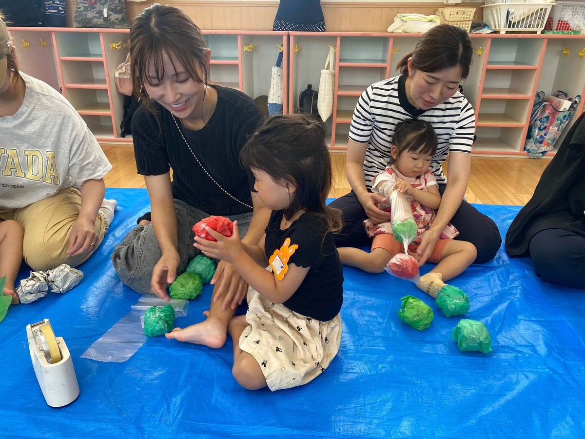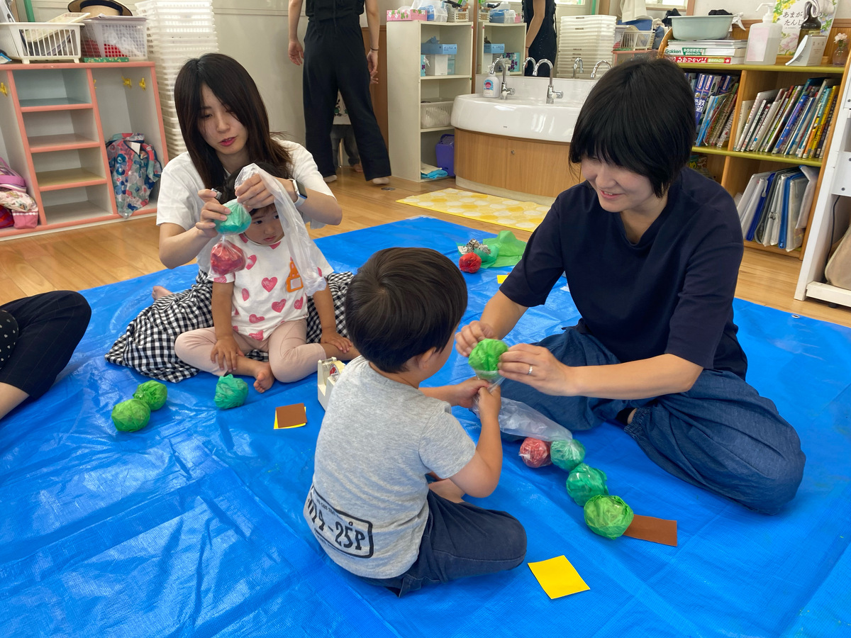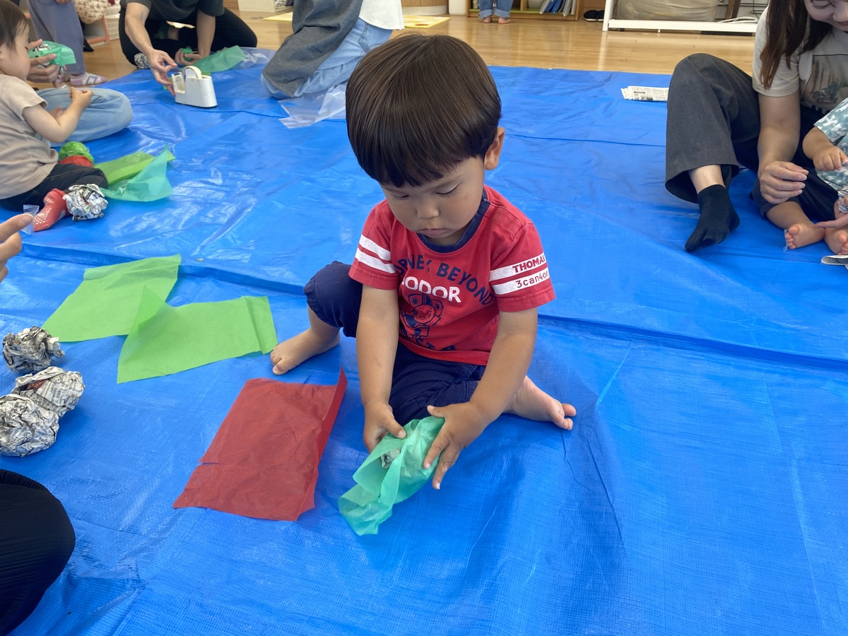 最後は、はらぺこあおむしの大好きな葉っぱを絵の具でお絵描きしました。色を混ぜたり、電車のおもちゃを使って描いたり楽しかったですね♪