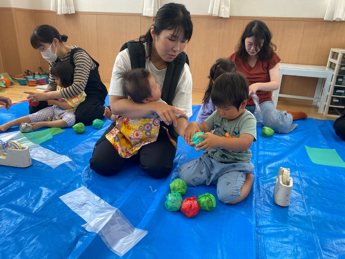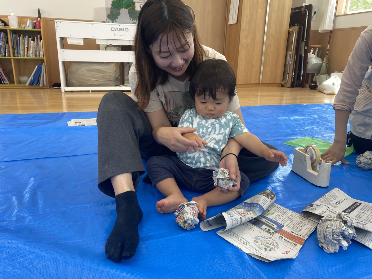次は後藤先生と一緒に「はらぺこあおむし」の製作をしました。新聞紙を丸めたり、クレパスで目を描いたりと、おうちの人と協力して可愛いはらぺこあおむしを作りました!