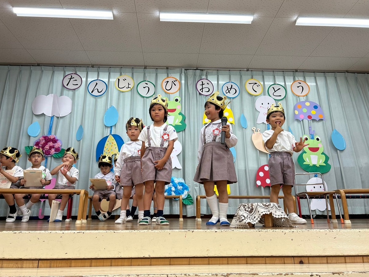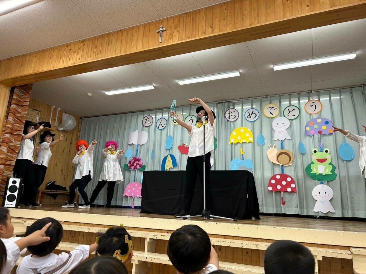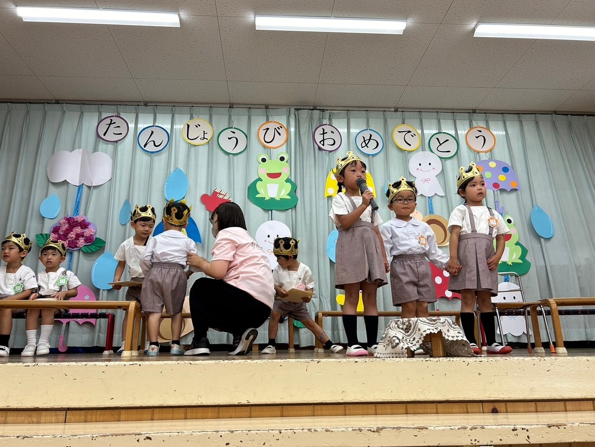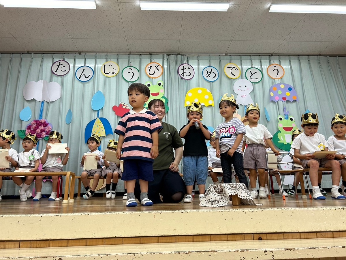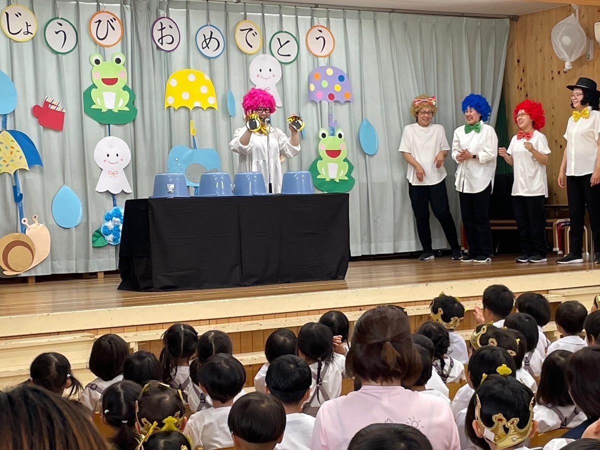 6月生まれの誕生日会がありました。 2024年06月21日(金) 6月生まれの誕生日会がありました。今月はたくさんのお友だちがいましたが、みんなそれぞれ頑張って発表することができました。 今月の折り紙は、うちわをいただきました。暑くなってきたこの時期にぴったりですね!お誕生日係の保護者の皆様、ありがとうございました。 お楽しみは、マジックショーでした!物が浮いたり、ティッシュが本物のうどんになったり、白雪姫が飛び出てきたり・・・!たくさん不思議なことが起こってびっくりでしたね!最後には、みんな大好きあの曲を一緒に踊って楽しかったですね♪