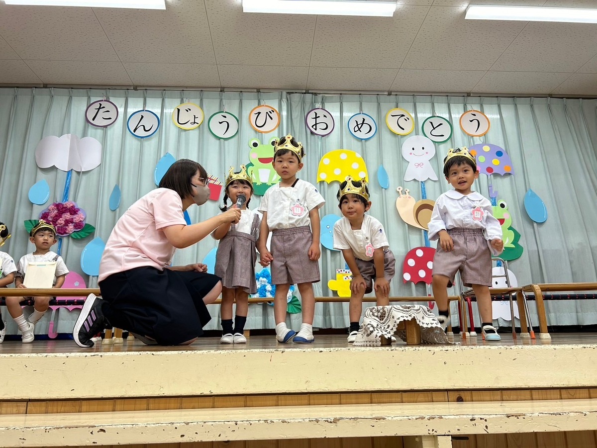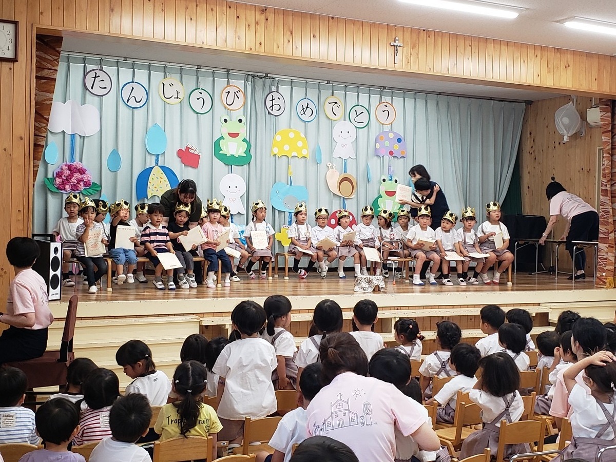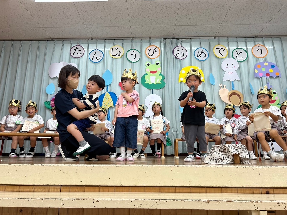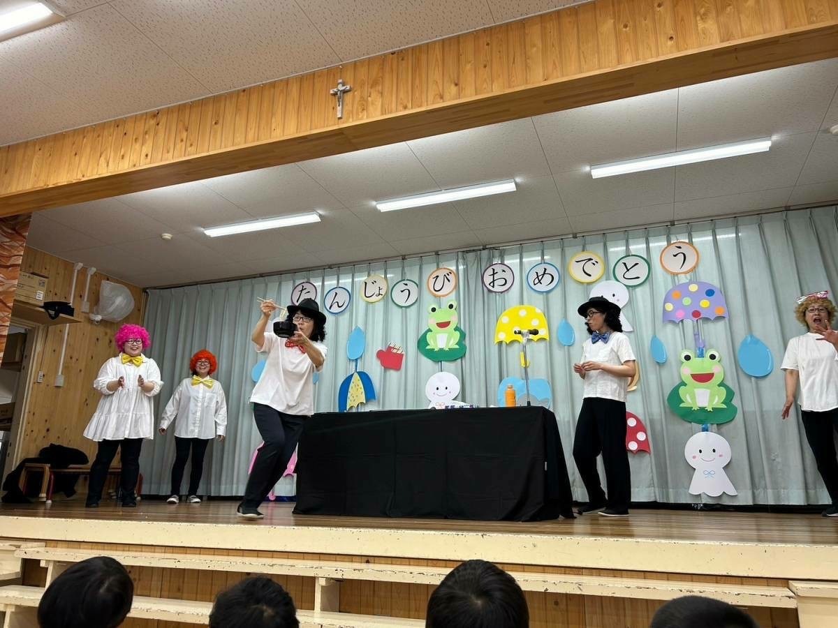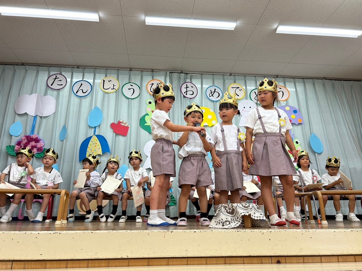 6月生まれの誕生日会がありました。 2024年06月21日(金) 6月生まれの誕生日会がありました。今月はたくさんのお友だちがいましたが、みんなそれぞれ頑張って発表することができました。 今月の折り紙は、うちわをいただきました。暑くなってきたこの時期にぴったりですね!お誕生日係の保護者の皆様、ありがとうございました。 お楽しみは、マジックショーでした!物が浮いたり、ティッシュが本物のうどんになったり、白雪姫が飛び出てきたり・・・!たくさん不思議なことが起こってびっくりでしたね!最後には、みんな大好きあの曲を一緒に踊って楽しかったですね♪