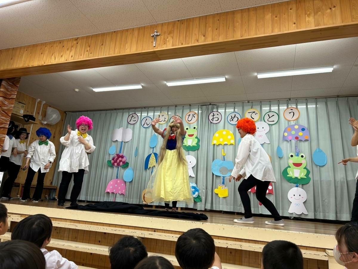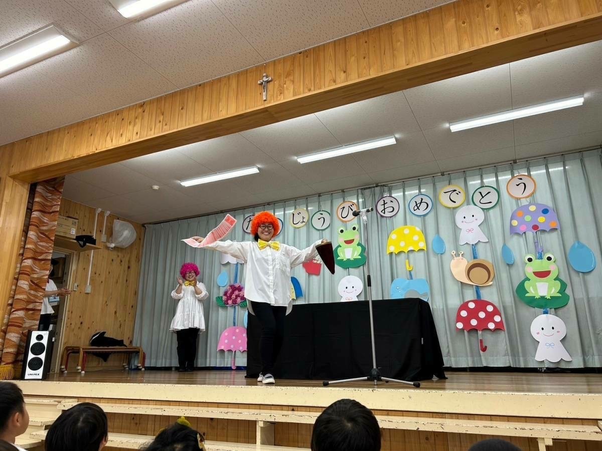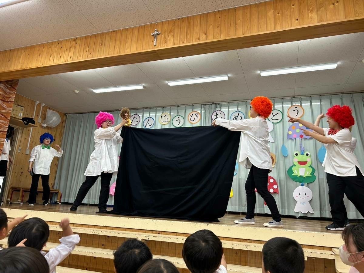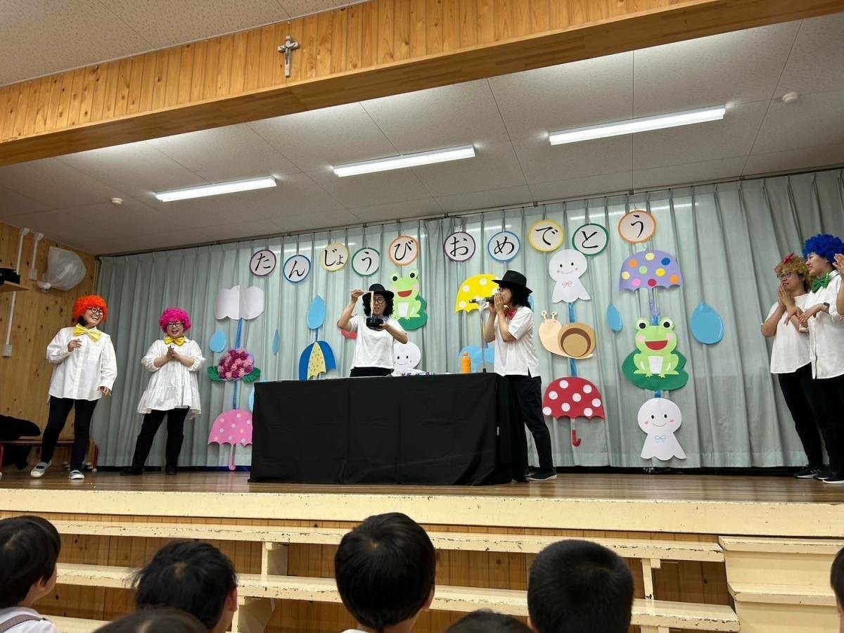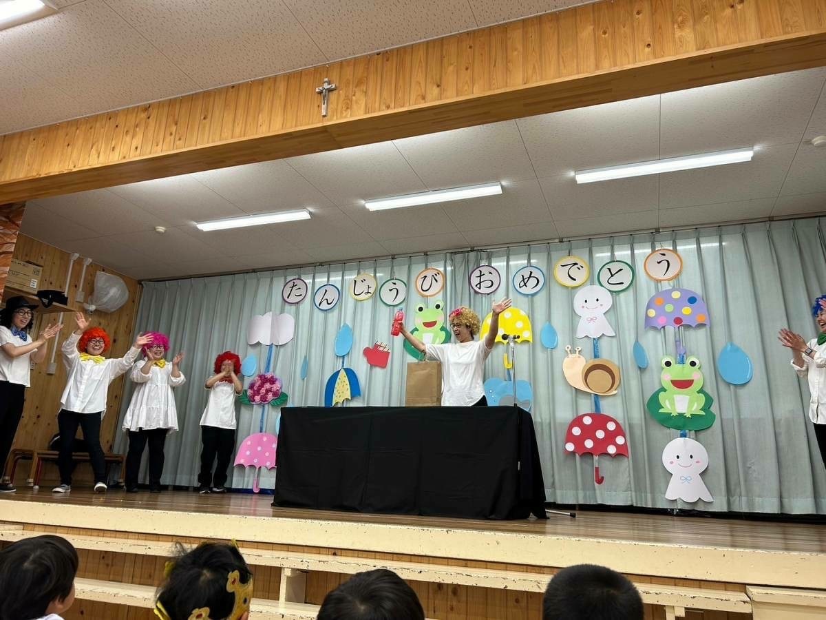 6月生まれの誕生日会がありました。 2024年06月21日(金) 6月生まれの誕生日会がありました。今月はたくさんのお友だちがいましたが、みんなそれぞれ頑張って発表することができました。 今月の折り紙は、うちわをいただきました。暑くなってきたこの時期にぴったりですね!お誕生日係の保護者の皆様、ありがとうございました。 お楽しみは、マジックショーでした!物が浮いたり、ティッシュが本物のうどんになったり、白雪姫が飛び出てきたり・・・!たくさん不思議なことが起こってびっくりでしたね!最後には、みんな大好きあの曲を一緒に踊って楽しかったですね♪